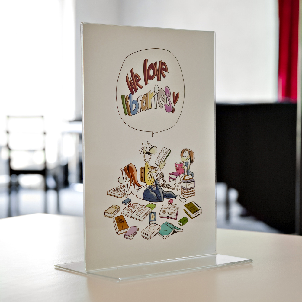 Praktische dubbelzijdige standaards voor informatiefolders e.a op een tafel, balie, kasten, vitrines etc..