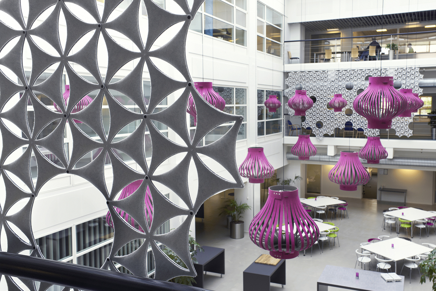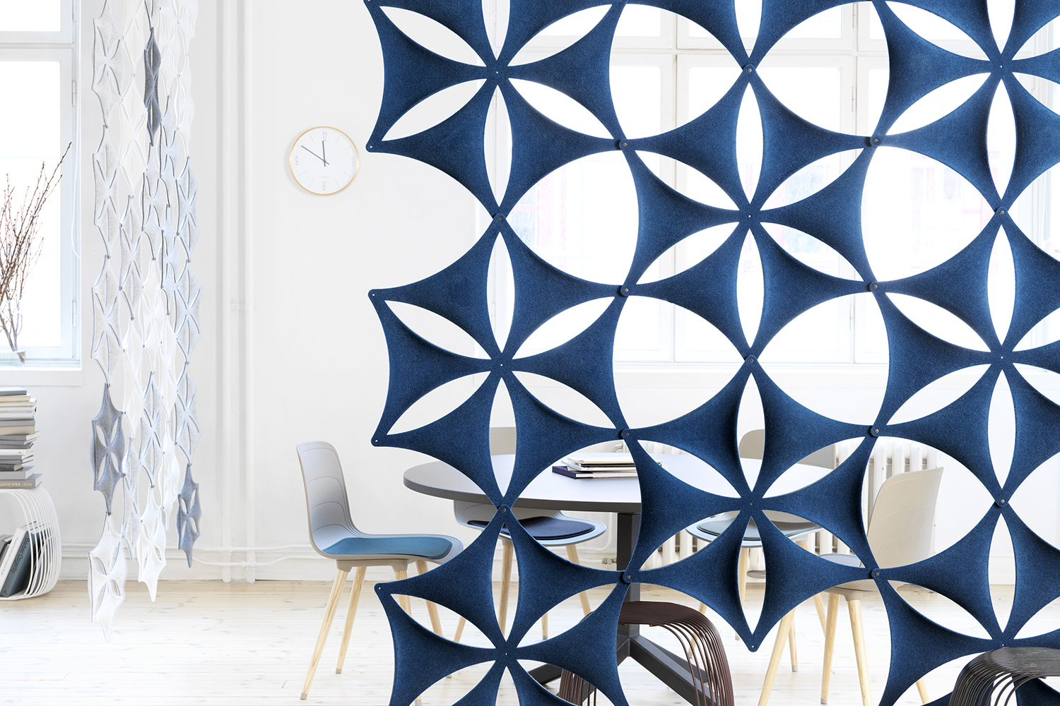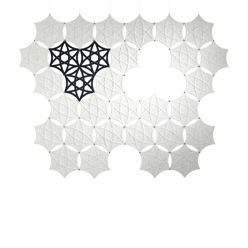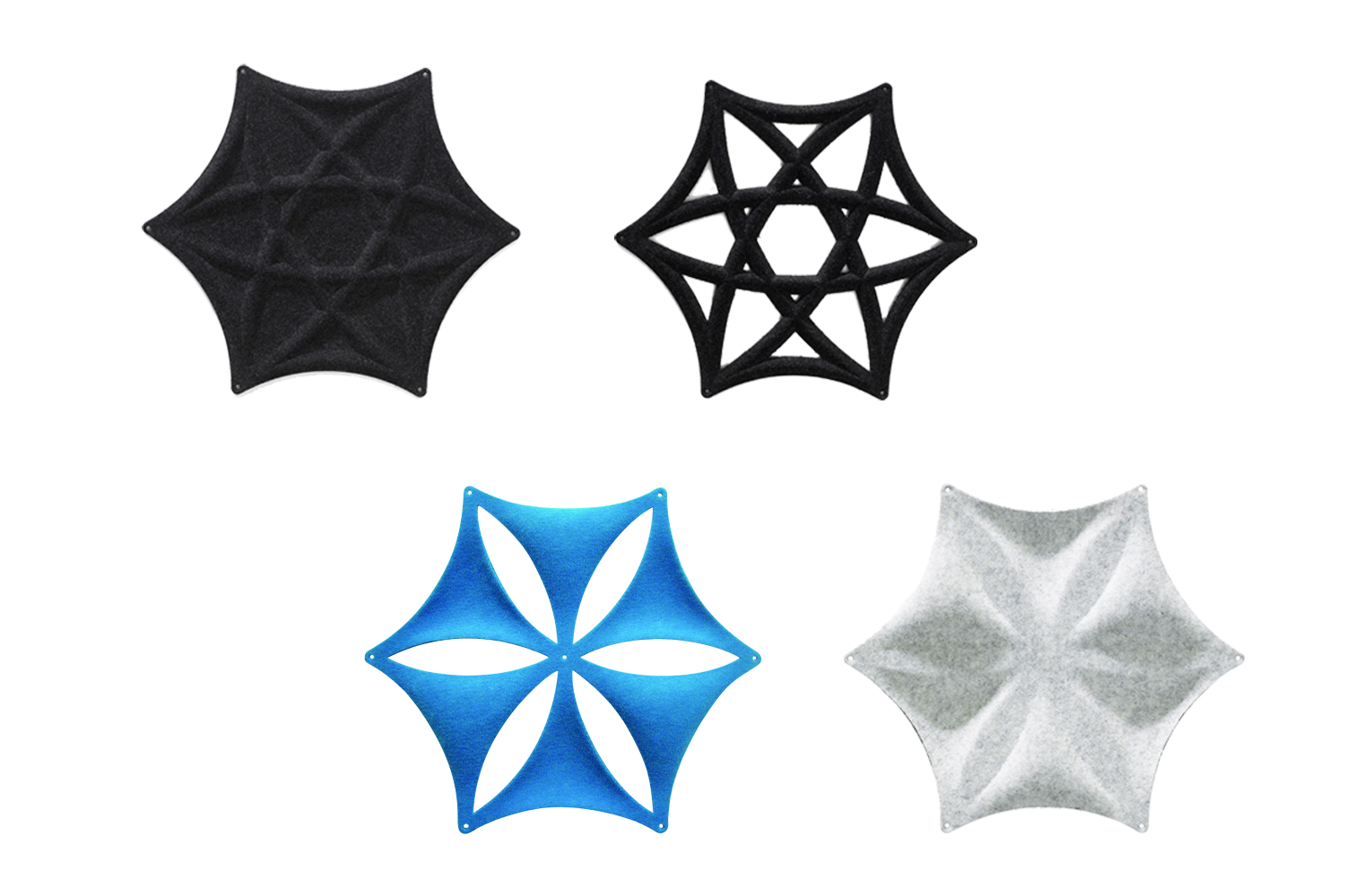 Geluidsdempend scherm vervaardigd uit vilt. Elke module is een hexagoon en beschikbaar in verschillende patronen en kleuren. Het is een eenvoudig, flexibel systeem waar je zelf geometrische patronen mee kan vormen. Airflake wordt bevestigd aan een aluminium rail voor wand of plafondmontage. Het kan ook rechtstreeks aan de muur bevestigd worden.