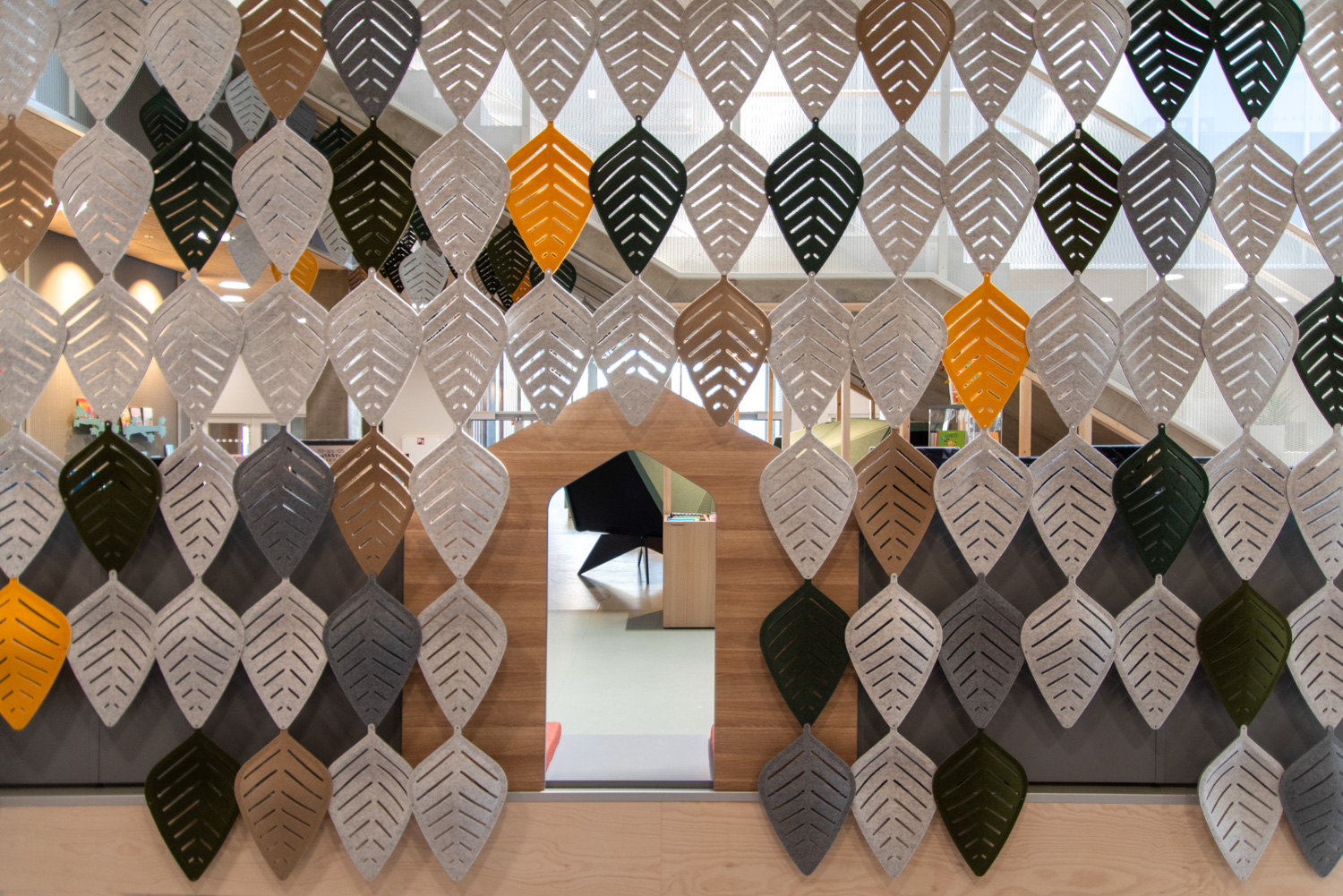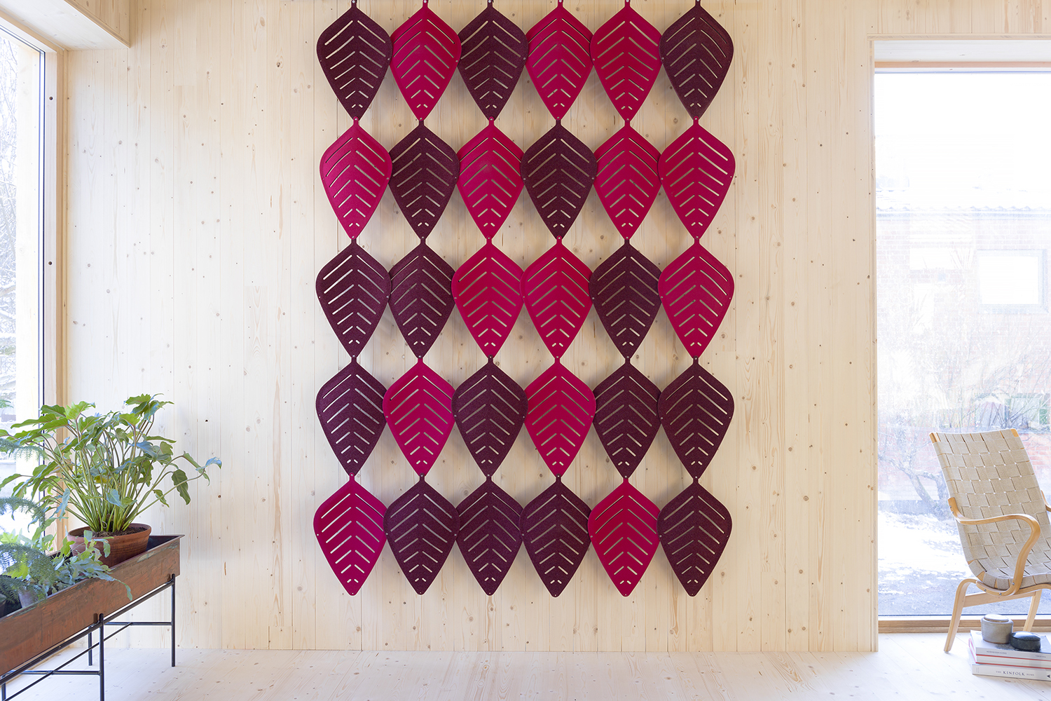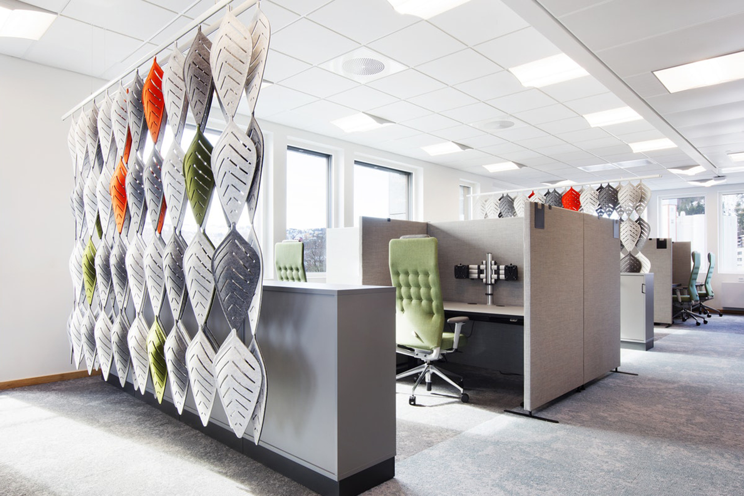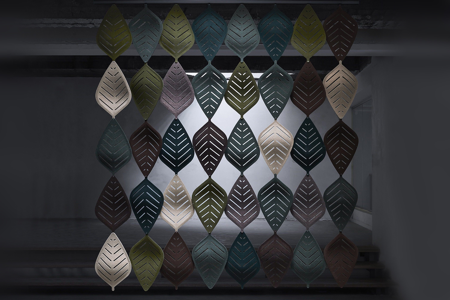 Airleaf maakt het mogelijk om afzonderlijke ruimtes te creëren met behoud van openheid. U bepaalt zelf de mate van openheid door te kiezen hoe de bladvormige modules worden gecombineerd. De bladvormige modules kunnen worden gecombineerd tot geluidsverspreidende schermen in verschillende patronen en formaten.