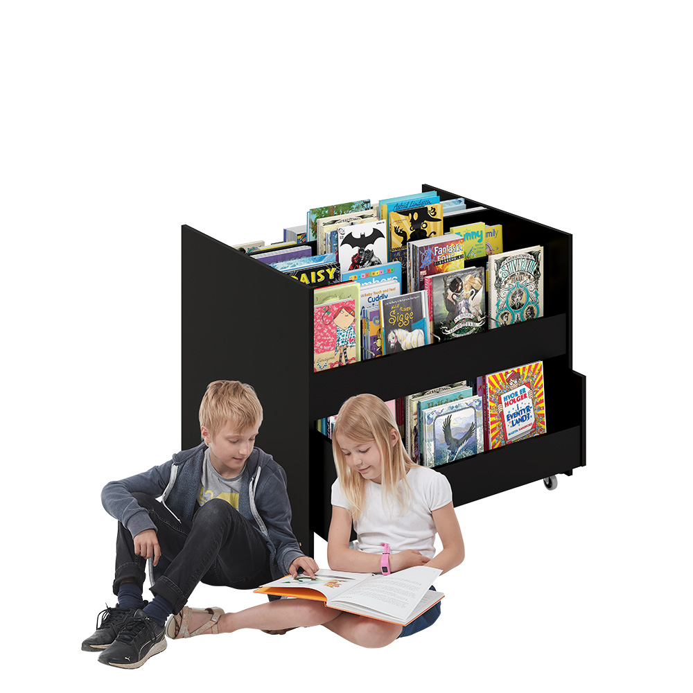 Populaire, dubbelzijdige boekenbak met 3 niveaus, 2 verstelbare verdelers en opberglades met 2 compartimenten op wieltjes eronder aan beide zijden.