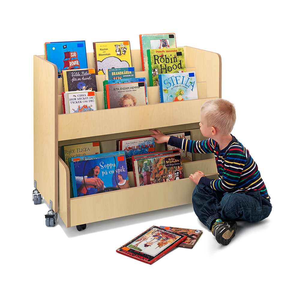 Populaire, enkelzijdige boekenbak met 3 niveaus, 2 verstelbare verdelers en een opberglade met 2 compartimenten op wieltjes eronder.