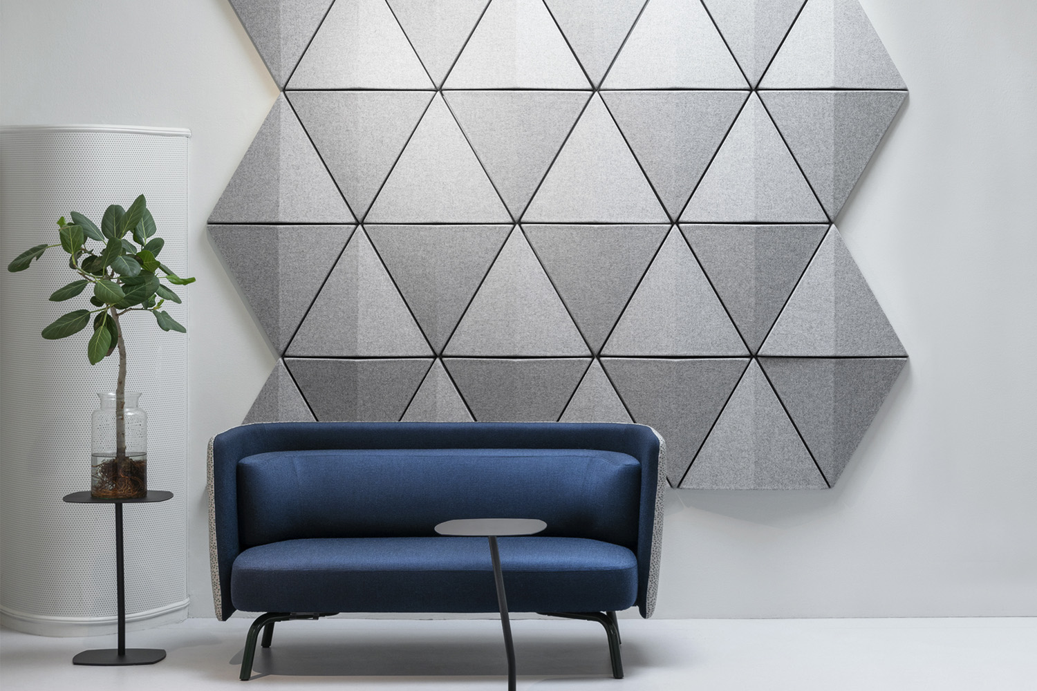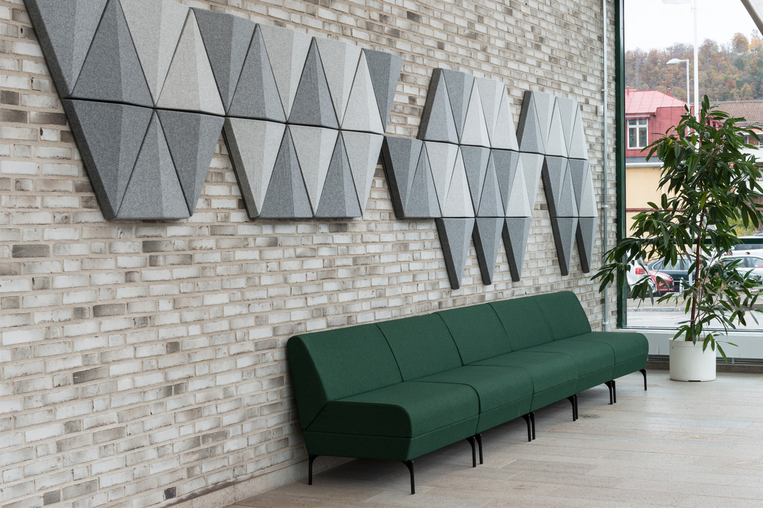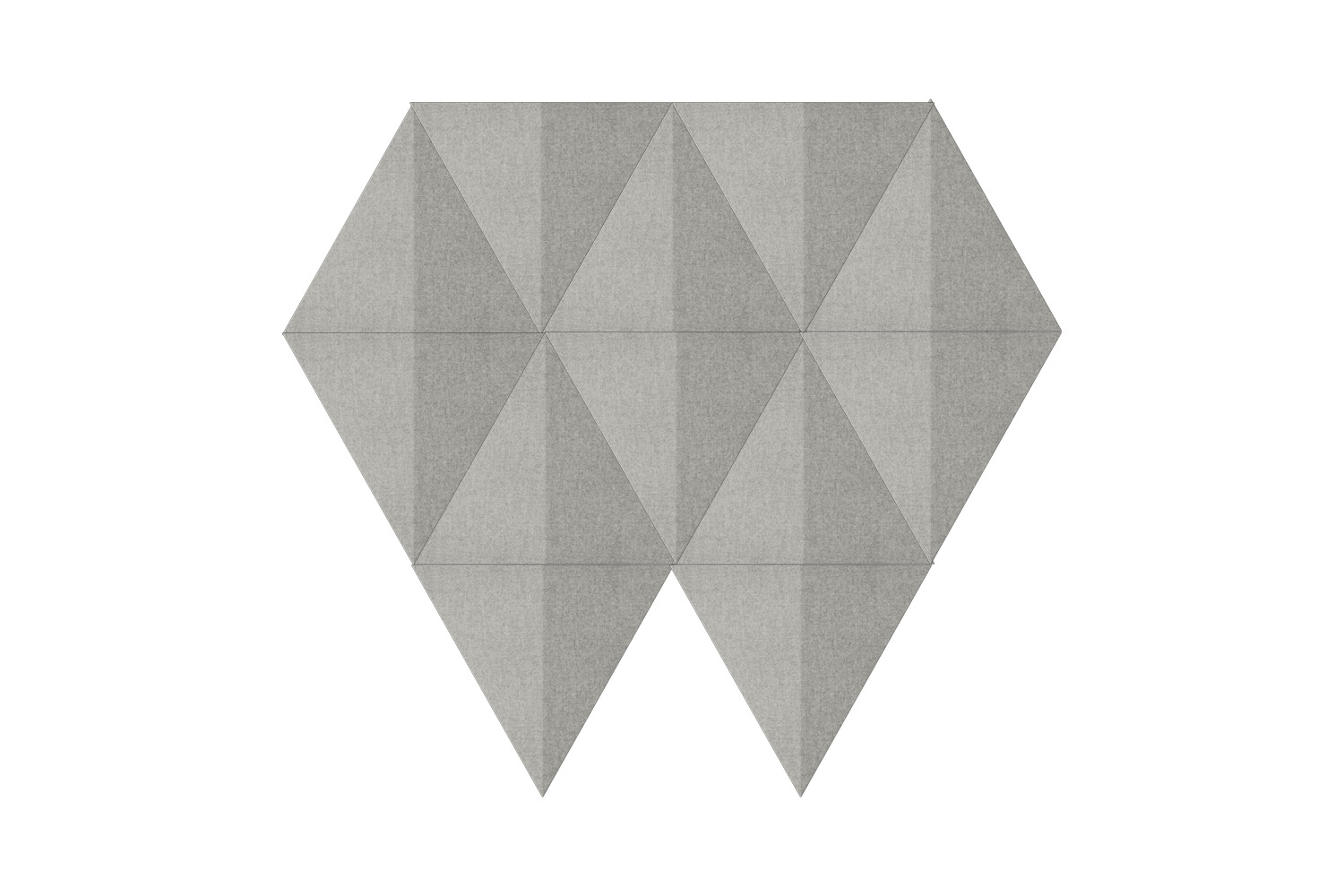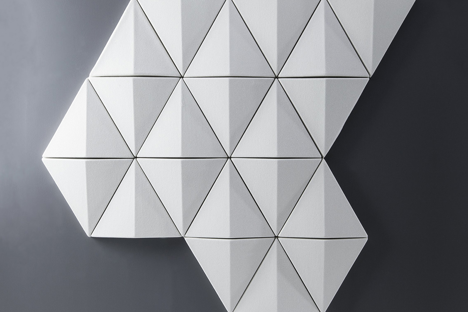 De driehoekige, geluidsabsorberende panelen hebben een speelse en aantrekkelijke aanblik en kunnen naar wens aangepast en gecombineerd worden, waardoor unieke en functionele wandontwerpen ontstaan. Panelen kunnen horizontaal of verticaal worden geplaatst, waardoor leuke patronen op de muur kunnen worden gemaakt.