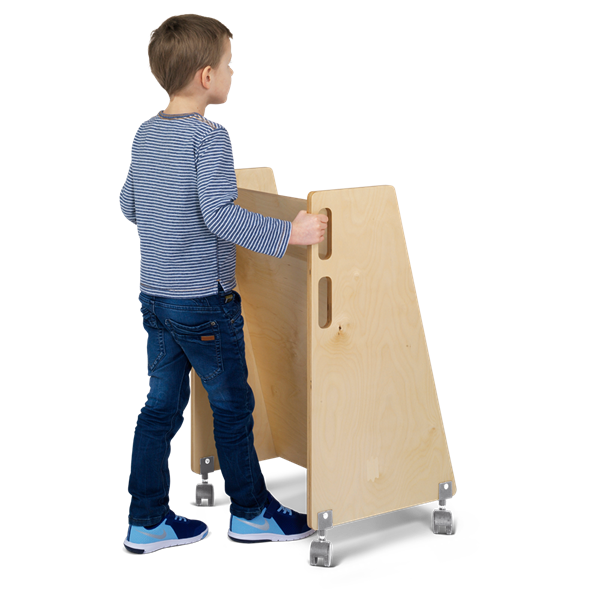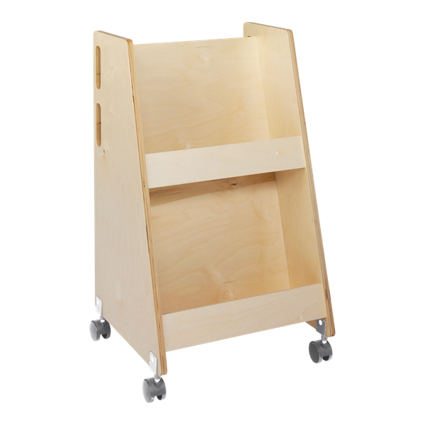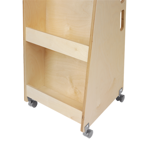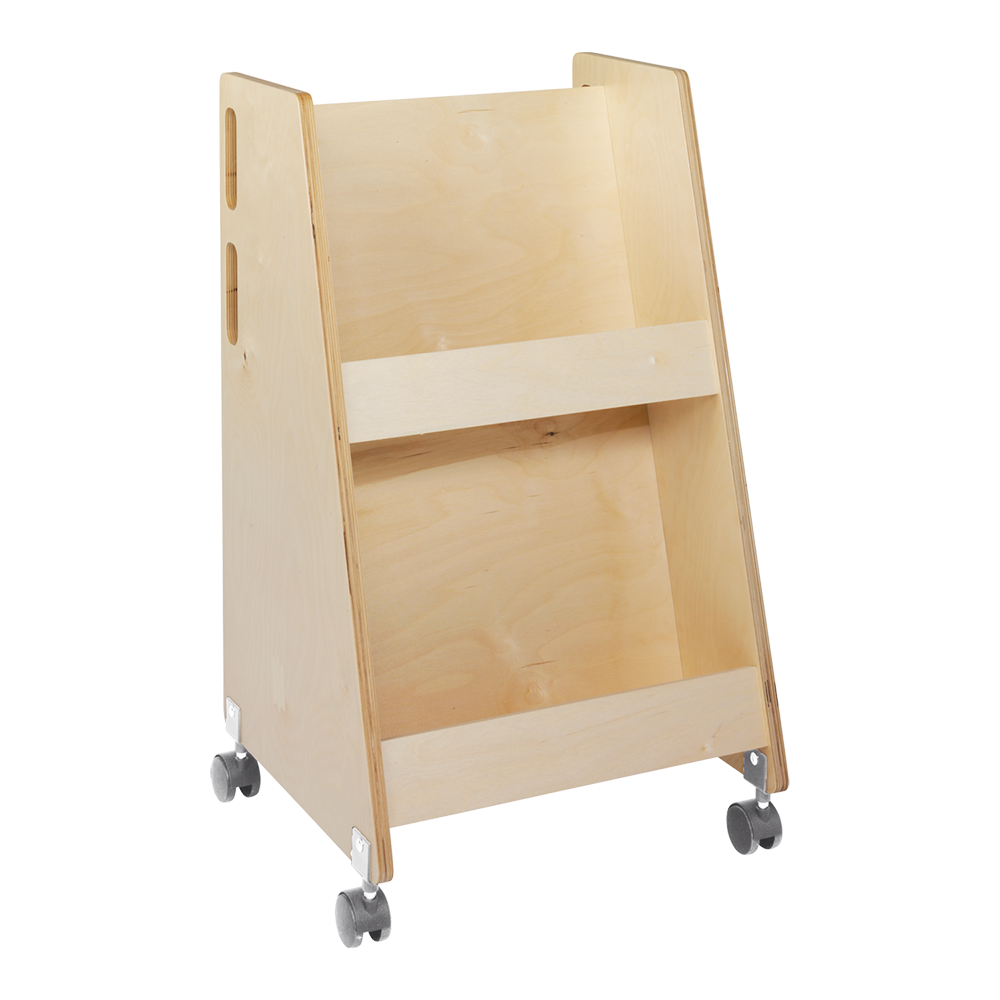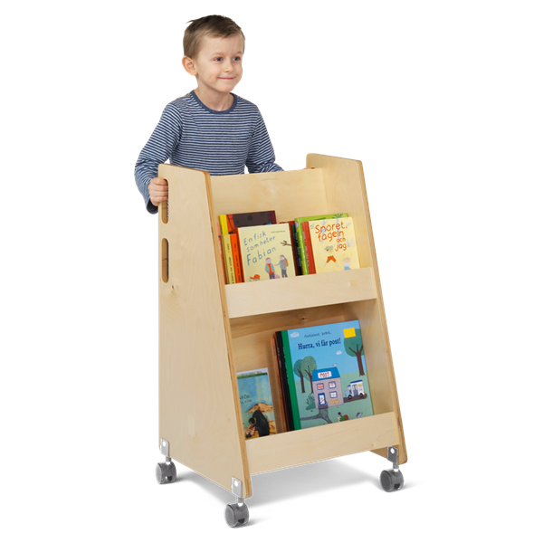 Compacte boekenwagen van berken multiplex met 2 vaste legborden met opstaande voorrand voor frontale presentatie van bv. prentenboeken.