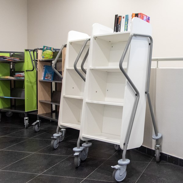 Het ontwerp van de boekenwagen zorgt voor een veilige opslag van media en biedt daarnaast een goed overzicht van de boeken die al op de kar geplaatst zijn.