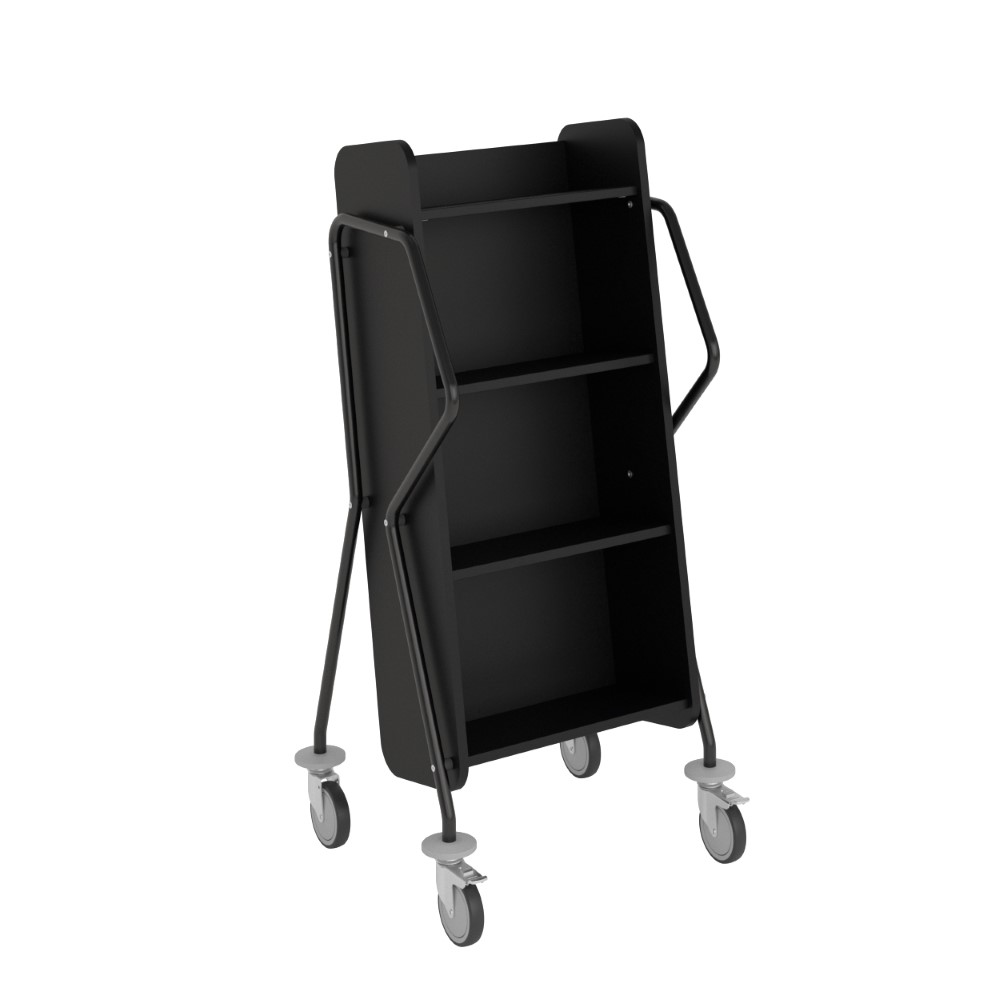 Ergonomische, gebruiksvriendelijke, enkelzijdige boekenwagen met 4 legplanken. Er is een royale ruimte voorzien tussen de planken, ideaal voor grotere boeken.