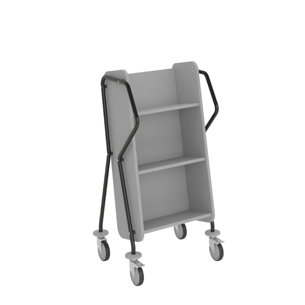 Ergonomische, gebruiksvriendelijke, enkelzijdige boekenwagen met 3 legplanken. Er is een royale ruimte voorzien tussen de planken, ideaal voor grotere boeken.