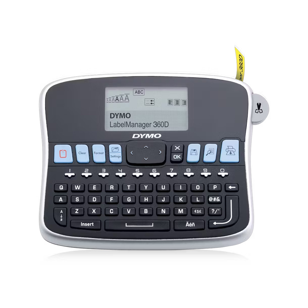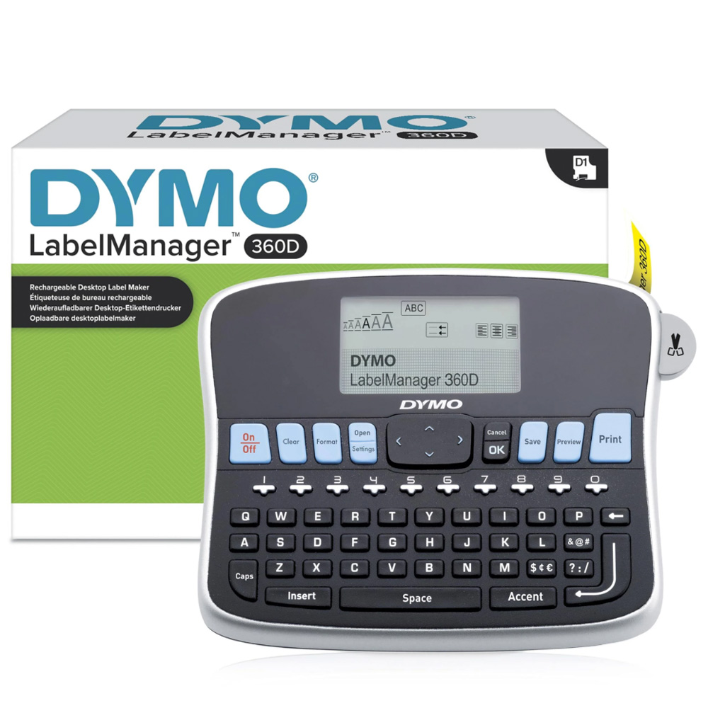 De Dymo 360D is compatibel met D1-markeertapes van 6, 9, 12 en 19 mm. Hij beschikt over een groter display en extra functionaliteiten.