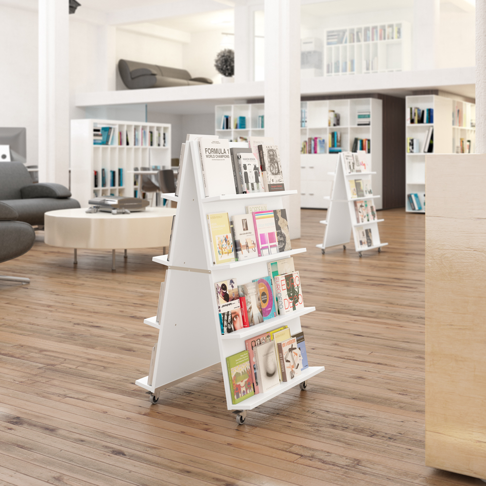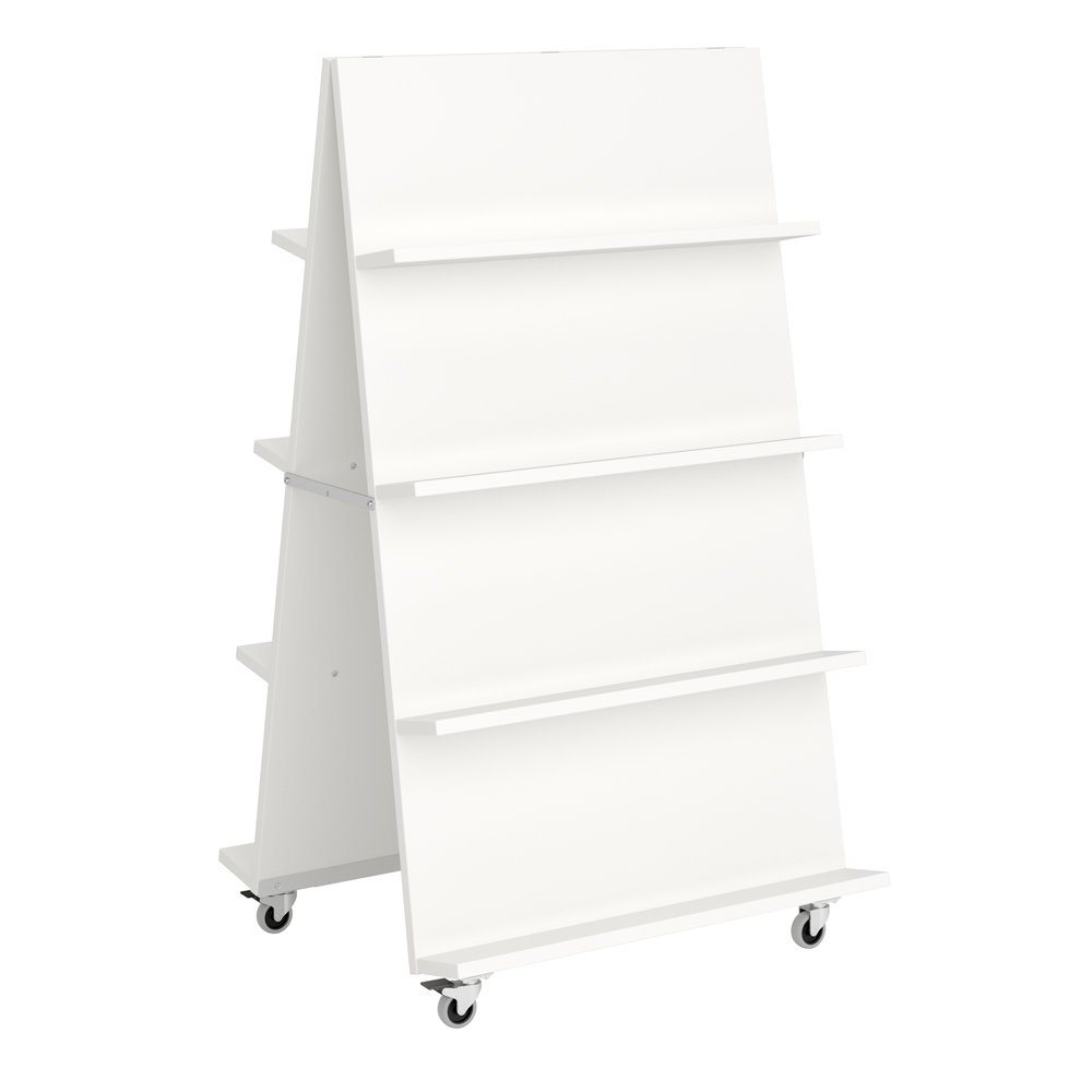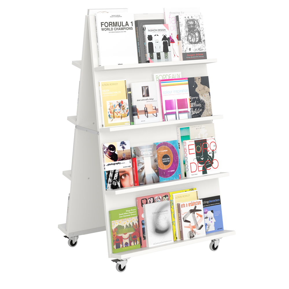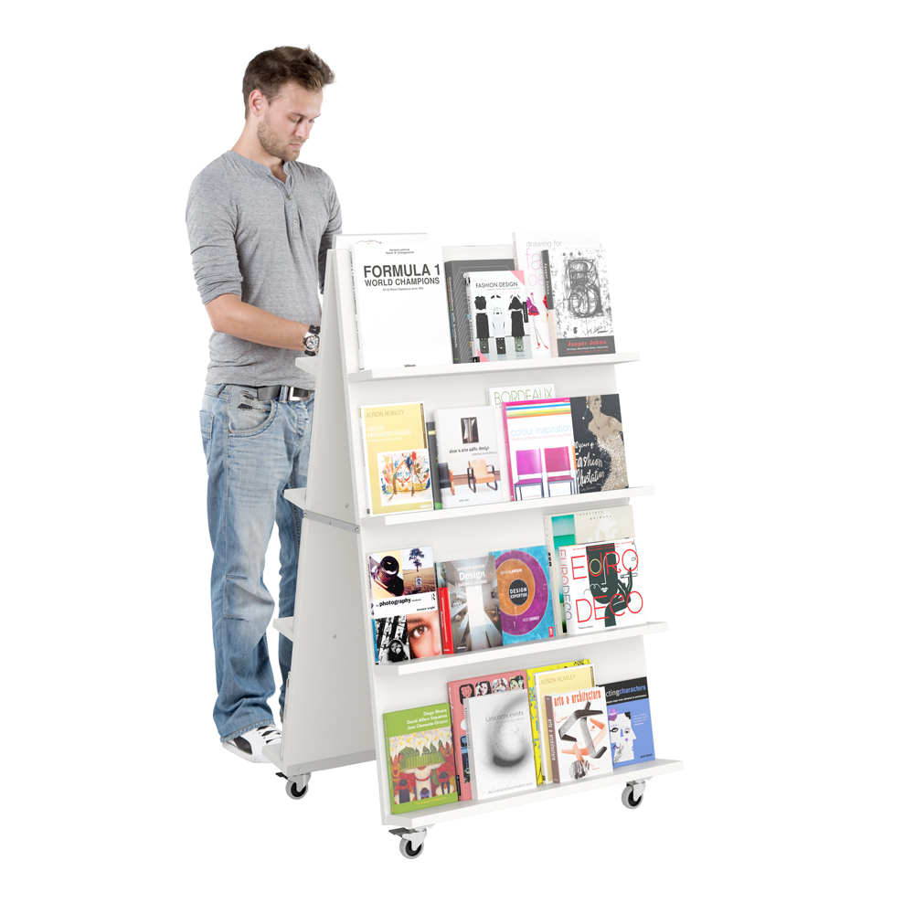 Verschillende mediaformaten kunnen op deze display gepresenteerd worden dankzij de verstelbare planken. Gebruik 3 of 4 planken aan elke zijde. Ideaal in open ruimtes of entree zones waar kleinere displays vaak in verdwijnen.