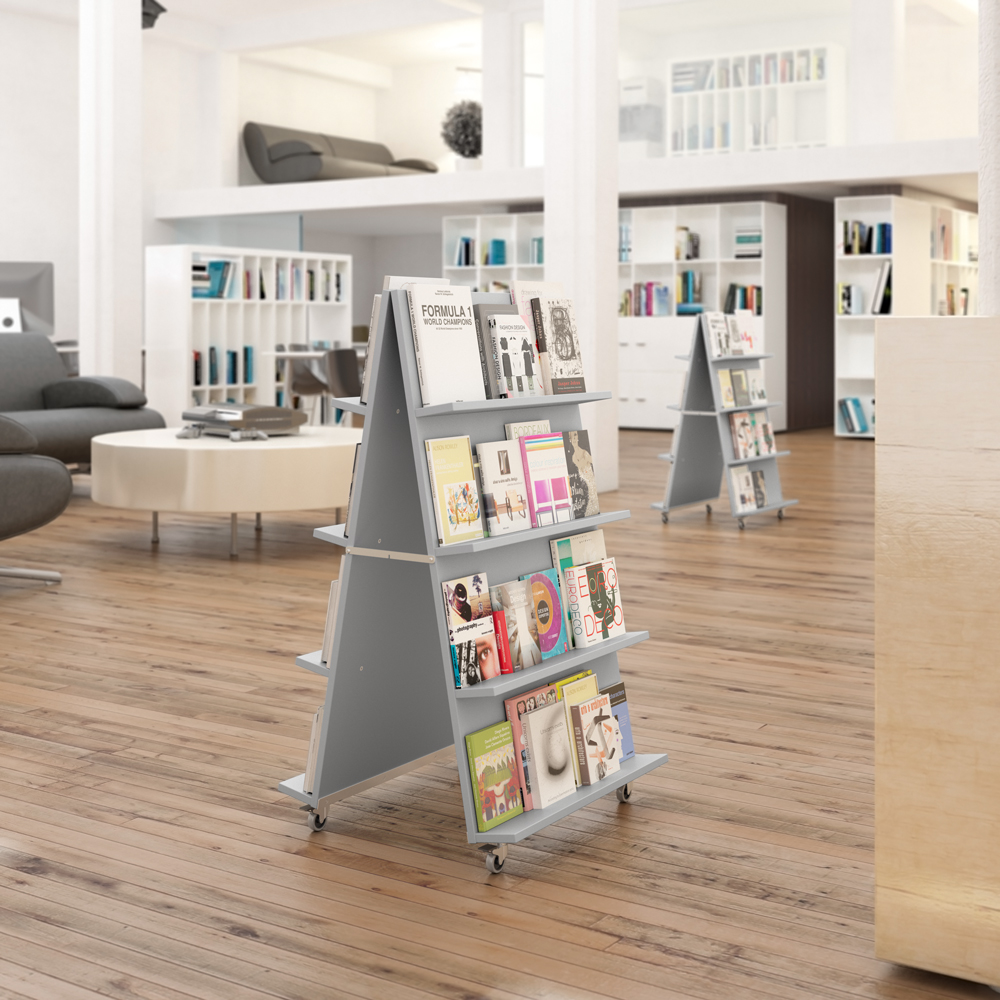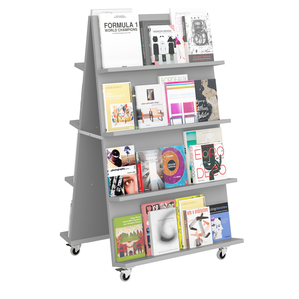 Verschillende mediaformaten kunnen op deze display gepresenteerd worden dankzij de verstelbare planken. Gebruik 3 of 4 planken aan elke zijde. Ideaal in open ruimtes of entree zones waar kleinere displays vaak in verdwijnen.
