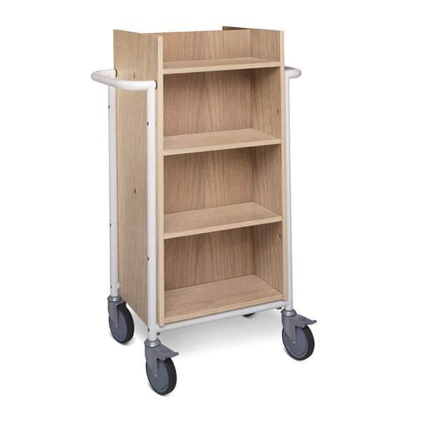 Functionele, dubbelzijdige boekenwagen met 8 legplanken waarvan 6 verstelbaar.