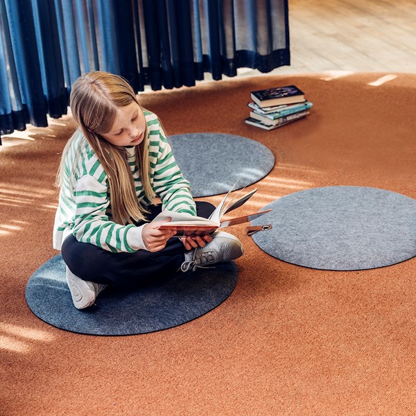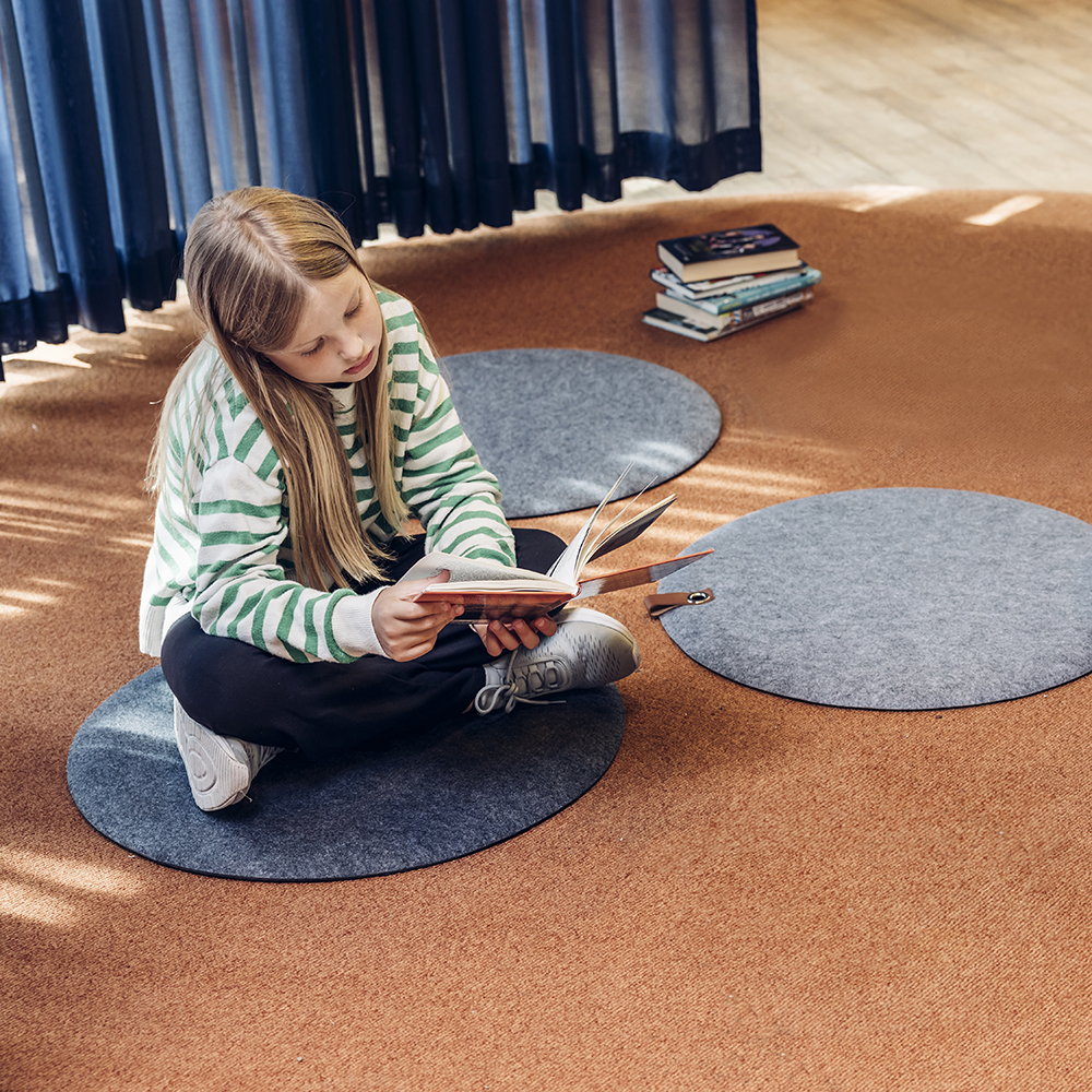 Duurzaam, drukverlagend, vilten vloerkussen met antislip onderkant dat de akoestiek in de kinderruimte verbetert en het leren en spelen aanmoedigt.
