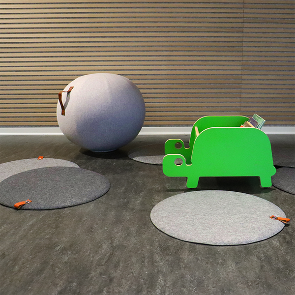 Duurzaam, drukverlagend, vilten vloerkussen met antislip onderkant dat de akoestiek in de kinderruimte verbetert en het leren en spelen aanmoedigt.