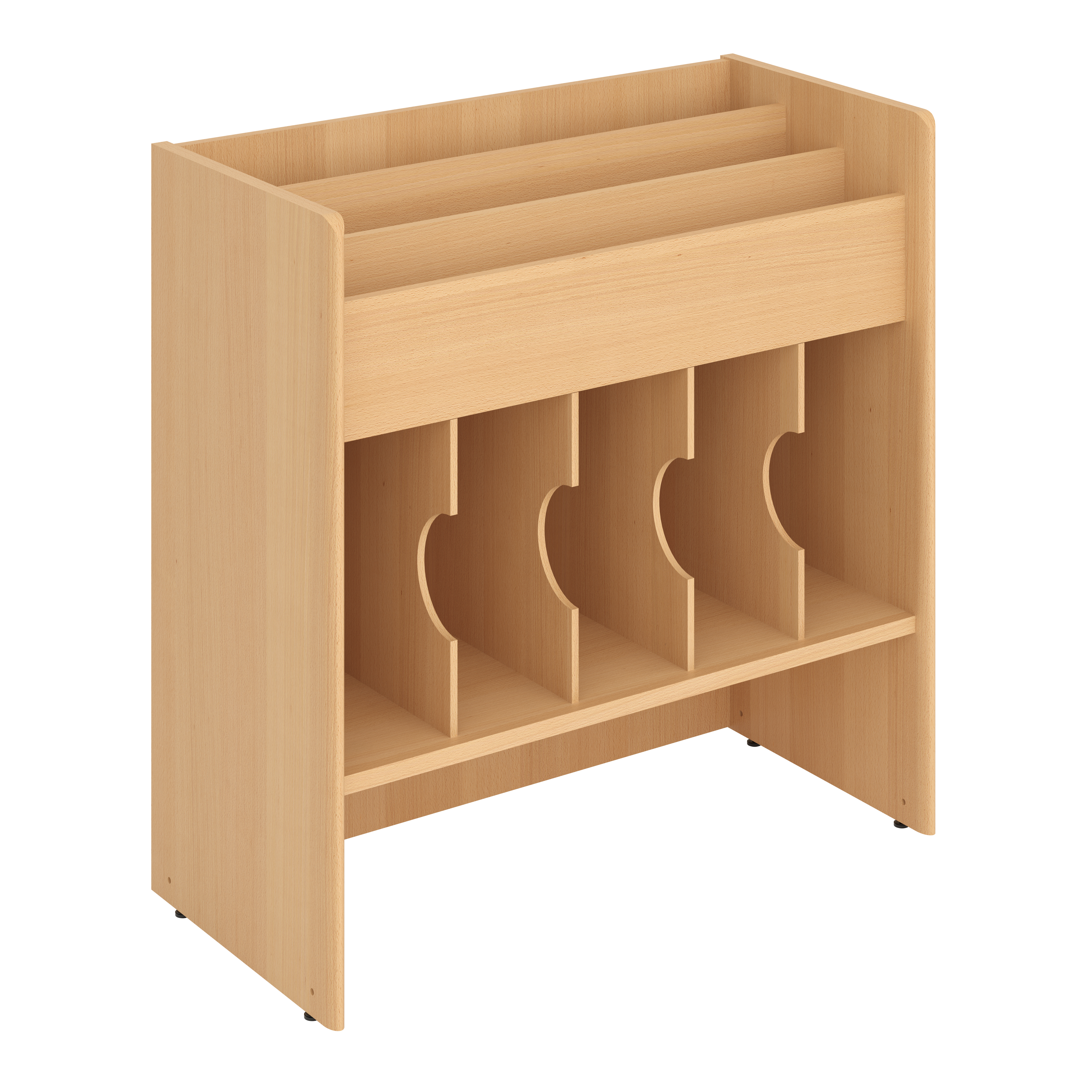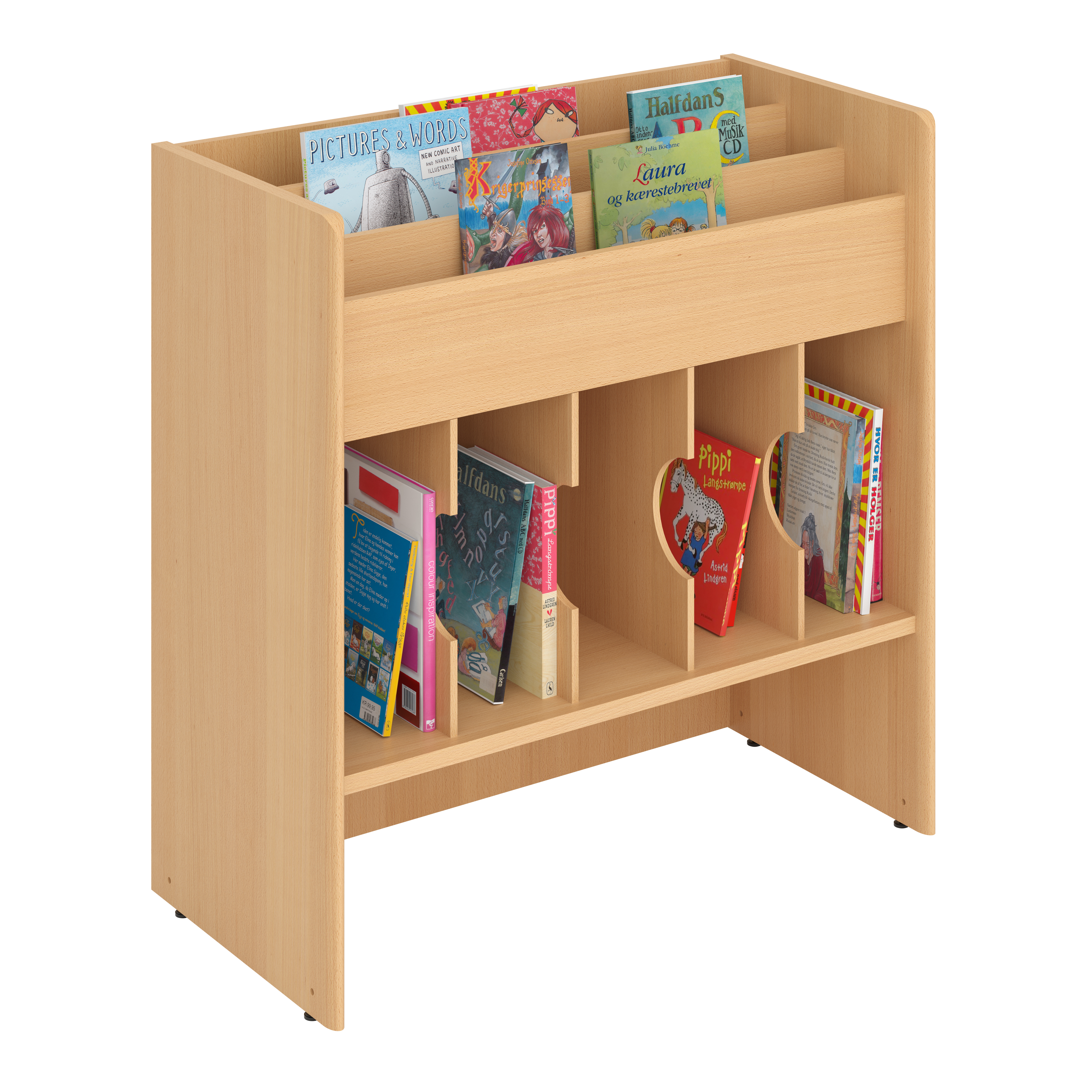 Populaire boekenbak met 3 niveaus voor frontale presentatie bovenaan en 5 opslagruimtes onderaan.