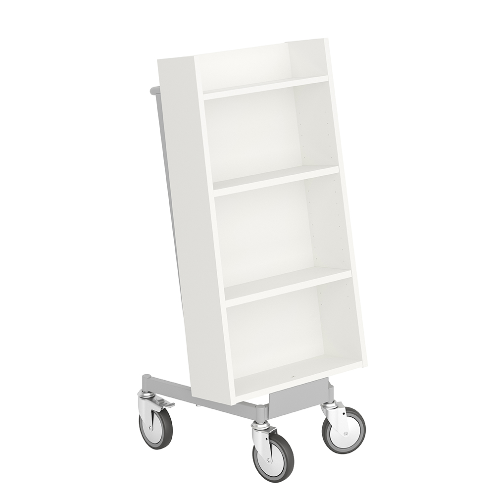 Gebruiksvriendelijke, enkelzijdige boekenwagen met 4 legplanken. De 2 middelste planken zijn verstelbaar.