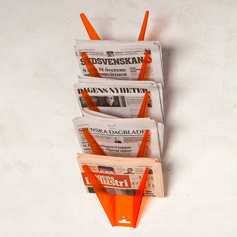 Strakke krantenhouder in frisse kleuren. Eenvoudige wandmontage met sleutelgatbevestiging.