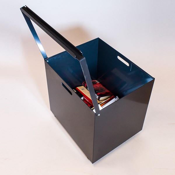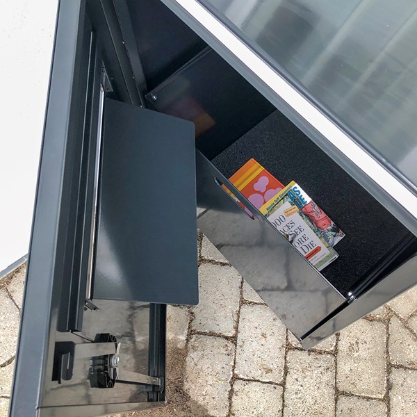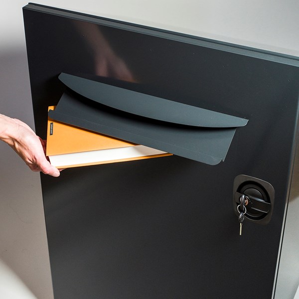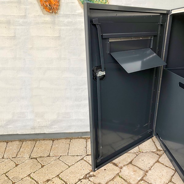 Robuuste, afsluitbare metalen inleverbox voor gebruik buitenshuis. Geschikt voor bibliotheken met beperkte openingstijden.