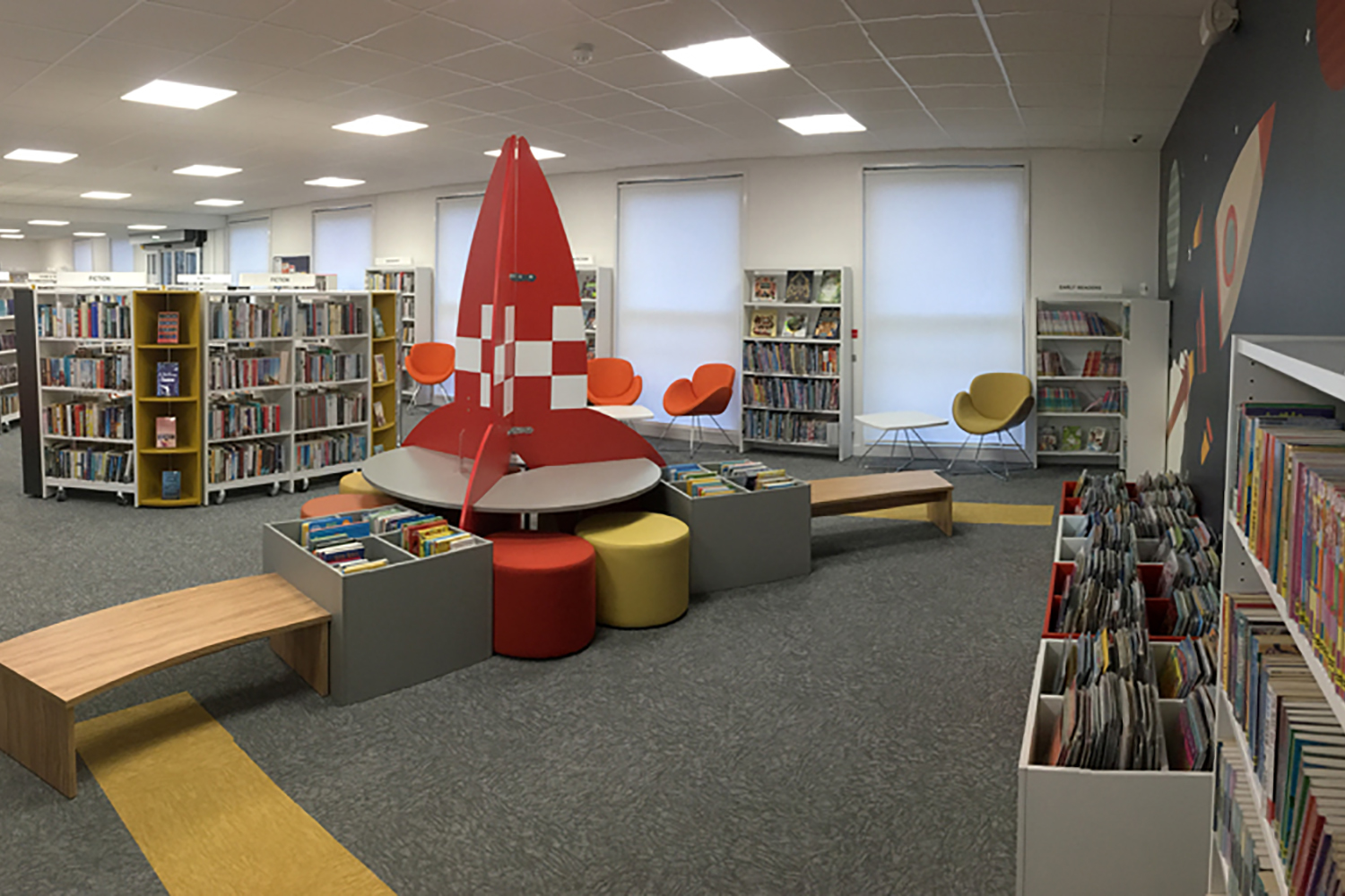 Ter herinnering aan de maanlanding van 1969 – het jaar waarin de bib van Newport Pagnell voor het eerst de deuren opende – prijkt op de muur van de kinderafdeling een kleurrijke raket en werd centraal in de afdeling een heuse ‘leesraket’ voorzien.