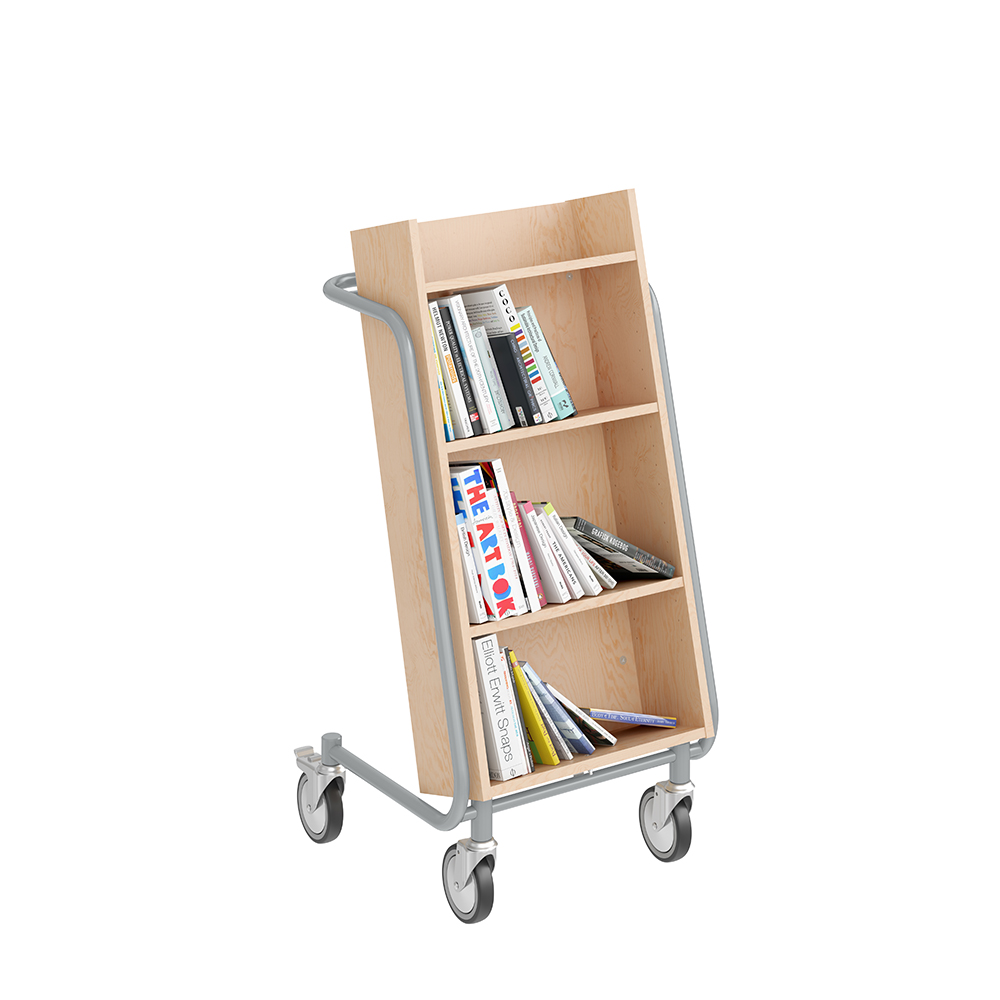Gebruiksvriendelijke, enkelzijdige boekenwagen met 4 legplanken. De 2 middelste planken zijn verstelbaar.
