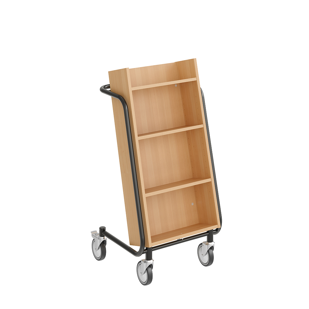 Gebruiksvriendelijke, enkelzijdige boekenwagen met 4 legplanken. De 2 middelste planken zijn verstelbaar.