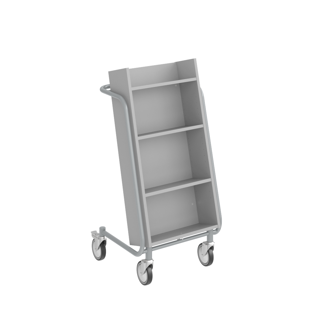 Gebruiksvriendelijke, enkelzijdige boekenwagen met 4 legplanken. De 2 middelste planken zijn verstelbaar.