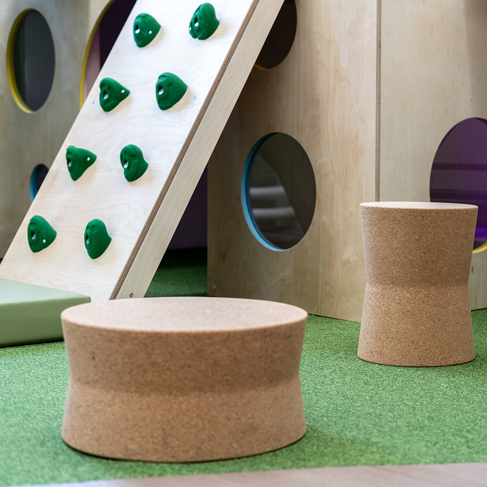Kurk is eenvoudig te reinigen, geluidsabsorberend en brandvertragend – eigenschappen op maat van openbare ruimtes en omgevingen waar veel kinderen komen.