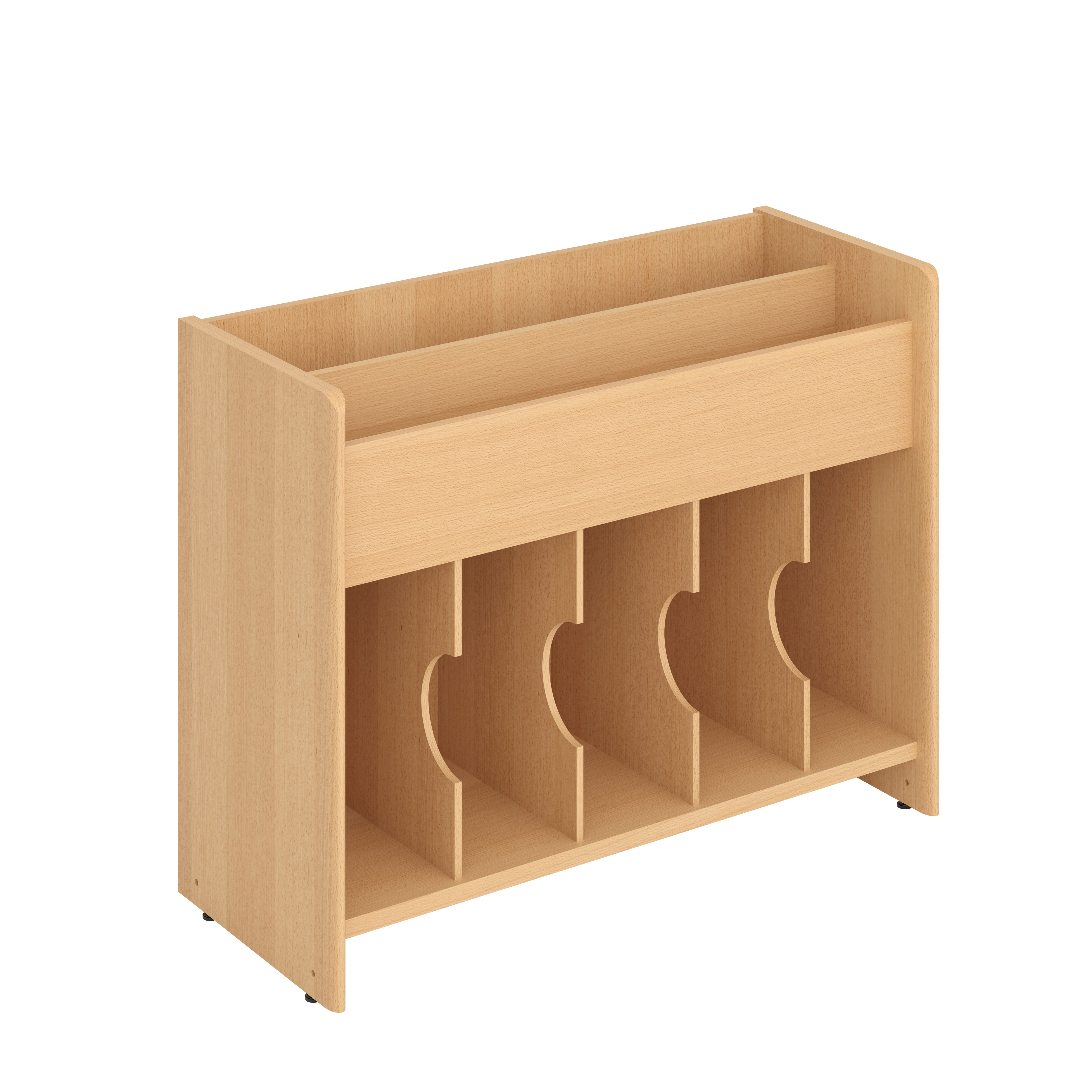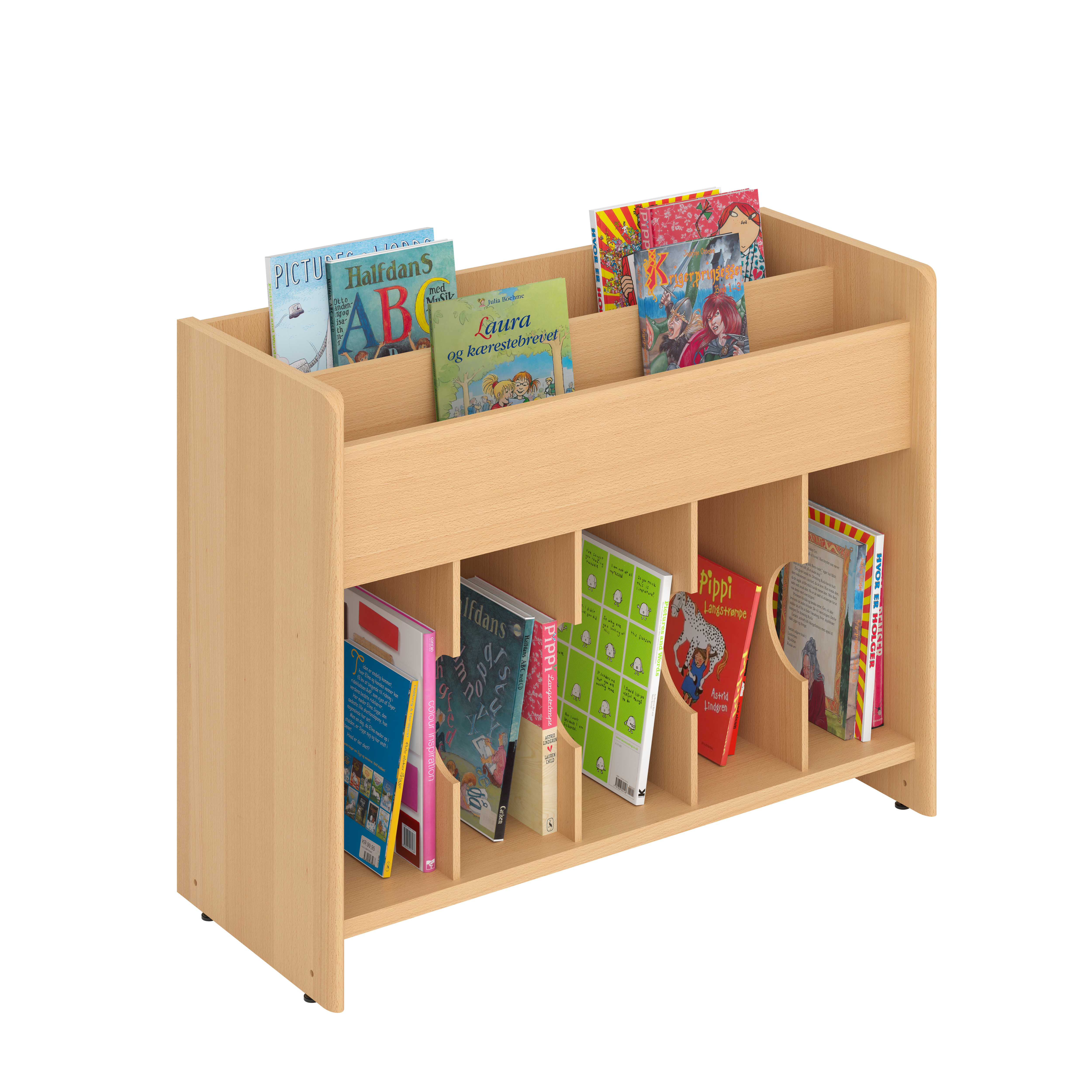 Deze populaire boekenbak is voorzien van 2 niveaus voor frontale presentatie bovenaan en 5 vakken onderaan voor opslag.