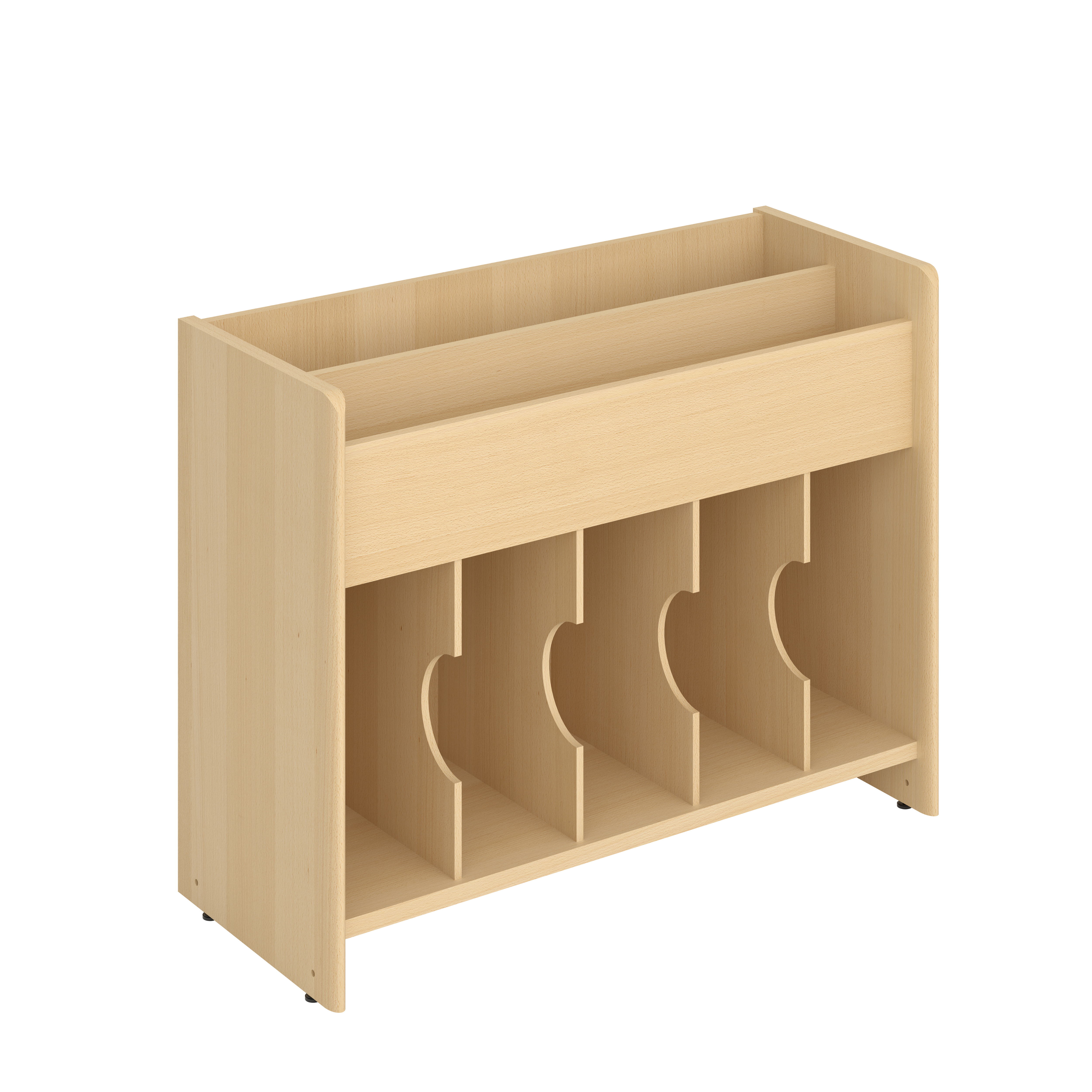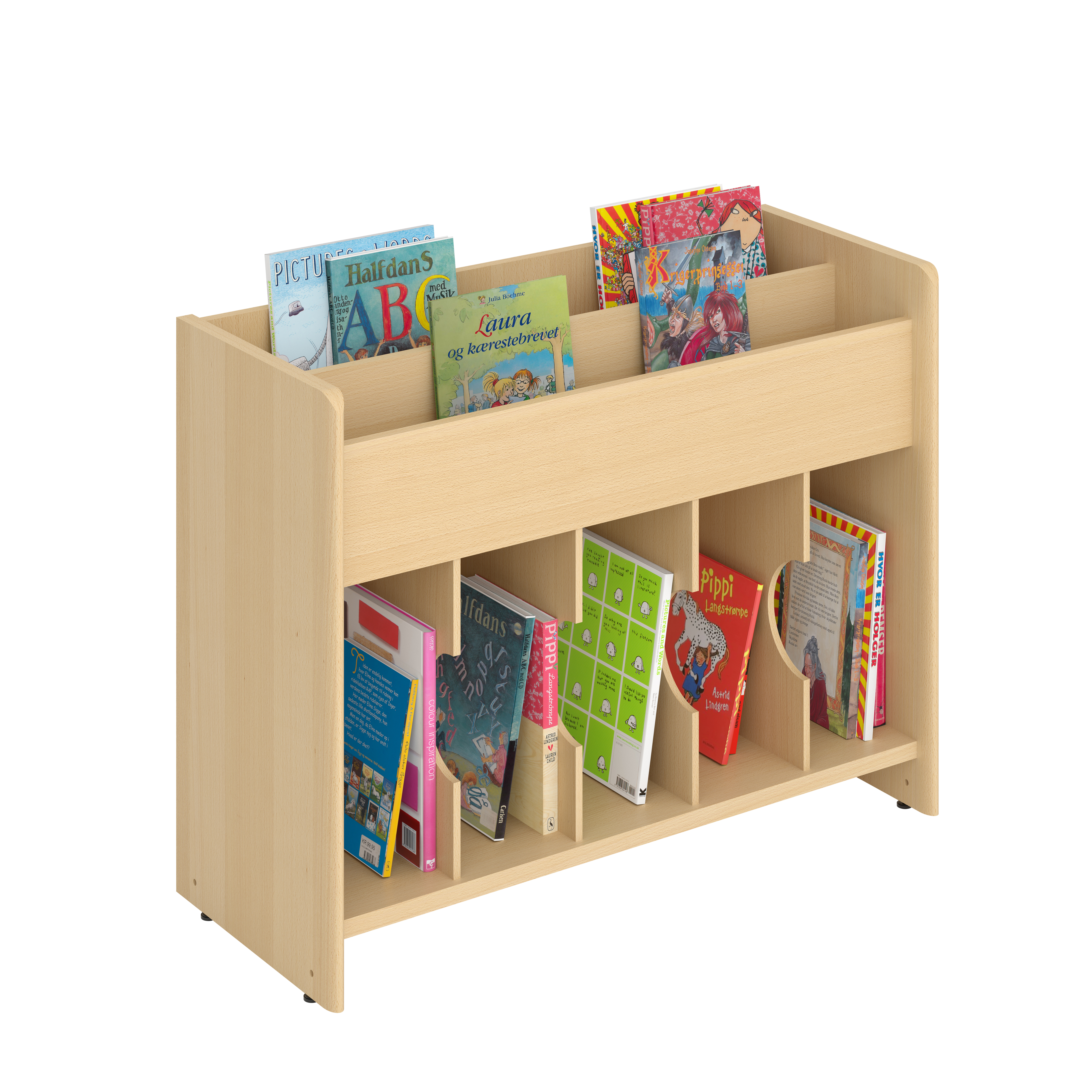 Deze populaire boekenbak is voorzien van 2 niveaus voor frontale presentatie bovenaan en 5 vakken onderaan voor opslag.