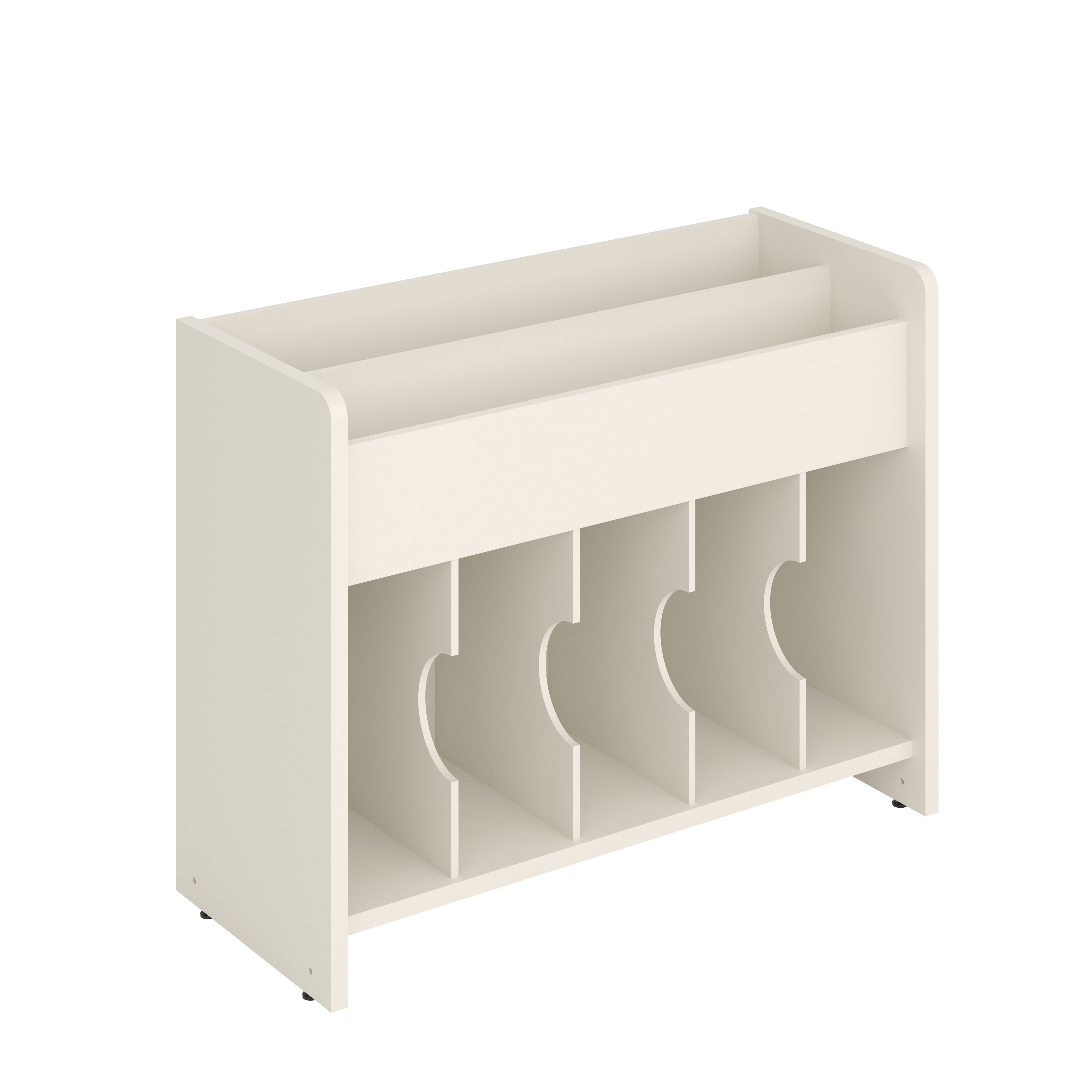 Deze populaire boekenbak is voorzien van 2 niveaus voor frontale presentatie bovenaan en 5 vakken onderaan voor opslag.