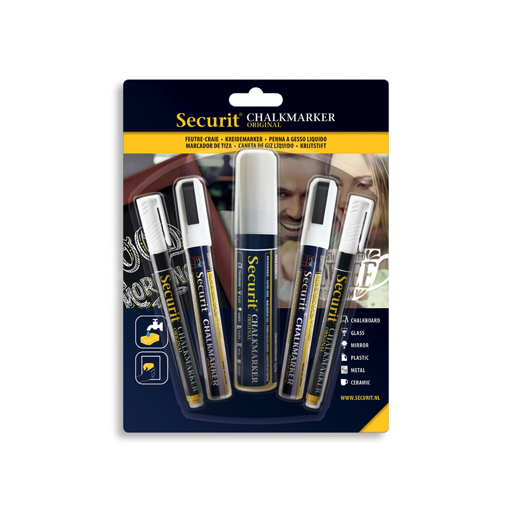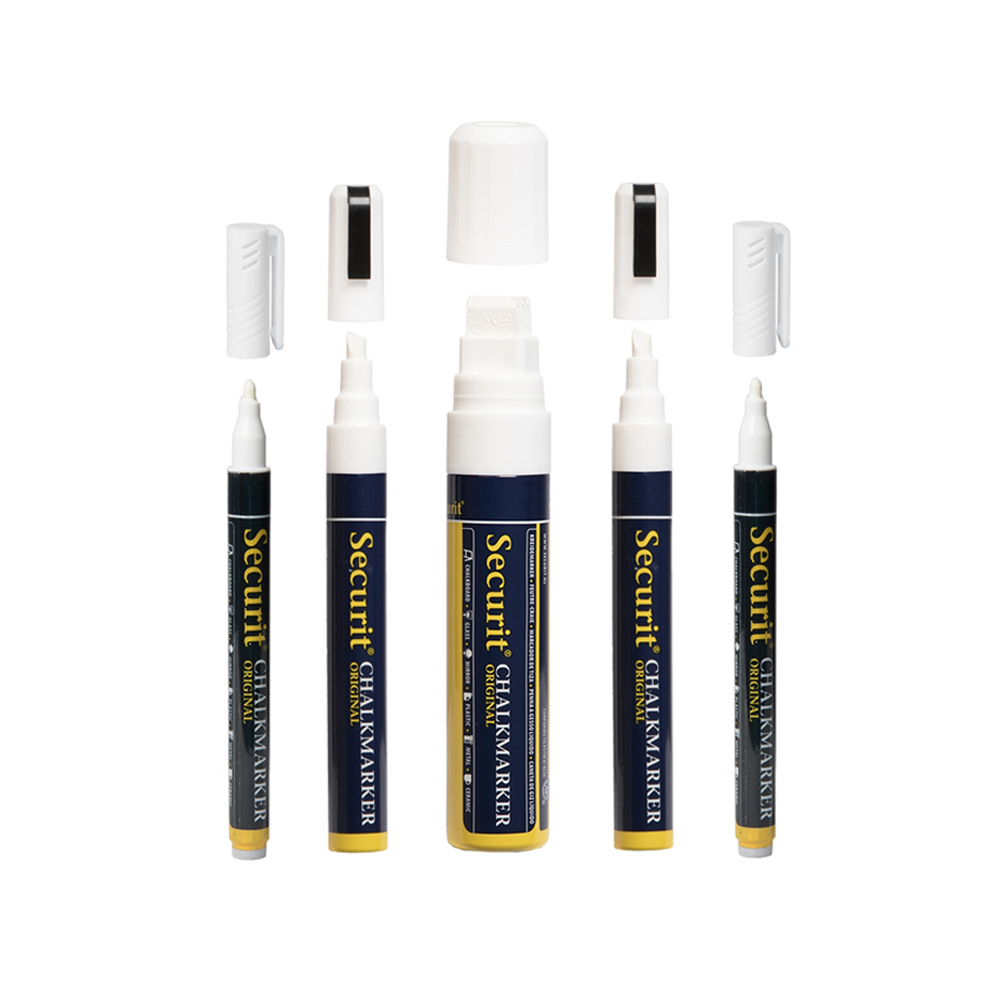 Set van 5 krijtpennen die kunnen gebruikt worden op alle egale oppervlakken zoals krijtborden, whiteboards, signalisatiepanelen en glas.