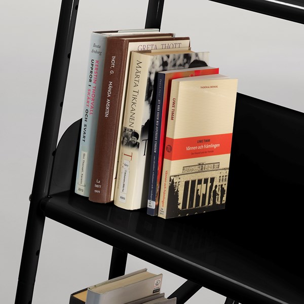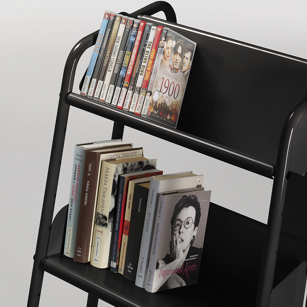 Enkelzijdige, stabiele metalen boekenwagen met drie schuine, afneembare en omkeerbare legborden voor verschillende soorten media en boeken. Plaats de legborden waar nodig d.m.v. de gaten in het frame.