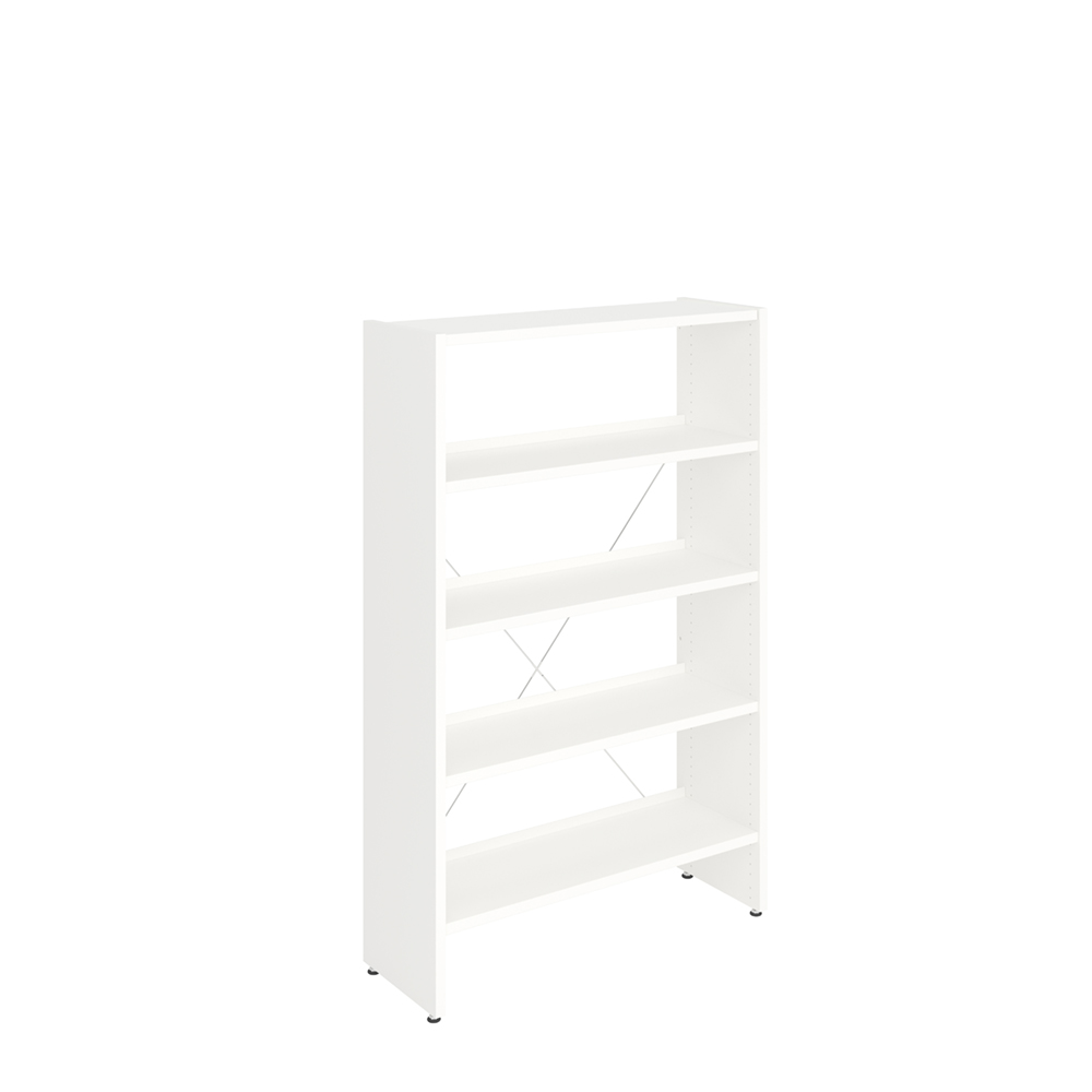 Het reksysteem wordt gedragen door middel van het kruisschoor aan de achterkant, zodat er extra legplanken toegevoegd of verwijderd kunnen worden zonder de hele opstelling te demonteren.