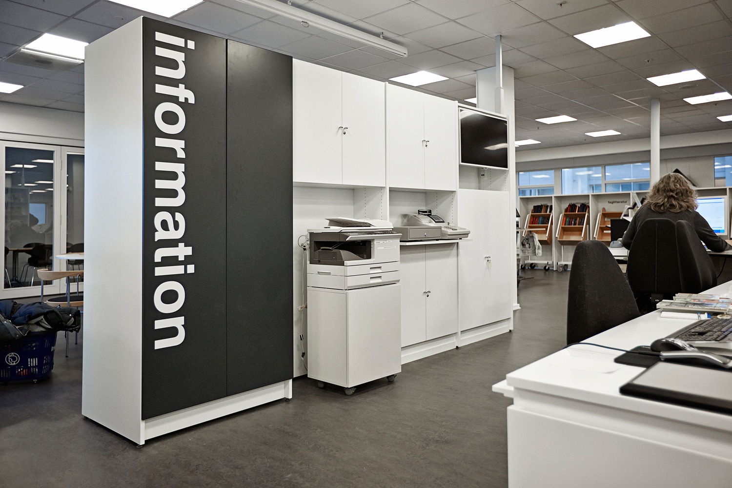 Met een nieuw pand dat veel kleiner was, waren de eisen aan het ontwerp en binneninrichting veel hoger. Door slim en creatief met ruimte om te gaan is een wijde en verwelkomende bibliotheek tot stand gekomen met toegewezen plaatsen voor zowel stilte en lezen als voor discussies. Neem ook een kijkje in de kinderafdeling met het ronde rek en de kleurrijke illustraties, gemaakt door lokale artiesten.