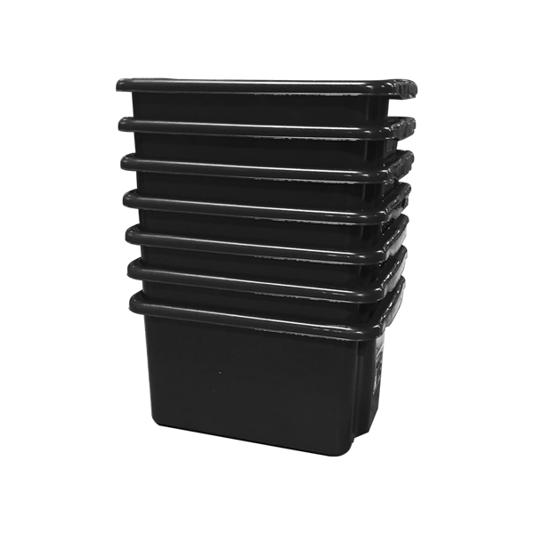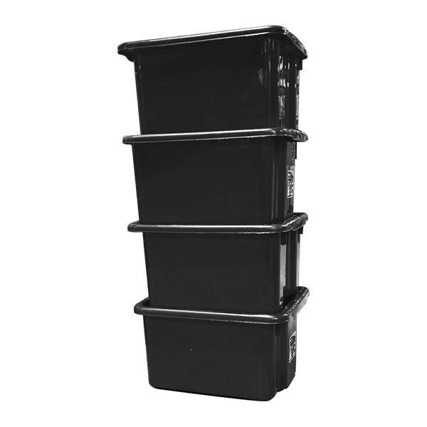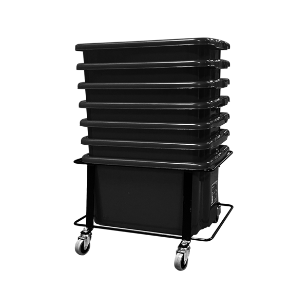 Om volle bakken te stapelen en te verplaatsen kan de houder op wieltjes handig zijn.