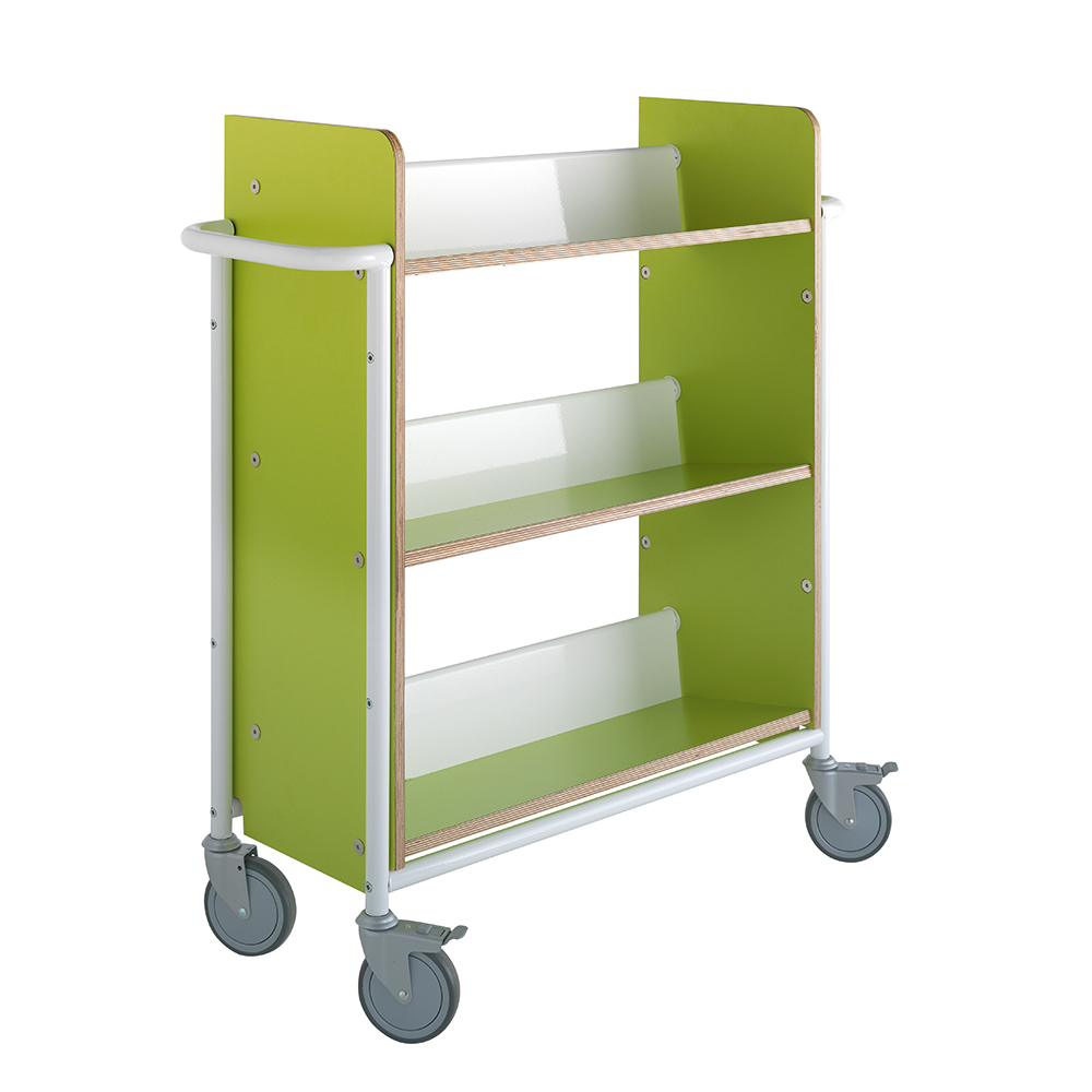 Functionele, enkelzijdige boekenwagen met drie vaste, schuin geplaatste legborden die zorgen voor een veilige media opslag.