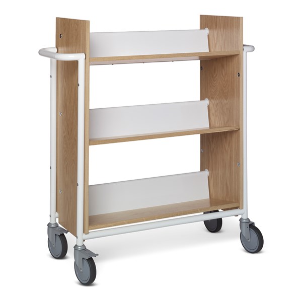 Functionele, enkelzijdige boekenwagen met drie vaste, schuin geplaatste legborden die zorgen voor een veilige media opslag.