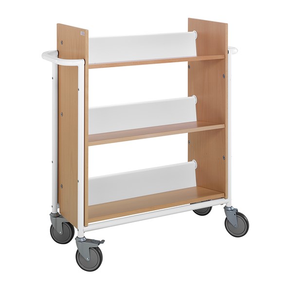 Functionele, enkelzijdige boekenwagen met drie vaste, schuin geplaatste legborden die zorgen voor een veilige media opslag.