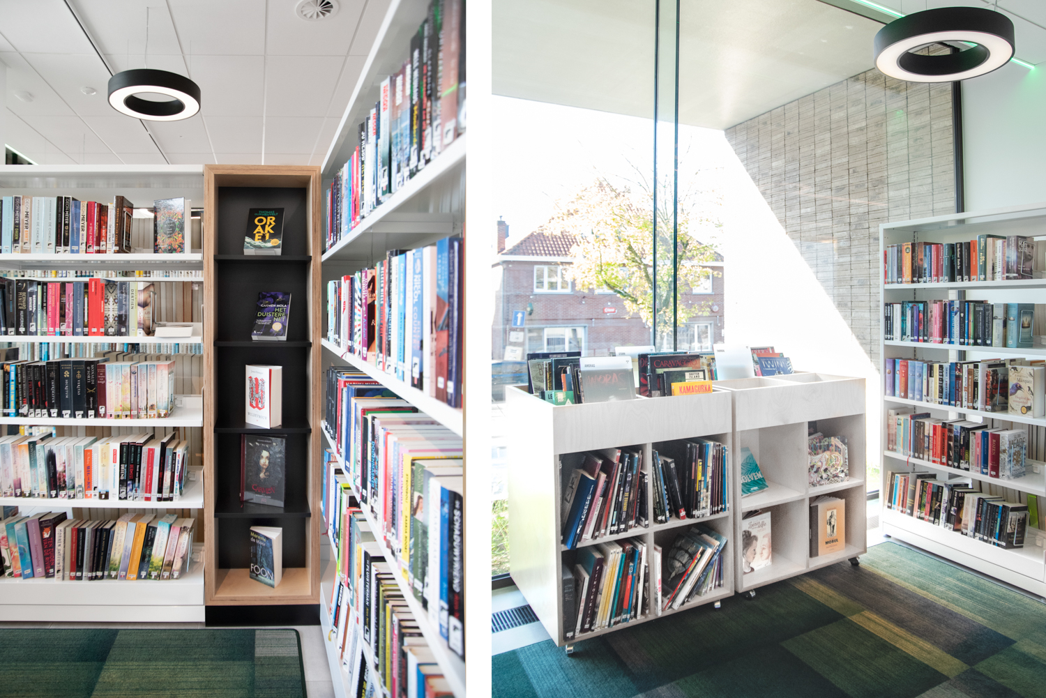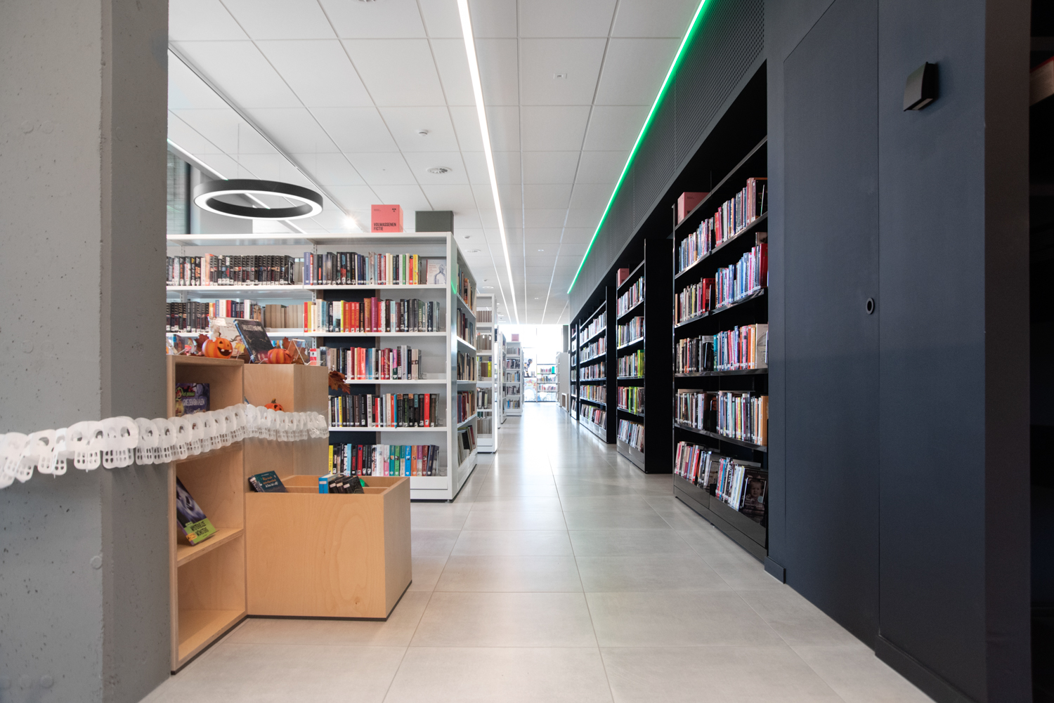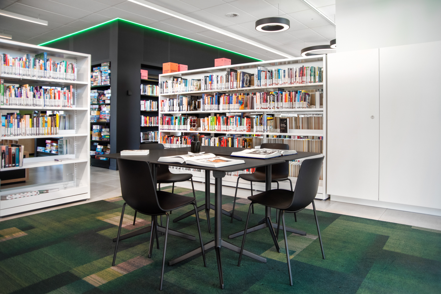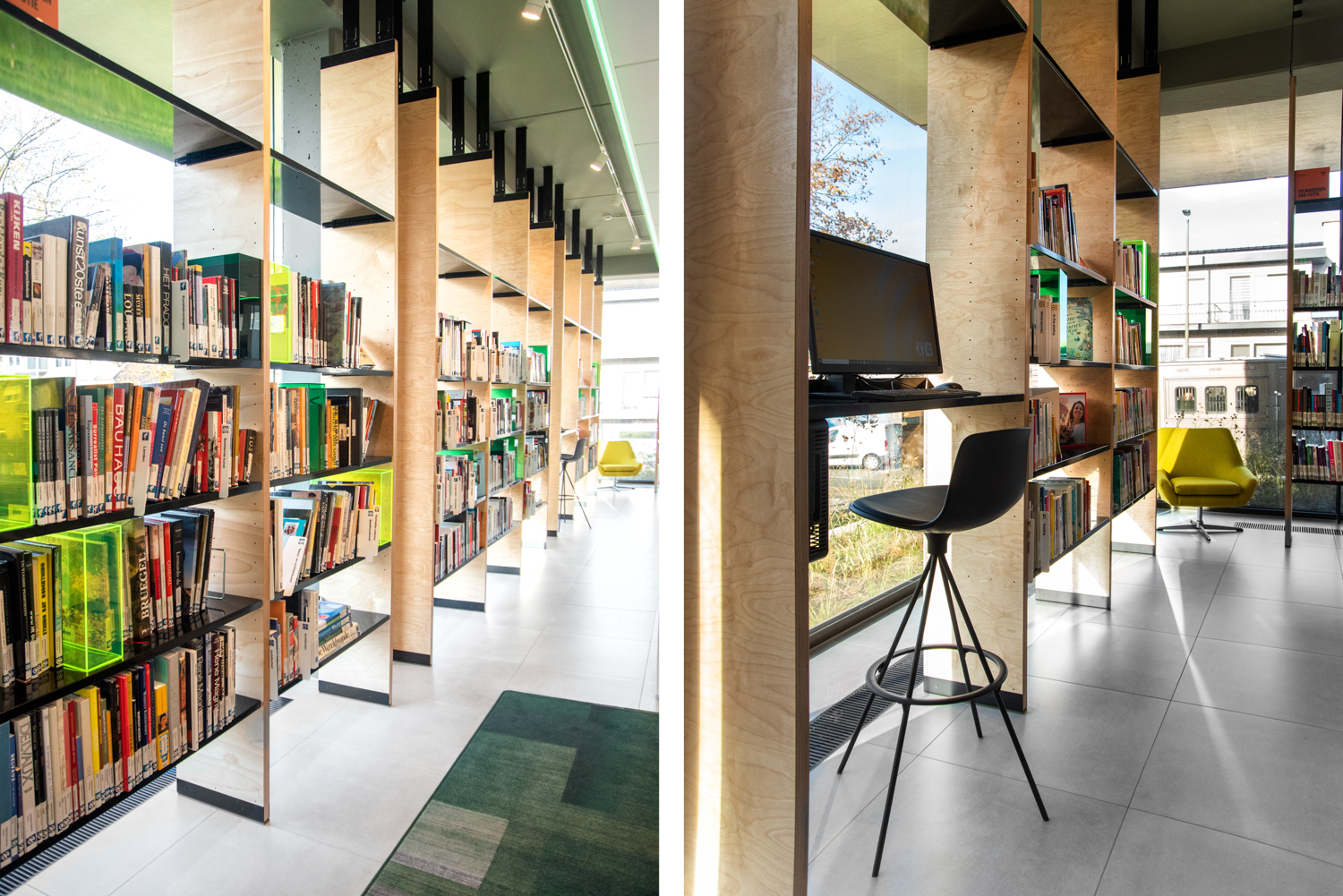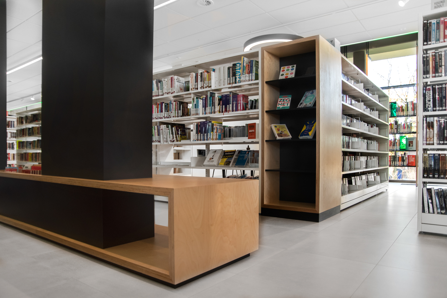 De eenvoud in de zwart-witte rekkensystemen zorgt ervoor dat de boeken alle aandacht krijgen, terwijl de op maat gemaakte meubels warmte geven aan de bibliotheek. De gekleurde plexiglas indexblokken zorgen voor een frisse toets en mooie lichteffecten. De vele grote ramen zorgen ervoor dat de bibliotheek de hele dag in het daglicht baadt.