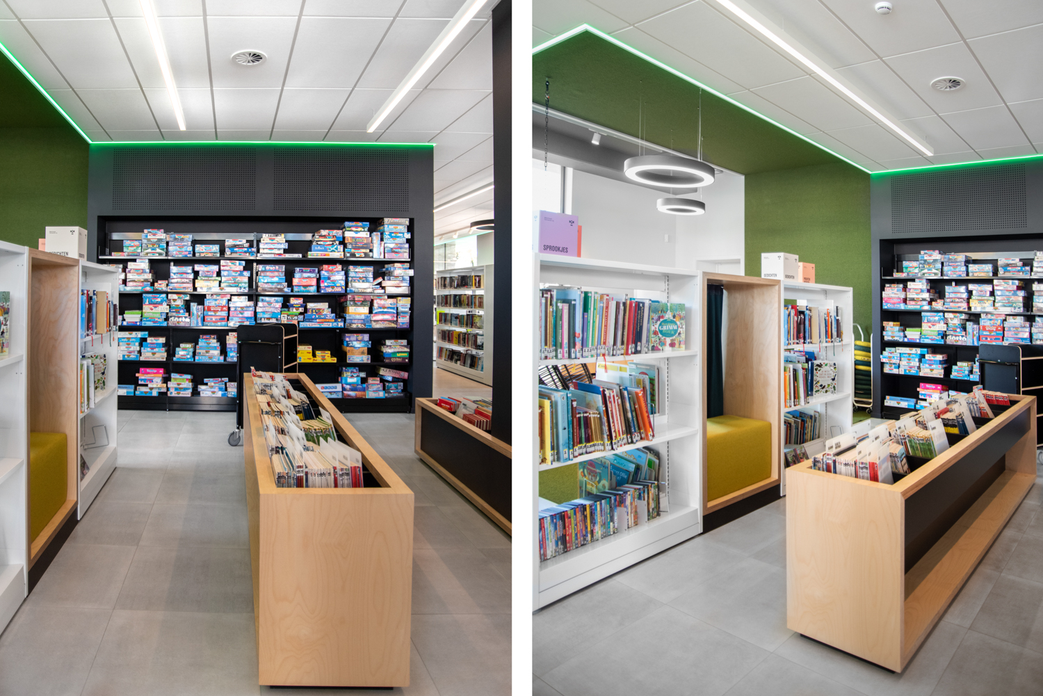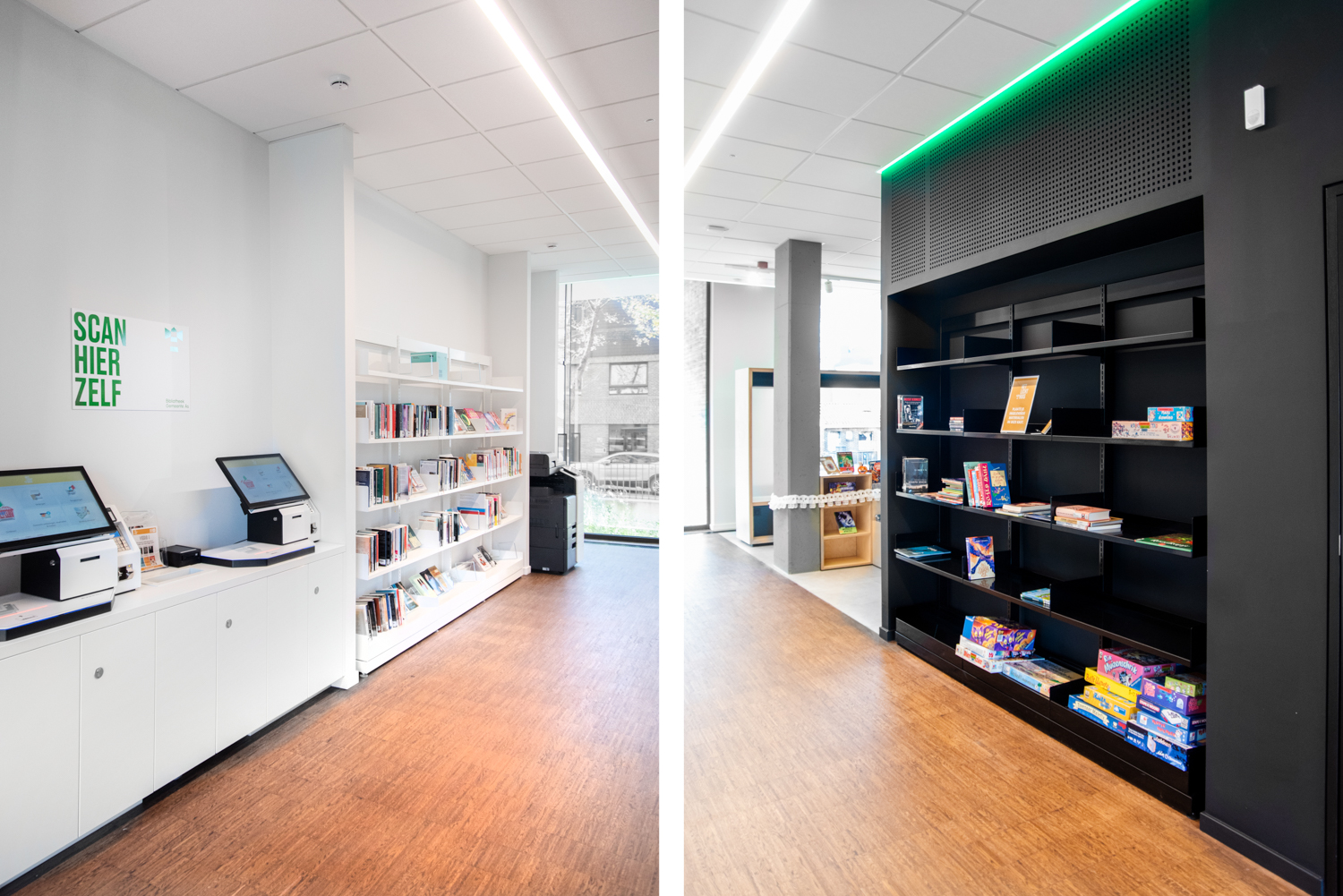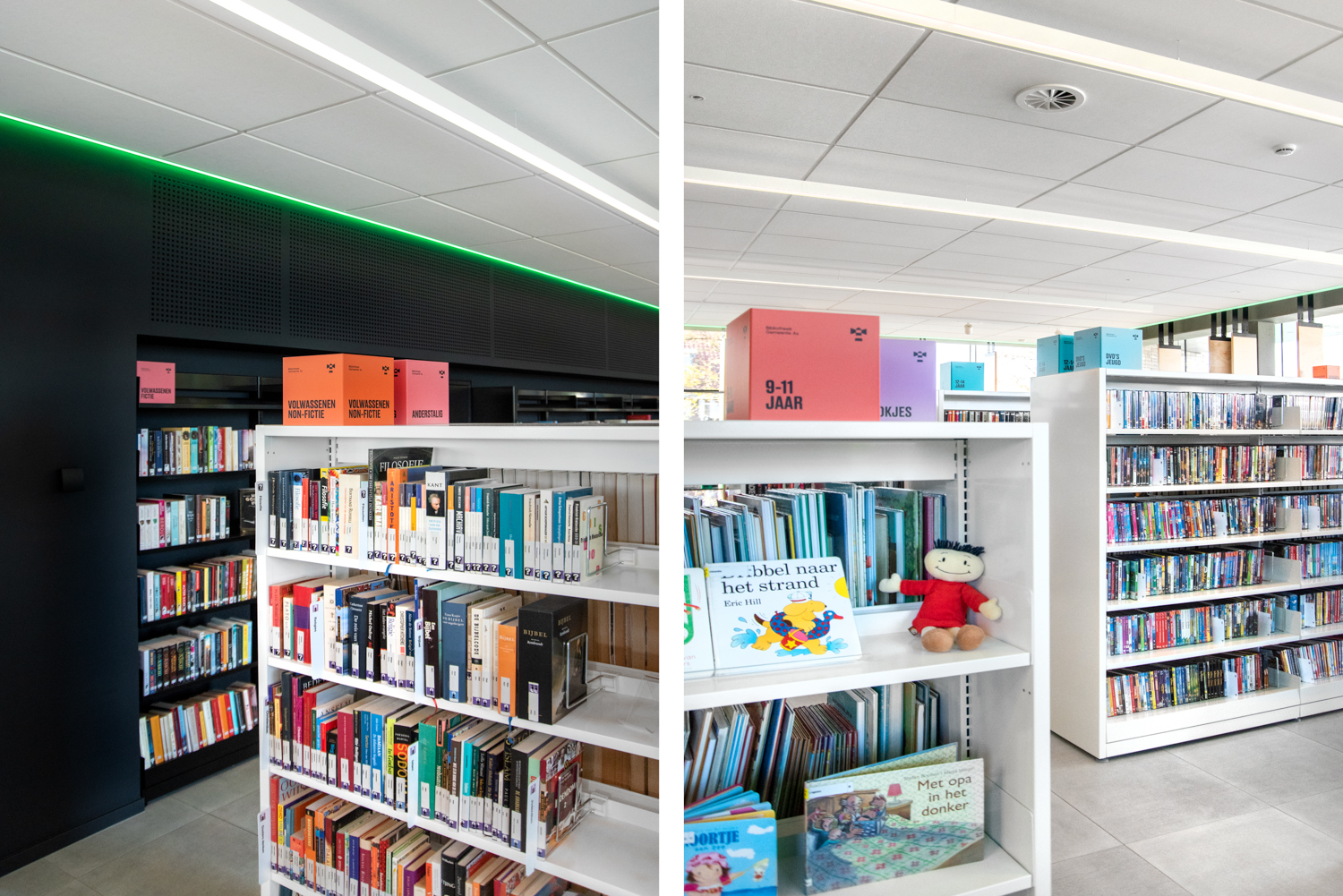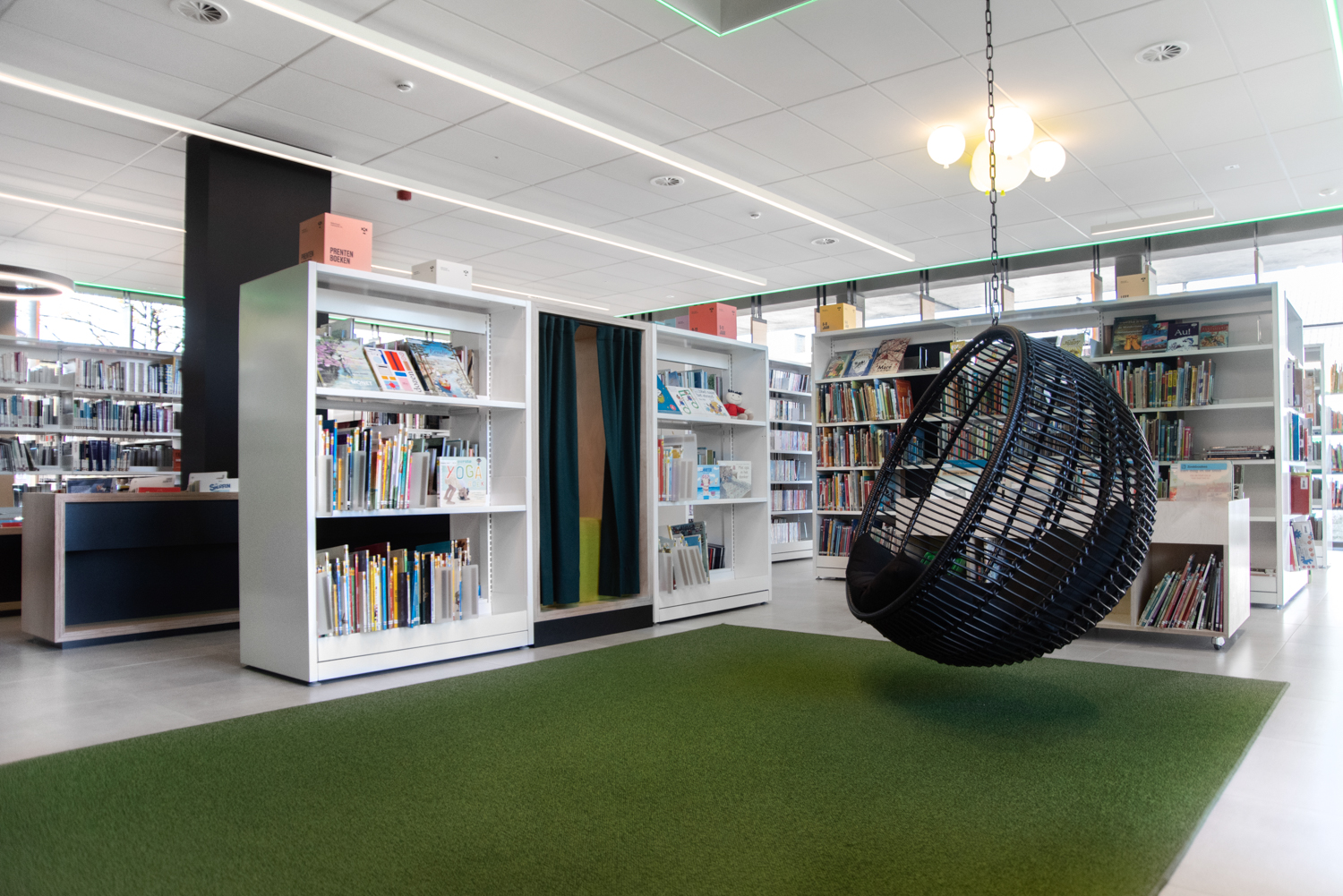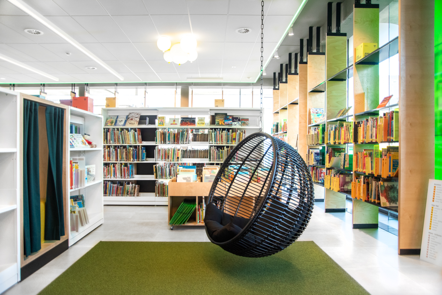 De eenvoud in de zwart-witte rekkensystemen zorgt ervoor dat de boeken alle aandacht krijgen, terwijl de op maat gemaakte meubels warmte geven aan de bibliotheek. De gekleurde plexiglas indexblokken zorgen voor een frisse toets en mooie lichteffecten. De vele grote ramen zorgen ervoor dat de bibliotheek de hele dag in het daglicht baadt.