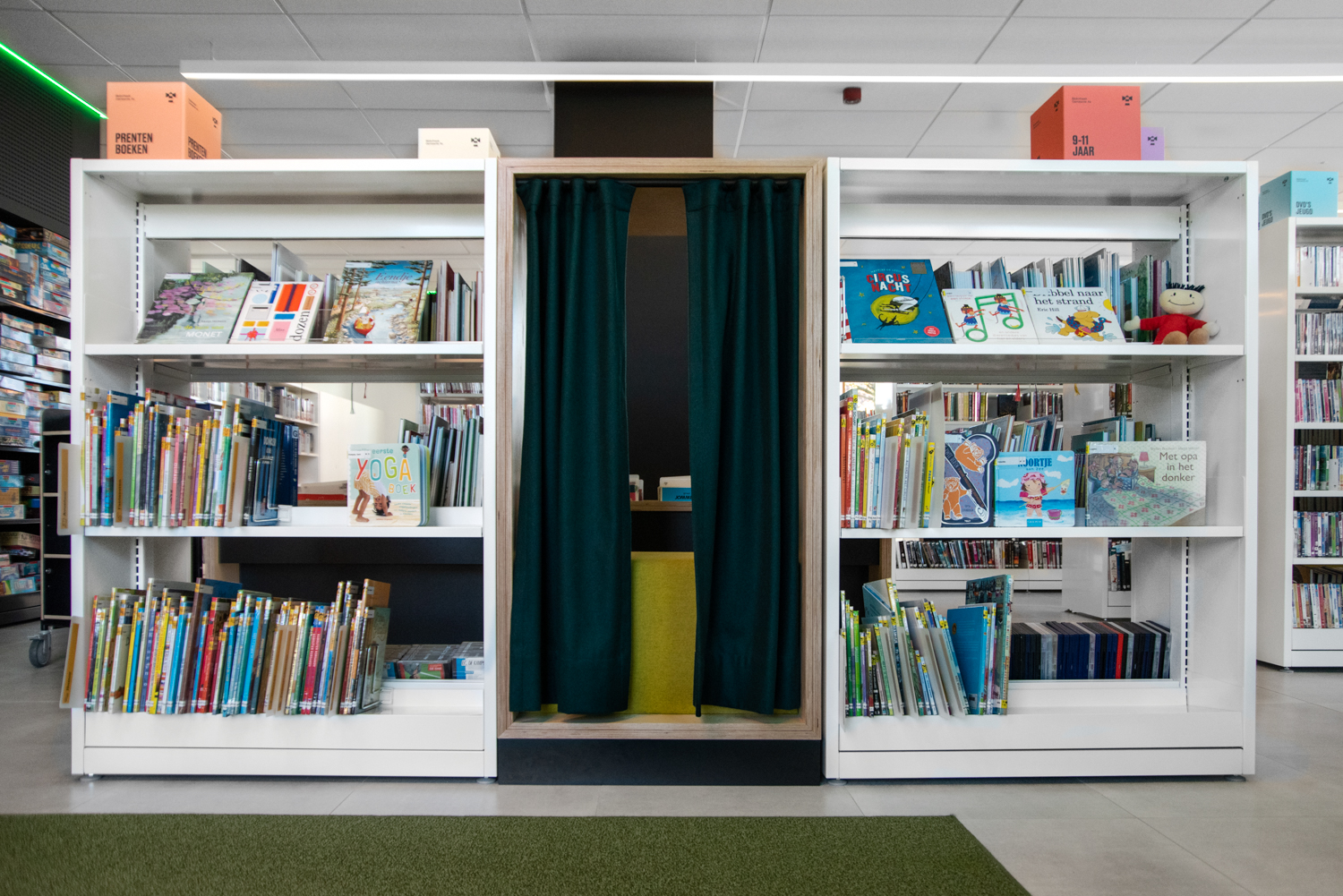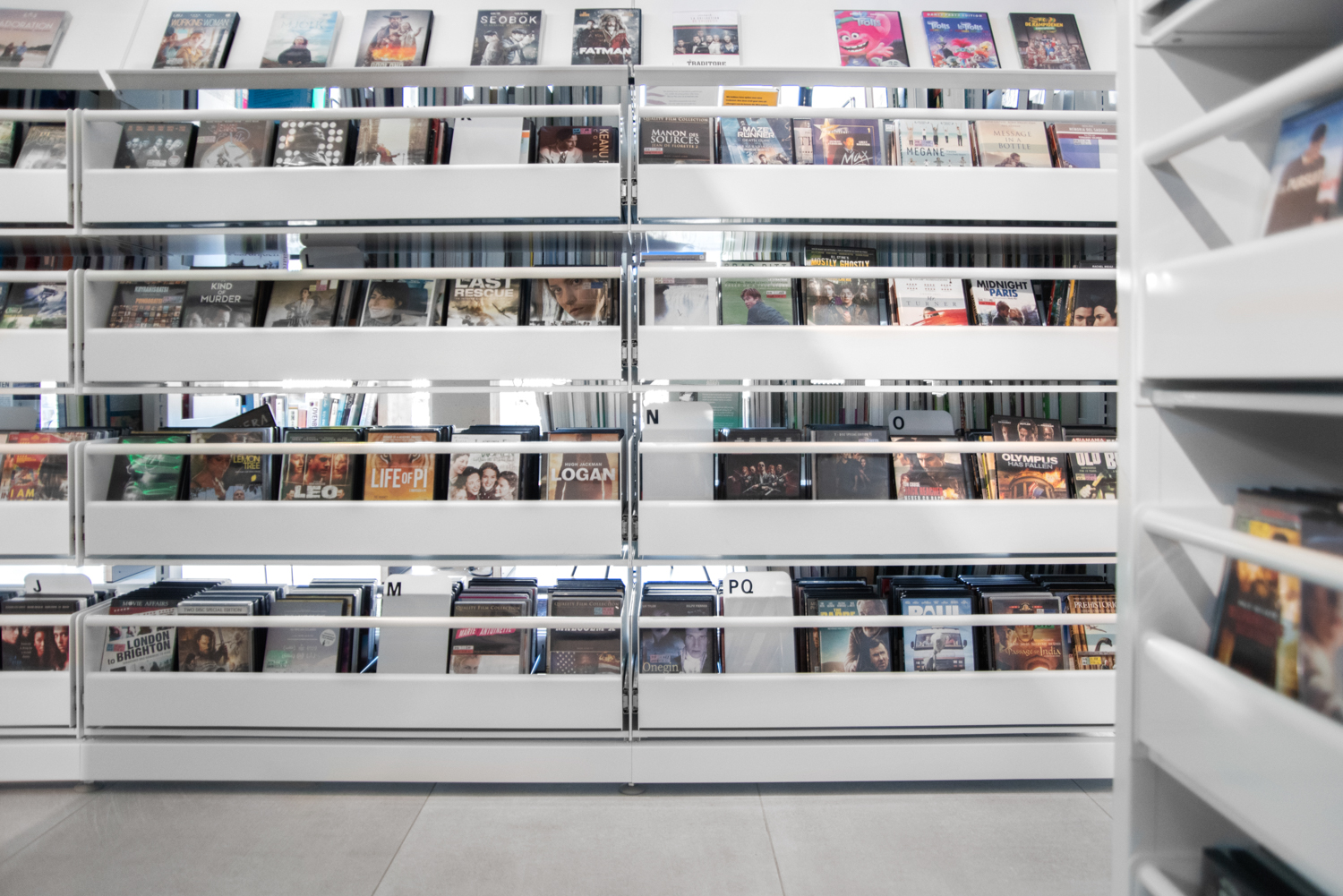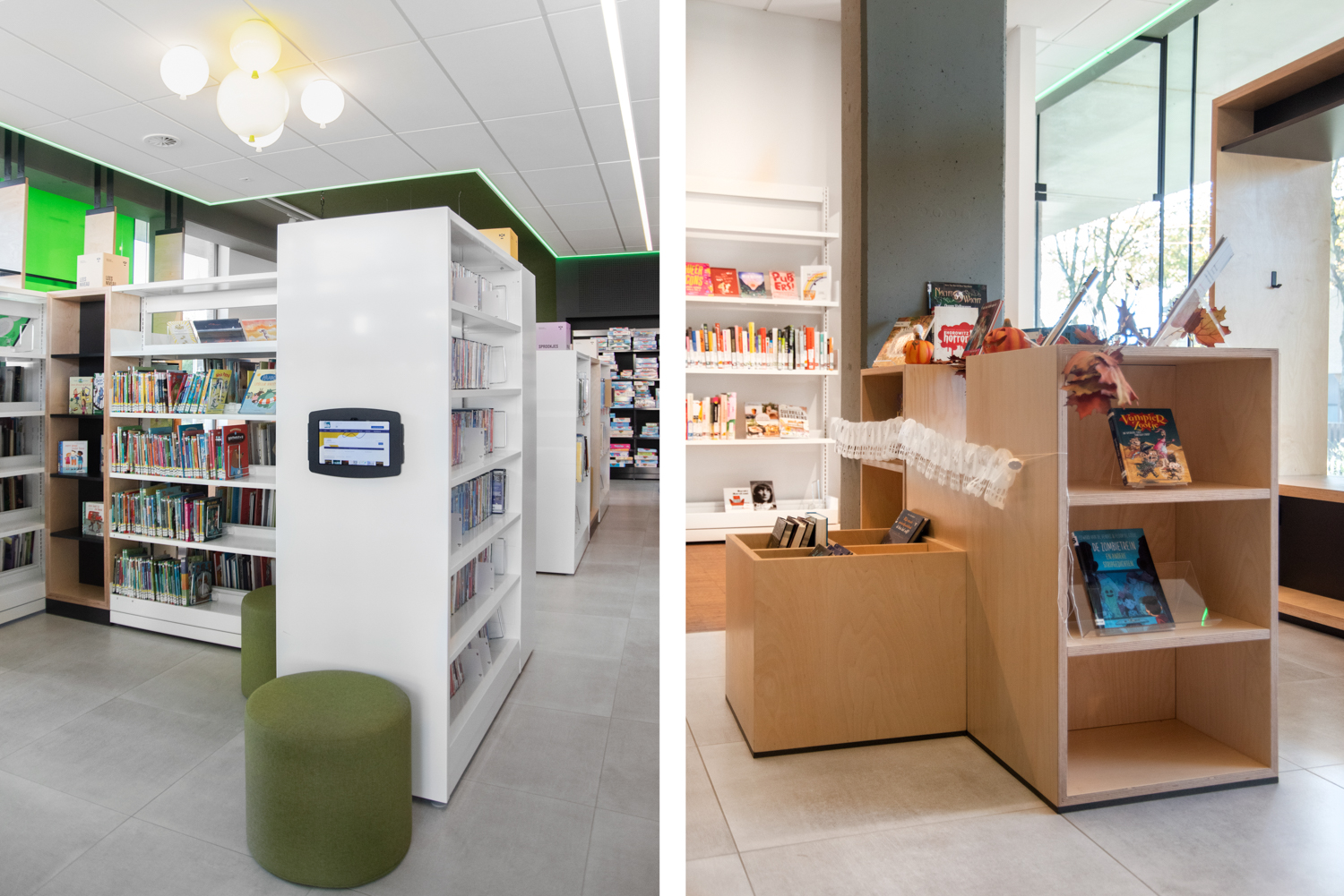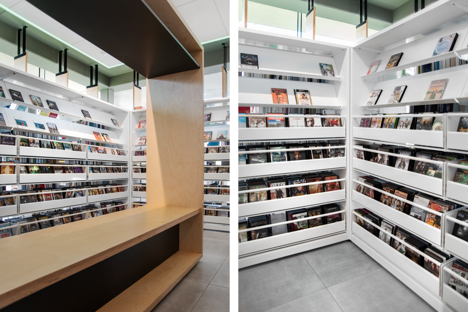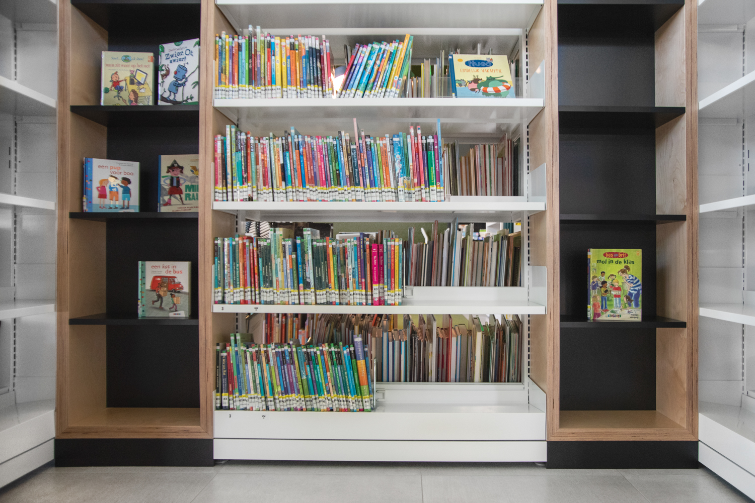 Het onderste legbord van een aantal van de rekken loopt schuin af, zodat boeken die op het onderste legbord zijn geplaatst gemakkelijk kunnen worden bekeken. Er is voldoende ruimte voor de presentatie van nieuwigheden en themastands.