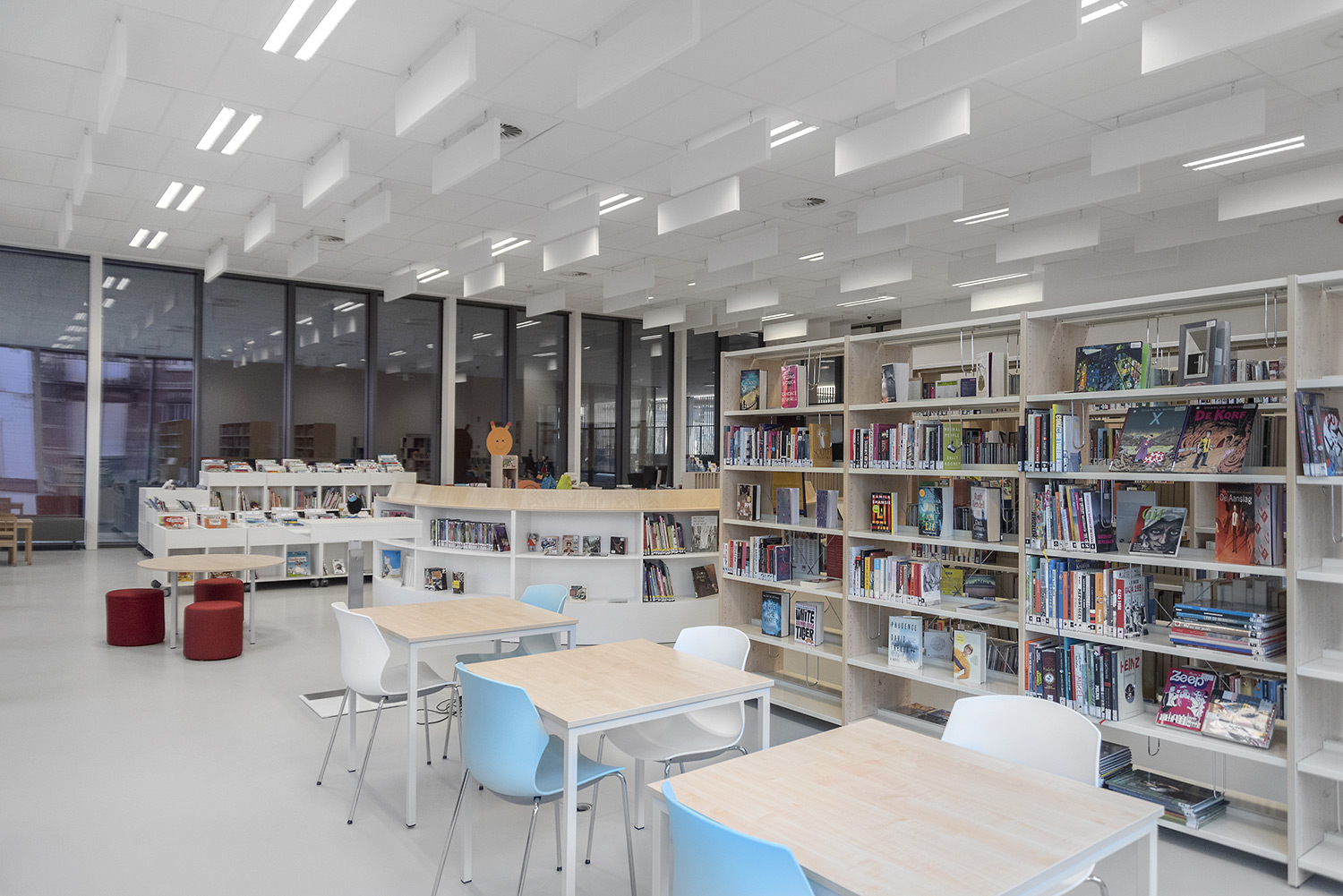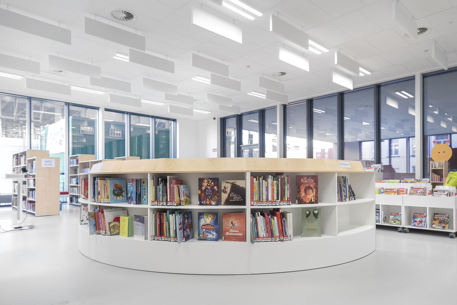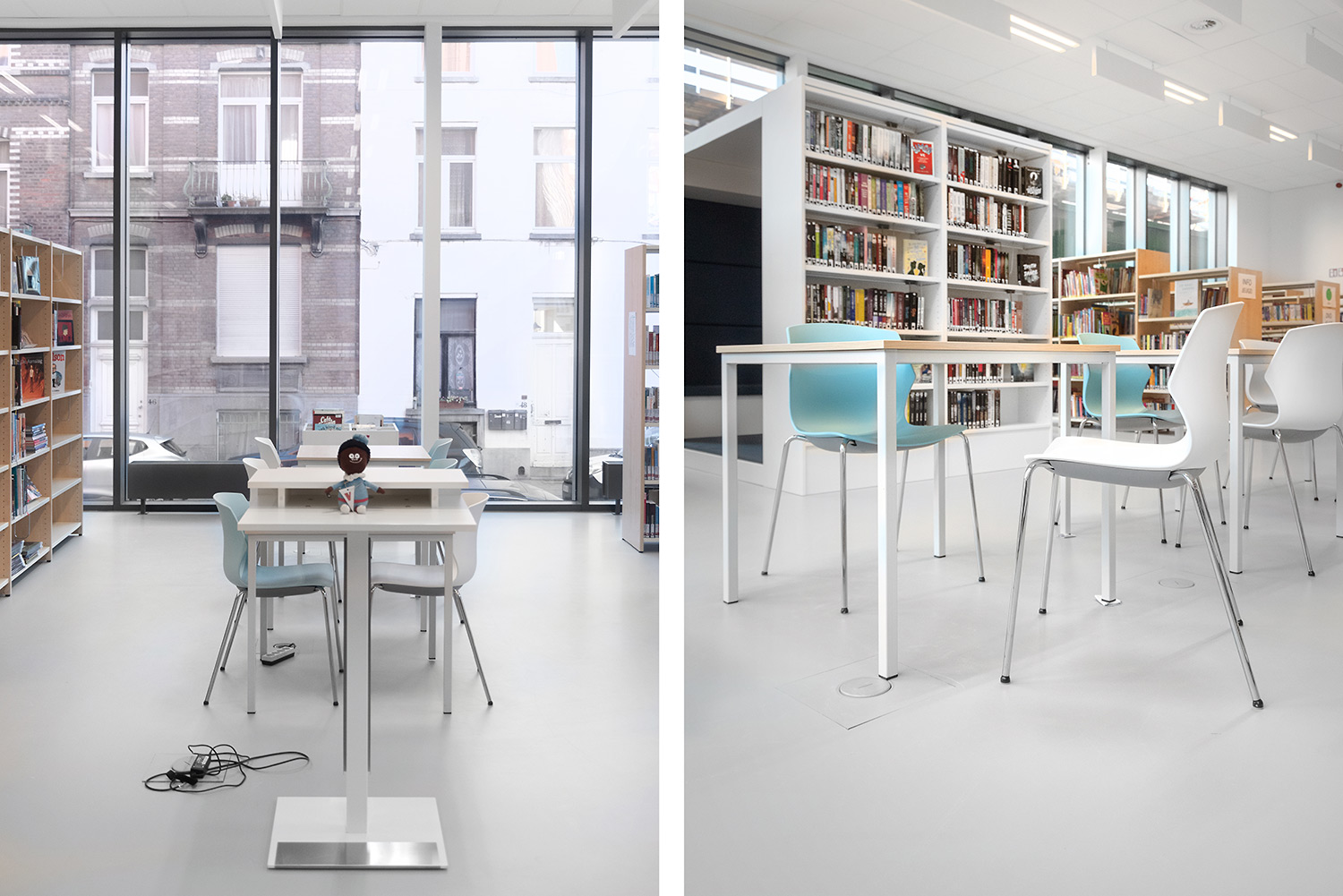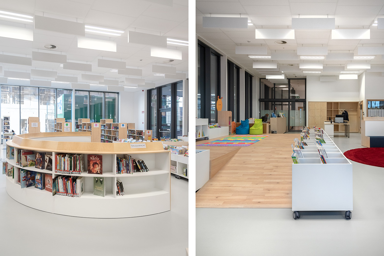 Bibliothecaris Nathalie Cools: "We kozen voor duidelijke zones: de babyhoek met een podium, de tienerhoek met de Cocoon en centraal de grote voorleescirkel. Kleuraccenten halen we uit de collectie zelf en door vrolijke toetsen zoals bijvoorbeeld een speelmat. De lezers zijn zeer tevreden over de nieuwe bibliotheek. De collectie komt goed tot haar recht en de bib wordt, als een onzichtbare entiteit, je tweede thuis. Wij kozen voor Schulz voor de bewezen kwaliteit en omdat de stijl van Schulz aanleunt bij de bibliotheek die we wilden vormgeven."