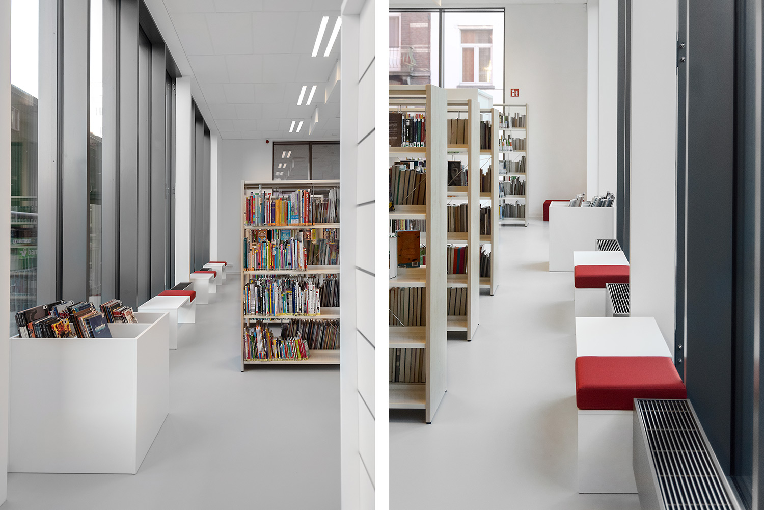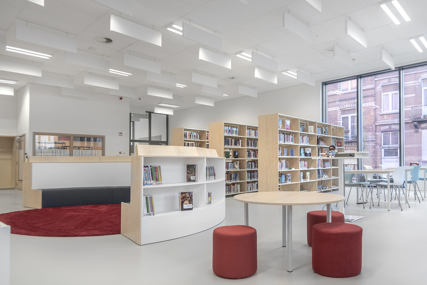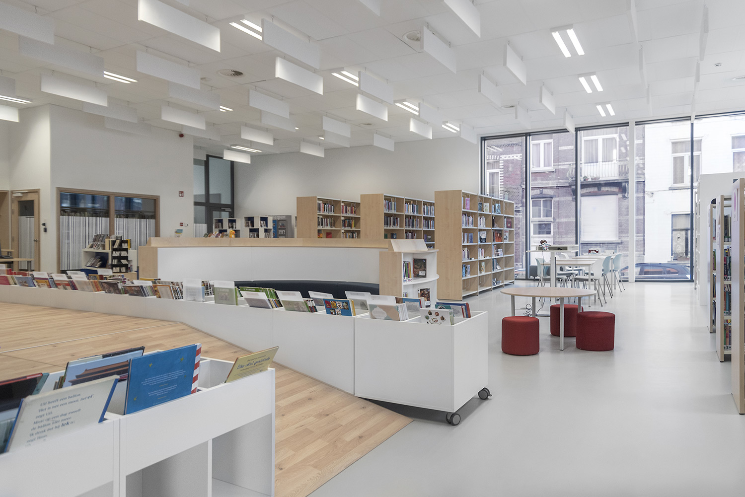 Bibliothecaris Nathalie Cools: "We kozen voor duidelijke zones: de babyhoek met een podium, de tienerhoek met de Cocoon en centraal de grote voorleescirkel. Kleuraccenten halen we uit de collectie zelf en door vrolijke toetsen zoals bijvoorbeeld een speelmat. De lezers zijn zeer tevreden over de nieuwe bibliotheek. De collectie komt goed tot haar recht en de bib wordt, als een onzichtbare entiteit, je tweede thuis. Wij kozen voor Schulz voor de bewezen kwaliteit en omdat de stijl van Schulz aanleunt bij de bibliotheek die we wilden vormgeven."