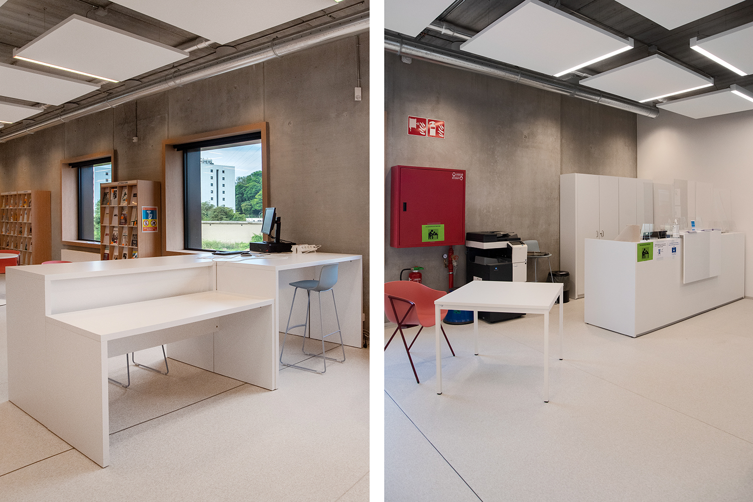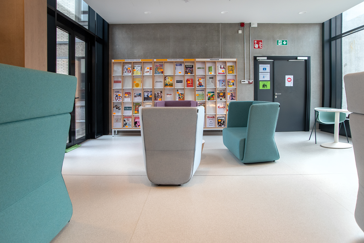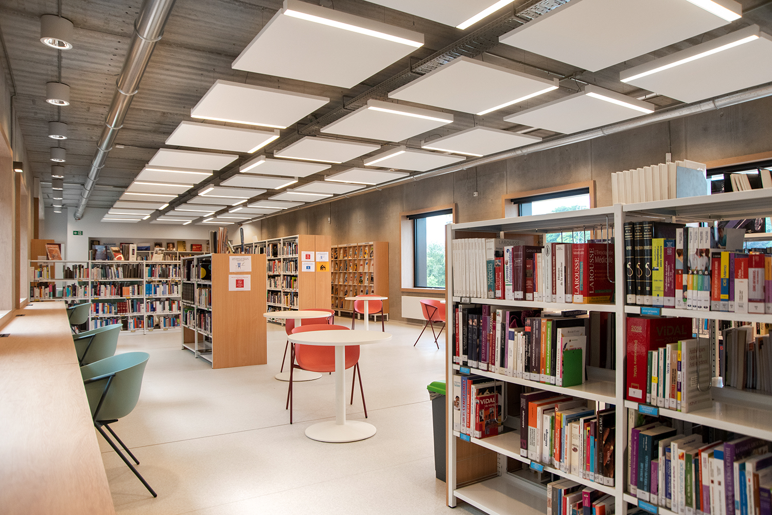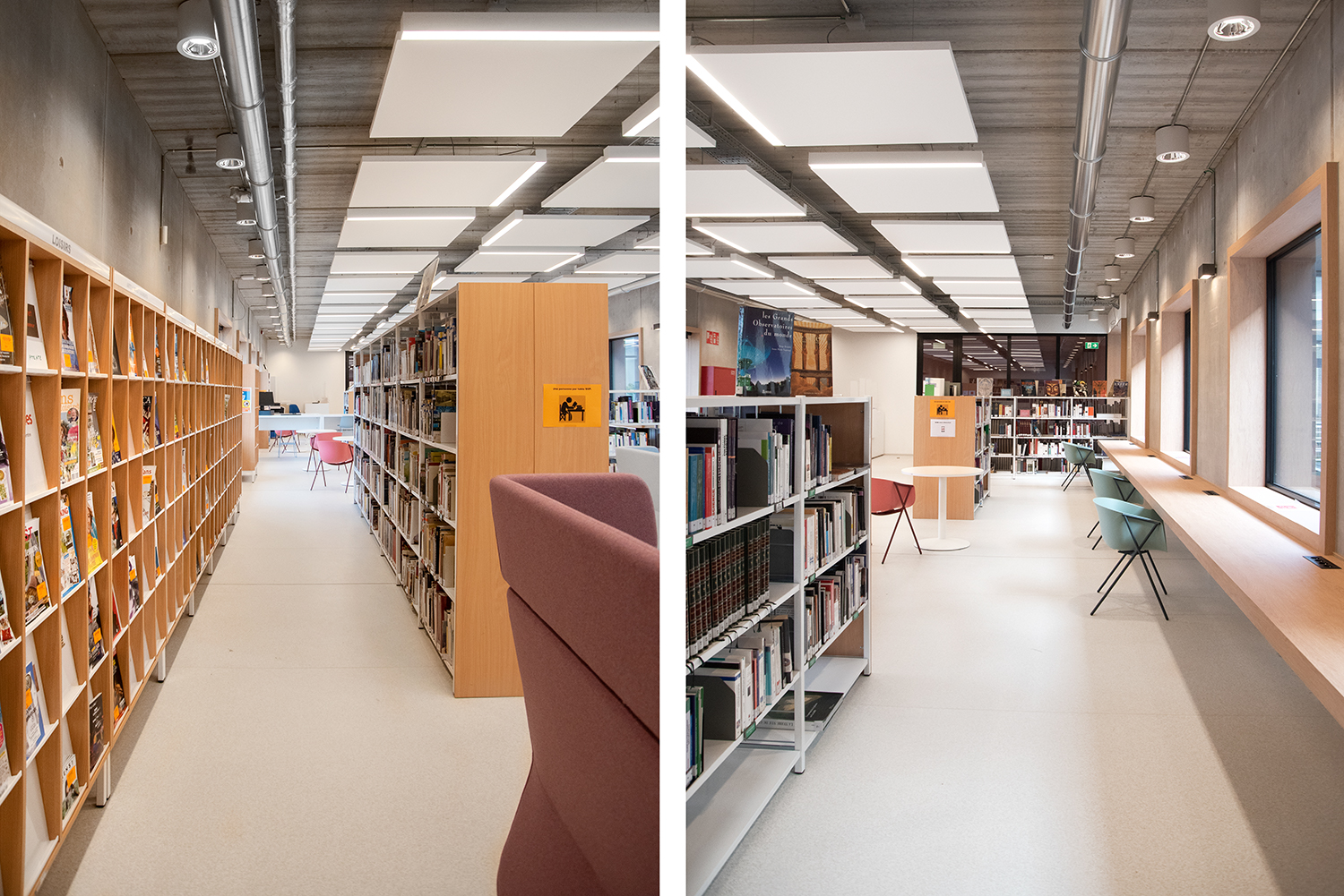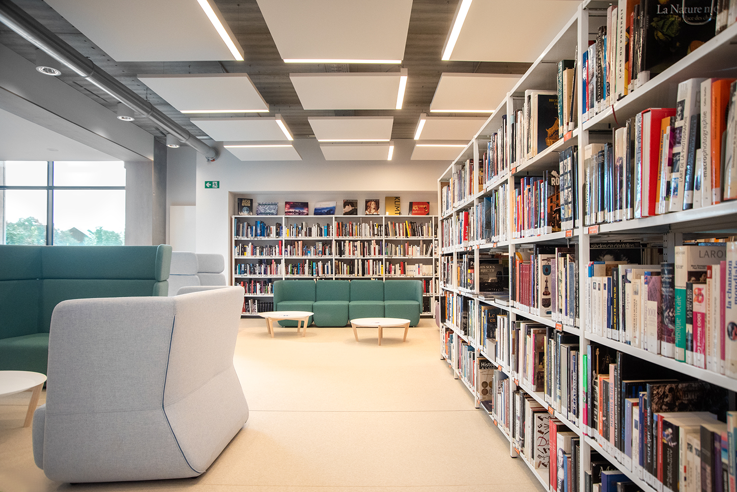 Bijzondere aandacht is besteed aan de materiaalkeuze en hun duurzaamheid. Het resultaat: een gezellig en verfijnd interieur. Het publiek waardeert het comfortabele en lichte interieur, waar je je goed voelt. Mevrouw Rossi citeert Gaston Bachelard om het belang van een hedendaagse bibliotheek te benadrukken: "Het paradijs is, zonder enige twijfel, slechts een enorme bibliotheek".