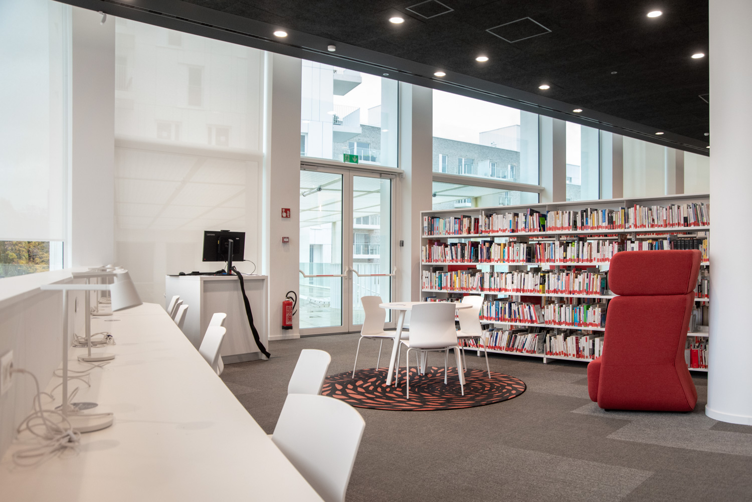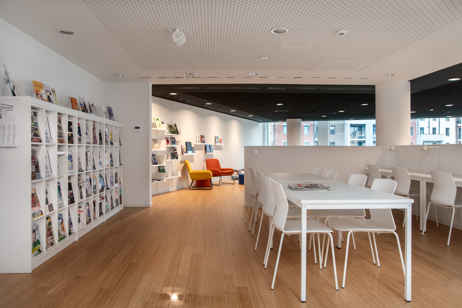 De indeling van de bibliotheek is zo ontworpen dat de sfeer en functie van de ruimte meteen duidelijk zijn. Grote ramen bieden uitzicht op het park, en de flexibele inrichting maakt verschillende gebruiksmogelijkheden mogelijk.