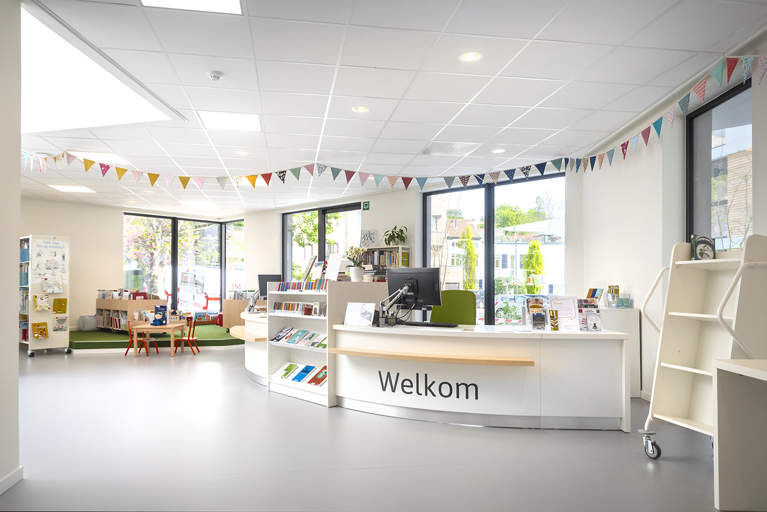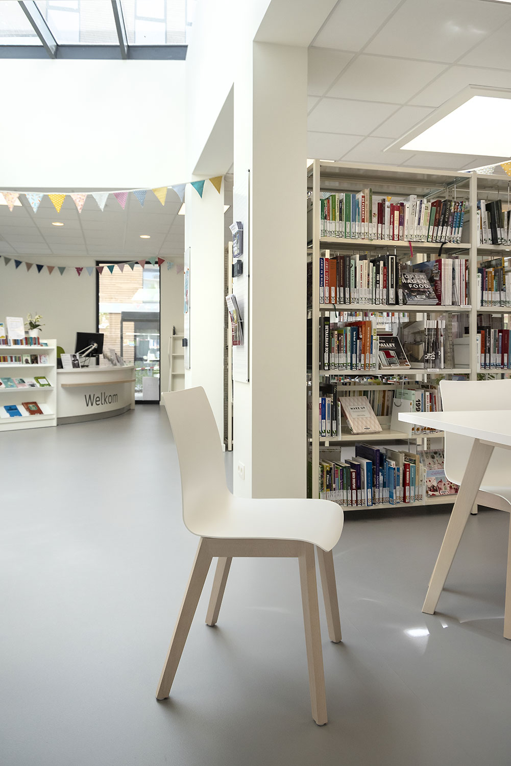 Voor de nieuwe bib koos men resoluut voor kleurenharmonie: witte muren en rekken, afgewisseld met toetsen berkenhout. De bezoekers waarderen het daglicht, de esthetiek en gezelligheid van de huiselijke inrichting en blijven dan ook graag wat langer hangen. De bib als een warme huiskamer in de stad…