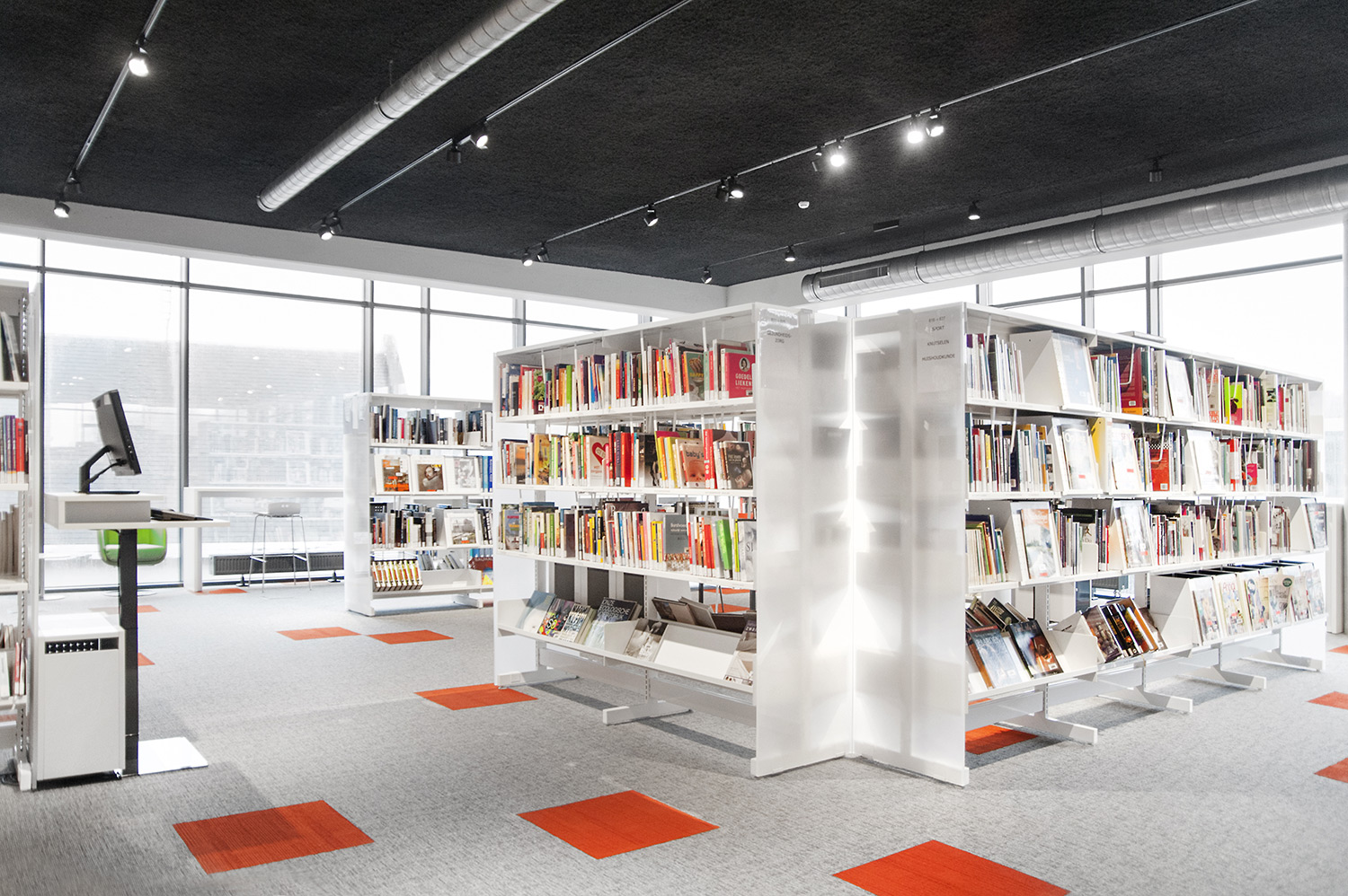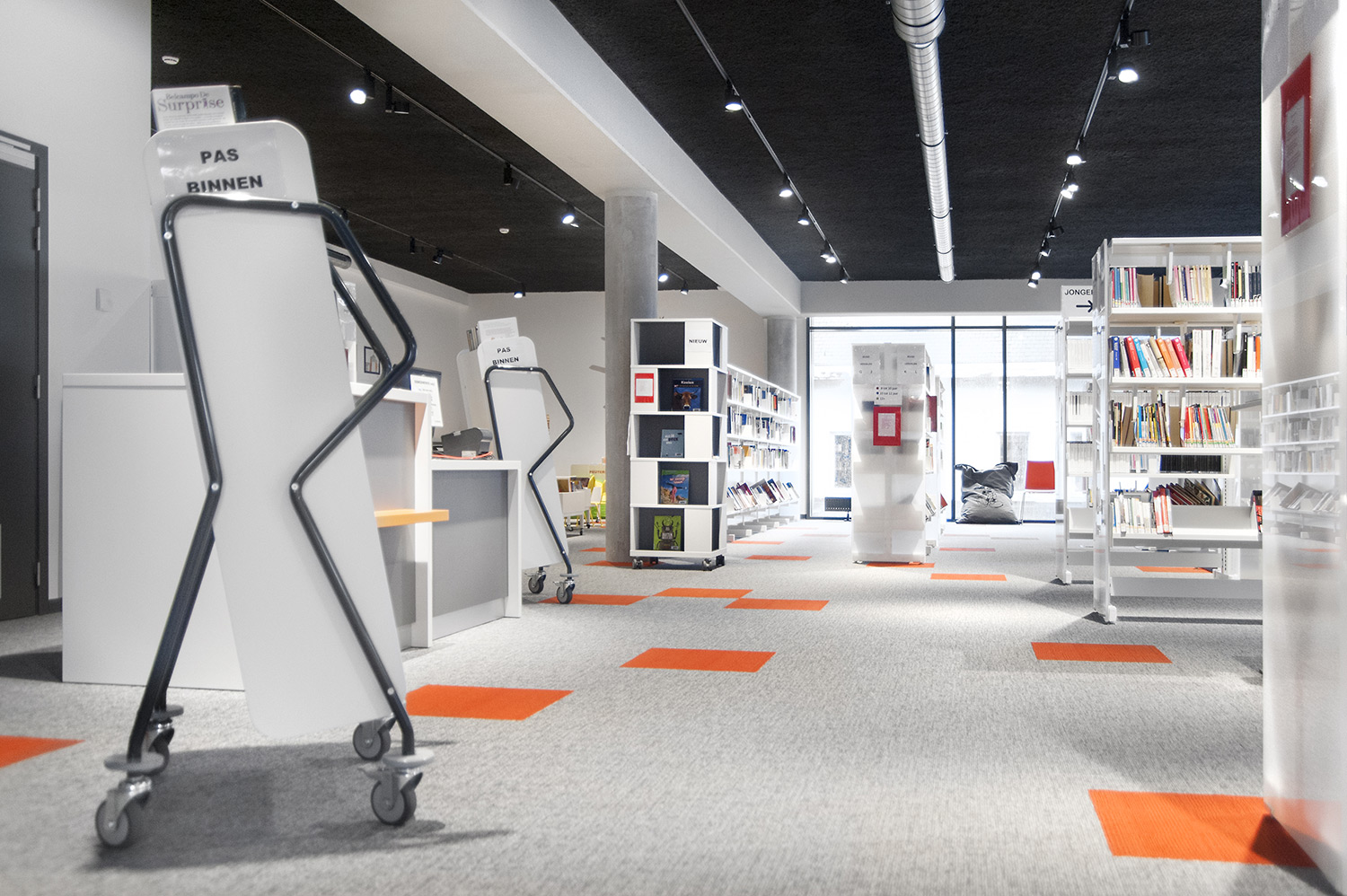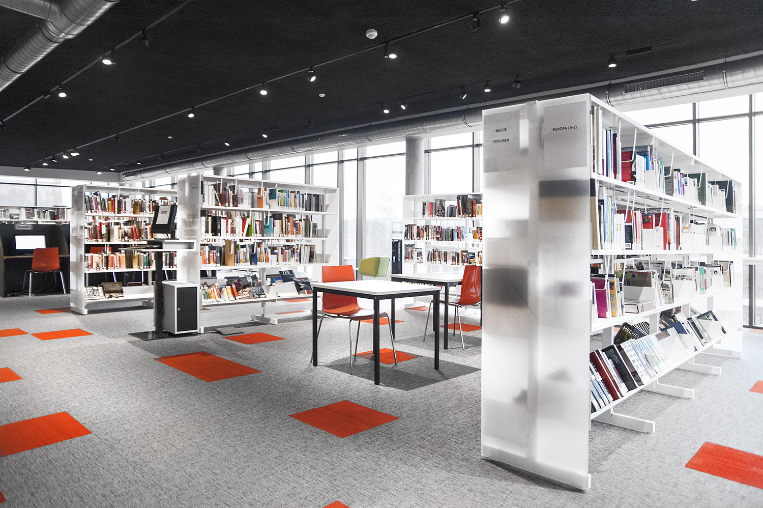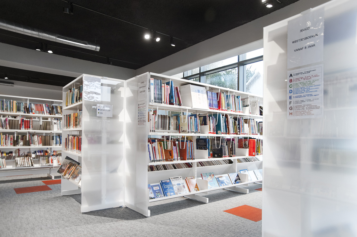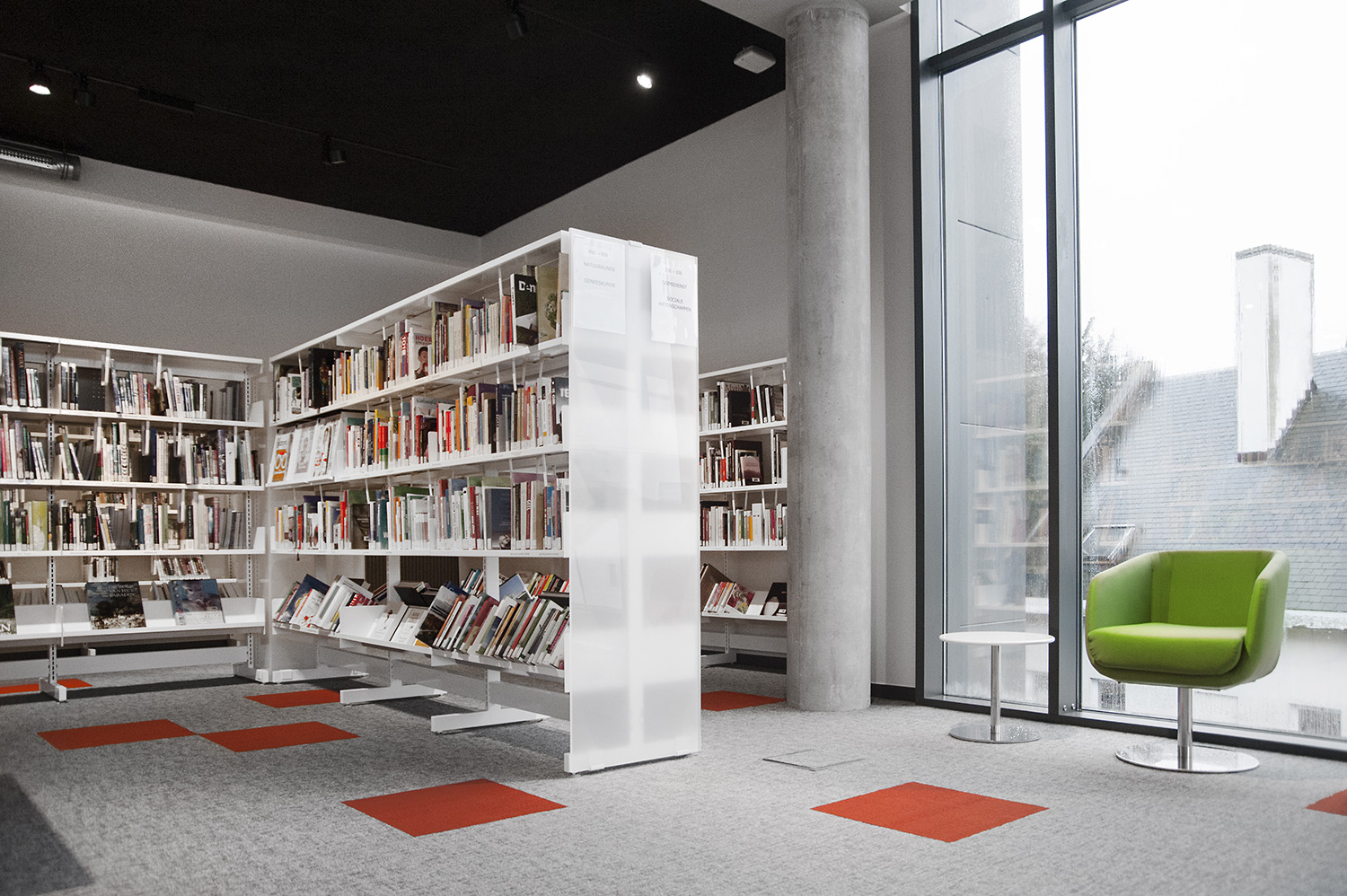 Speciale aandacht ging uit naar een ergonomische rekinvulling, de hoek voor de allerkleinsten en voldoende zit-, lees- en werkplaatsen. Het zwarte plafond contrasteert mooi met het wit meubilair, dat door zijn beperkte hoogte en strak design de ruimte overzichtelijk vorm geeft.