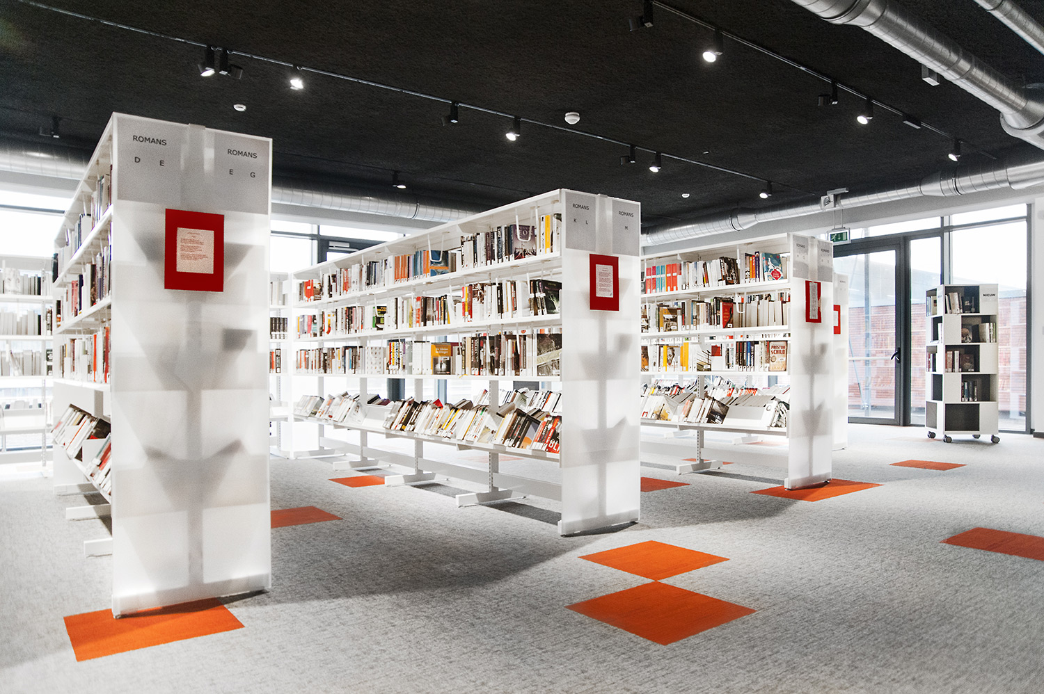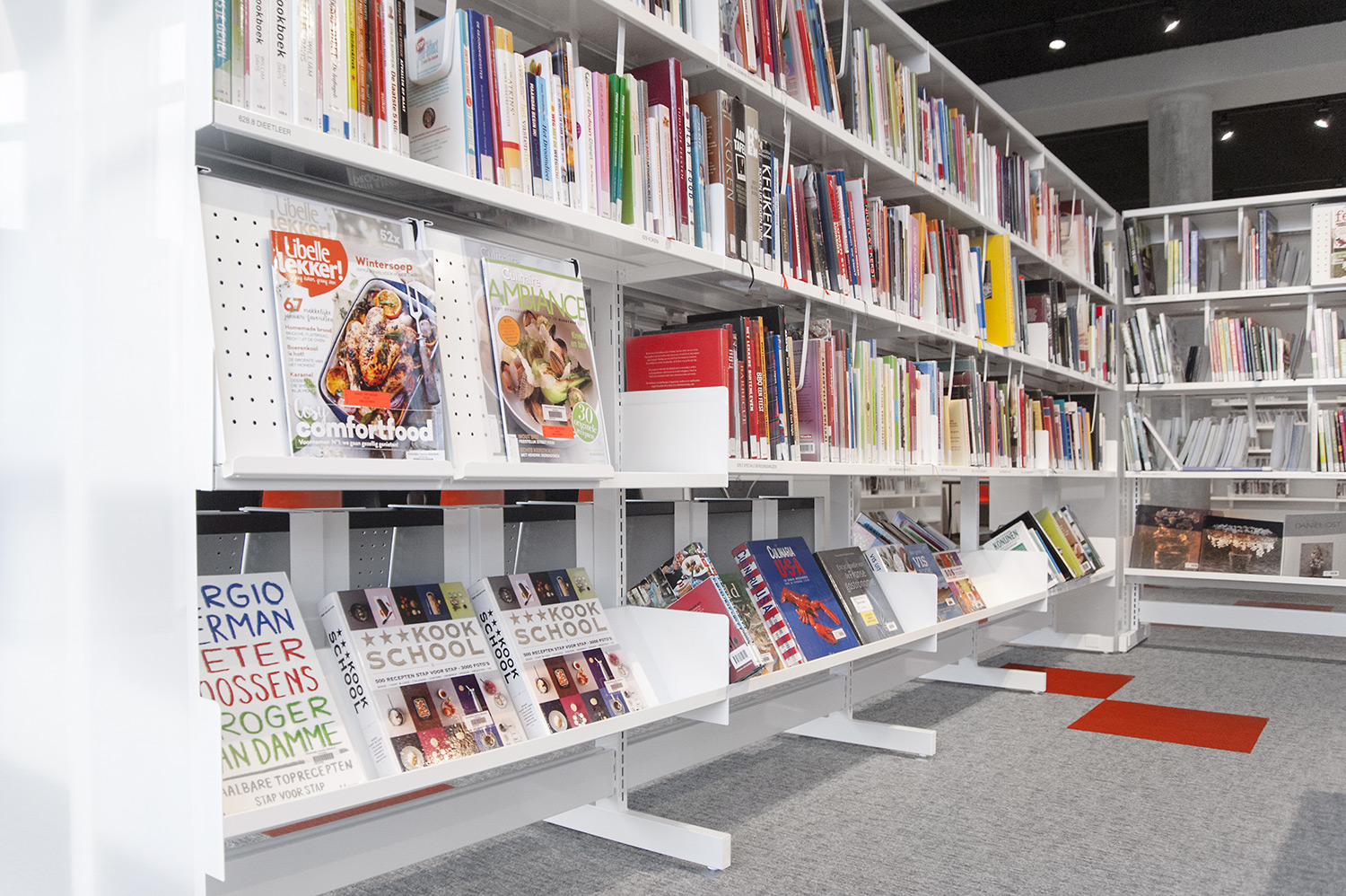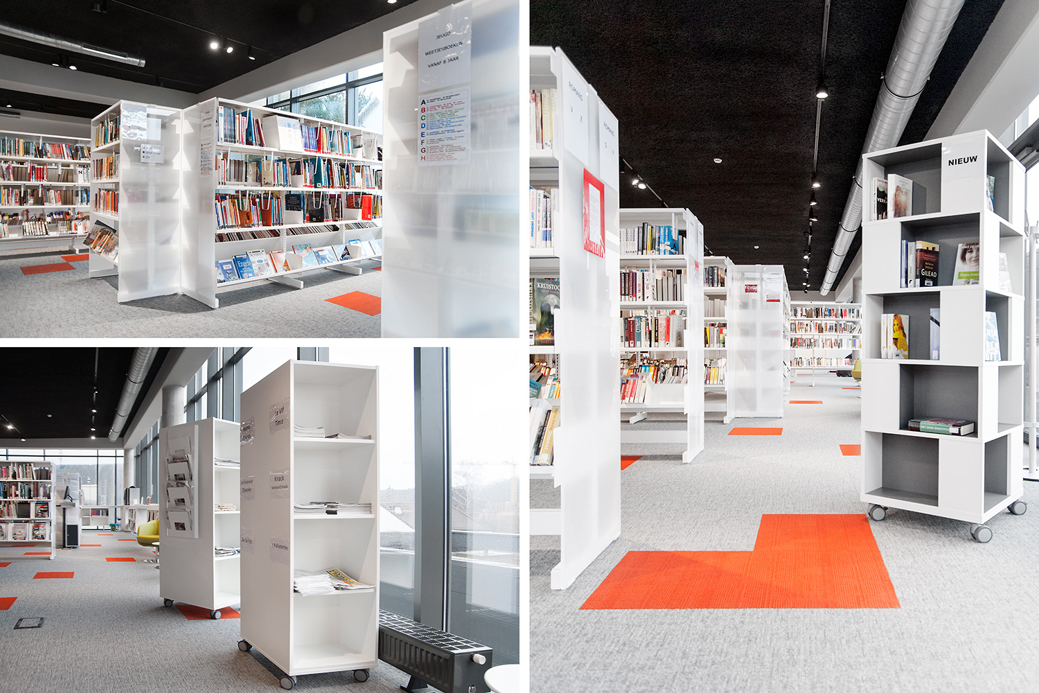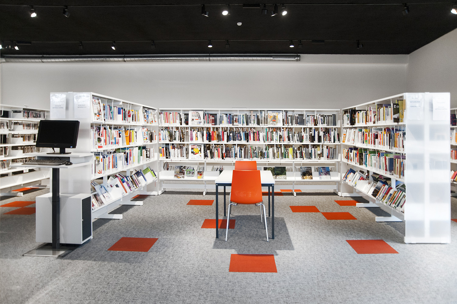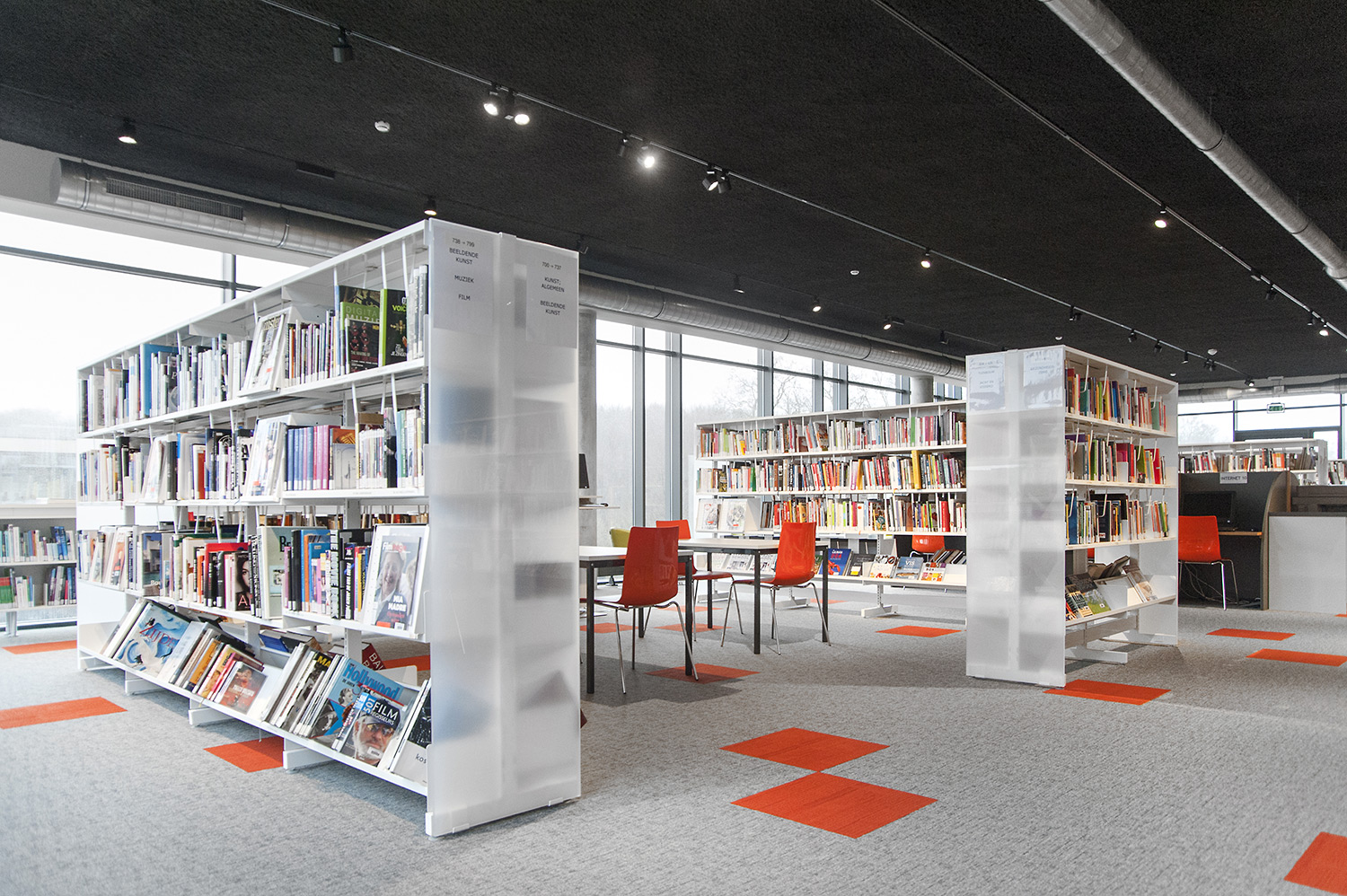 Speciale aandacht ging uit naar een ergonomische rekinvulling, de hoek voor de allerkleinsten en voldoende zit-, lees- en werkplaatsen. Het zwarte plafond contrasteert mooi met het wit meubilair, dat door zijn beperkte hoogte en strak design de ruimte overzichtelijk vorm geeft.