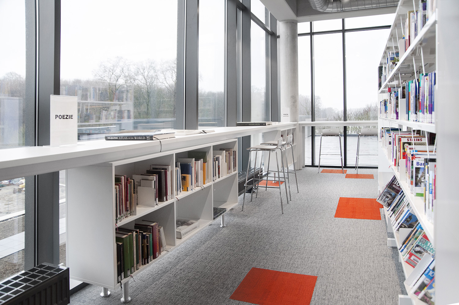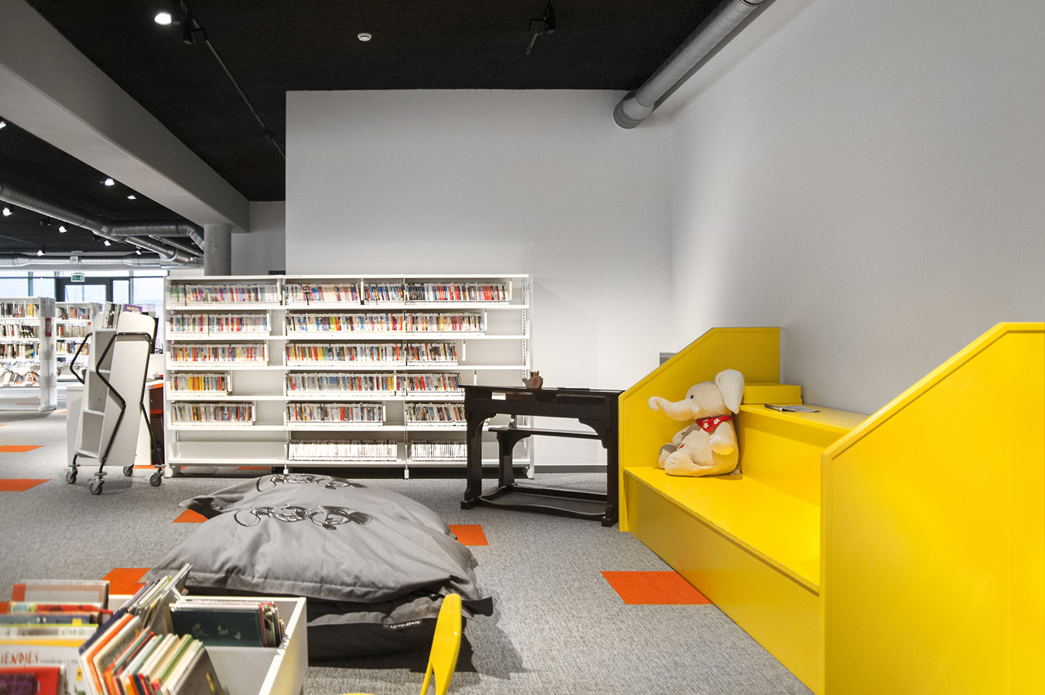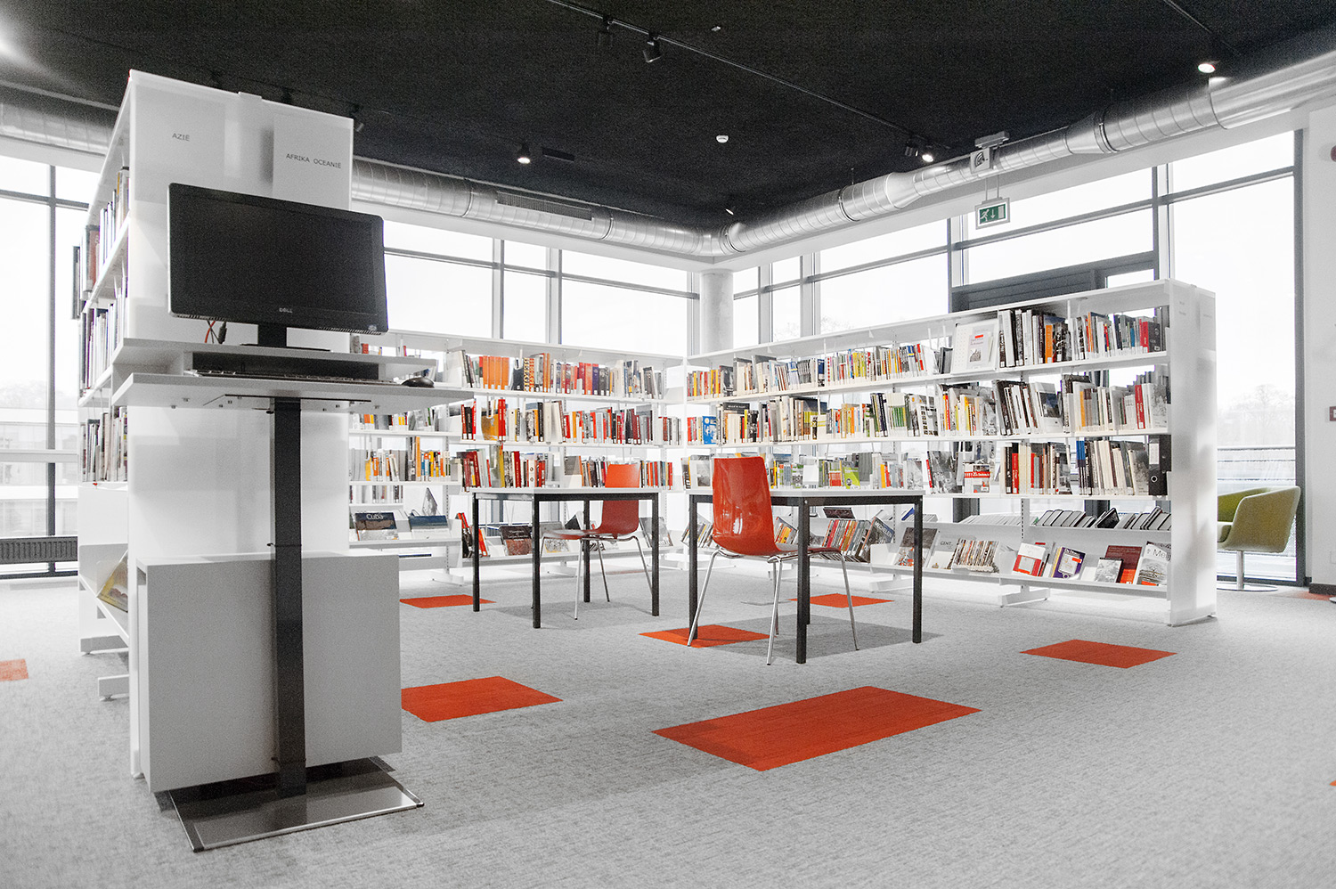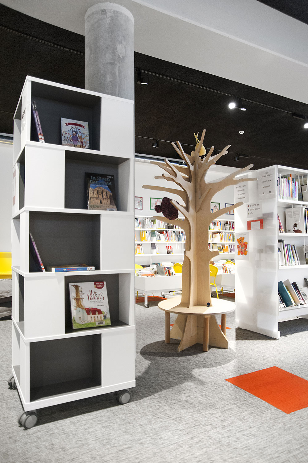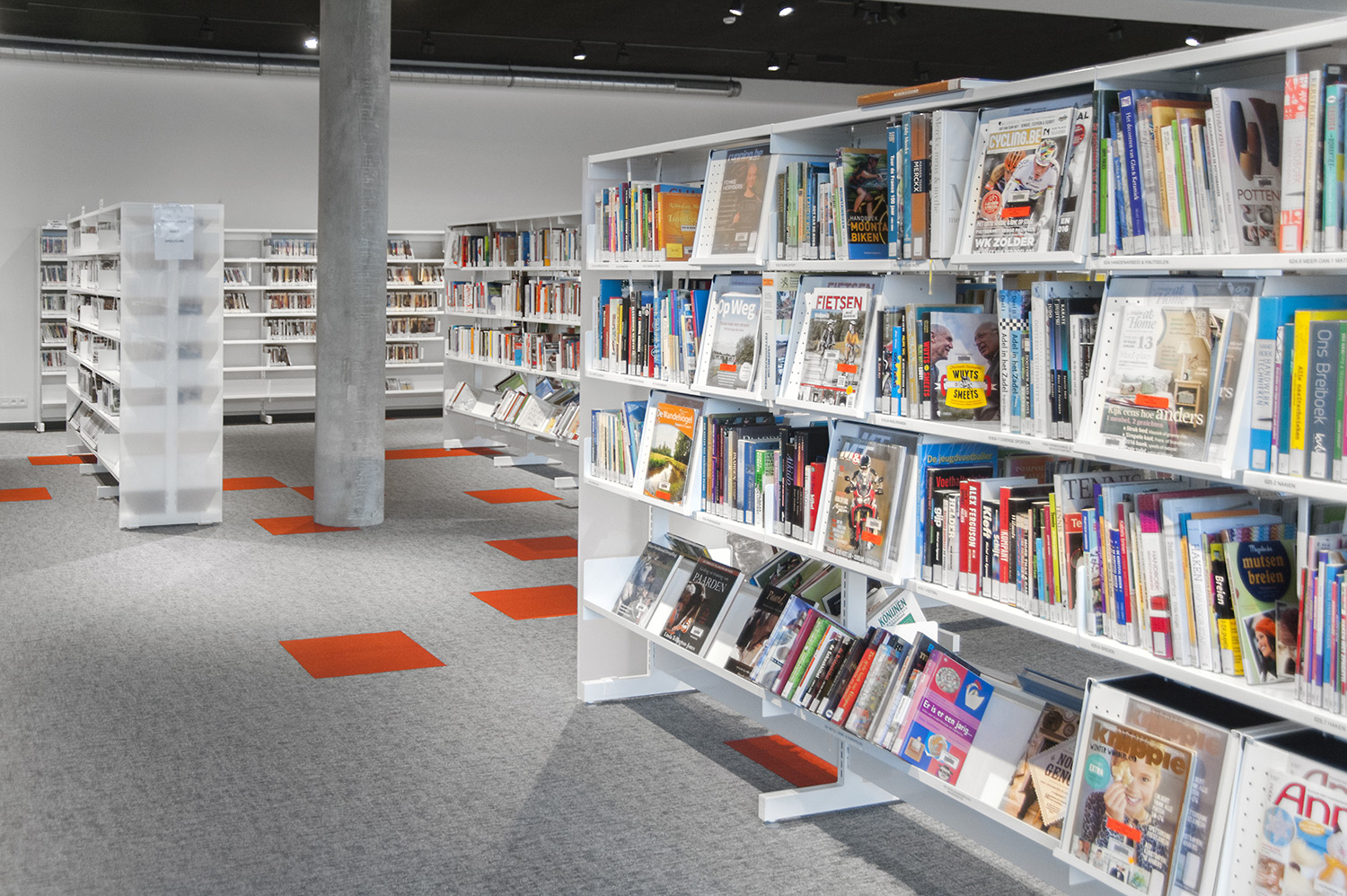 Speciale aandacht ging uit naar een ergonomische rekinvulling, de hoek voor de allerkleinsten en voldoende zit-, lees- en werkplaatsen. Het zwarte plafond contrasteert mooi met het wit meubilair, dat door zijn beperkte hoogte en strak design de ruimte overzichtelijk vorm geeft.