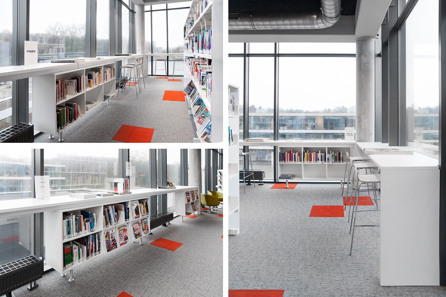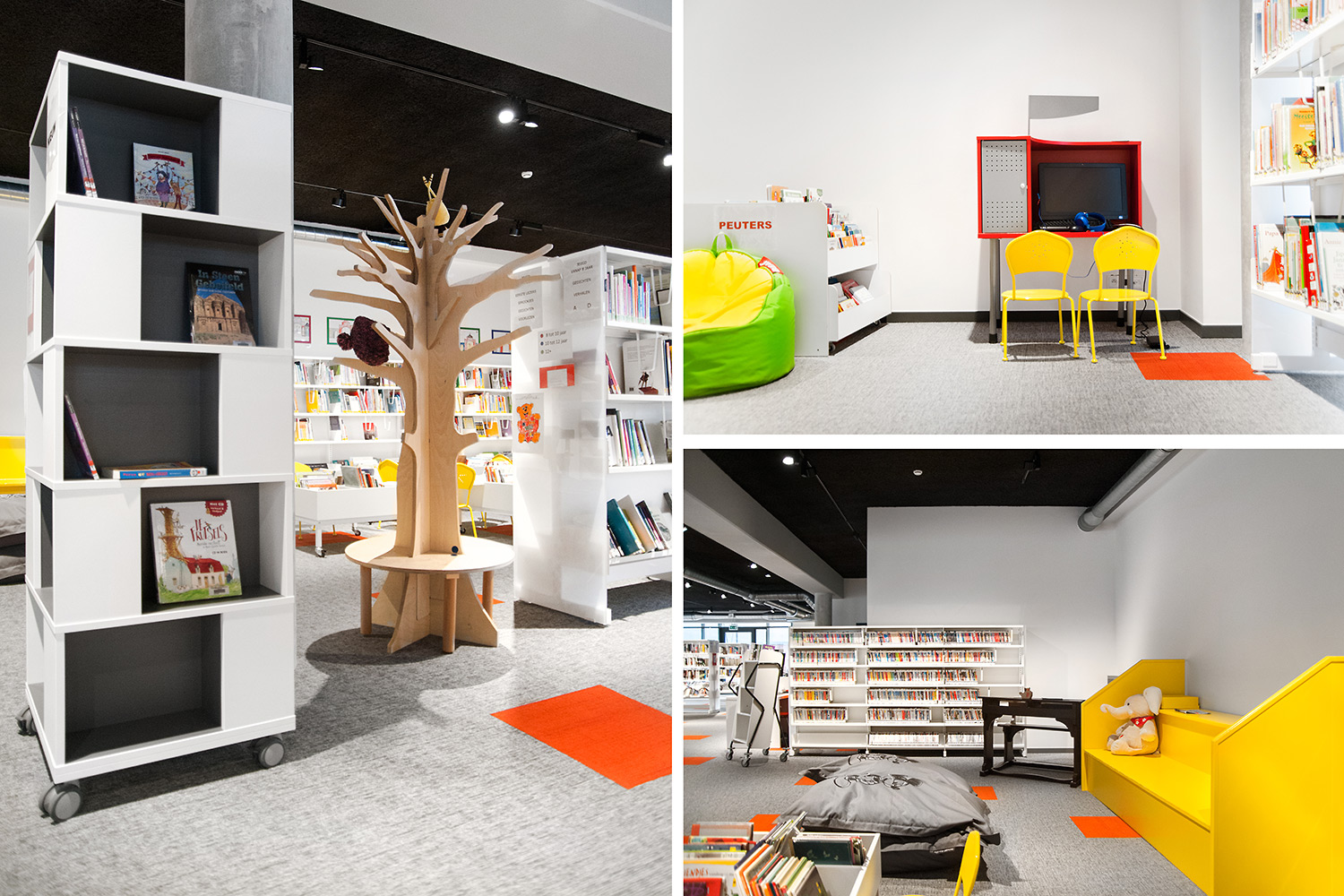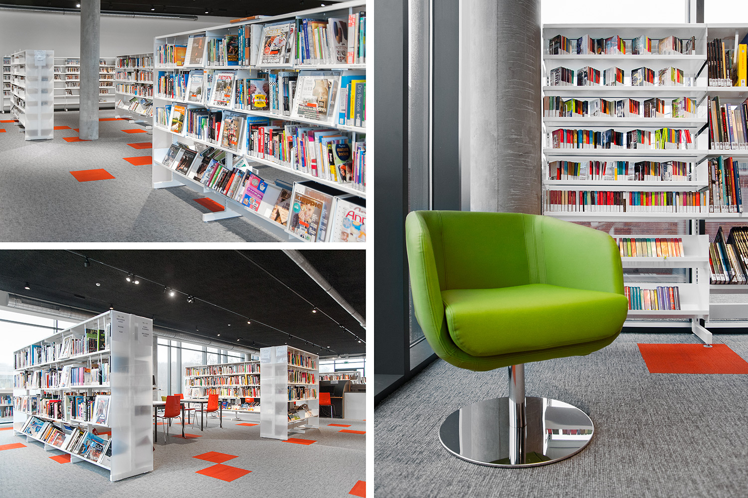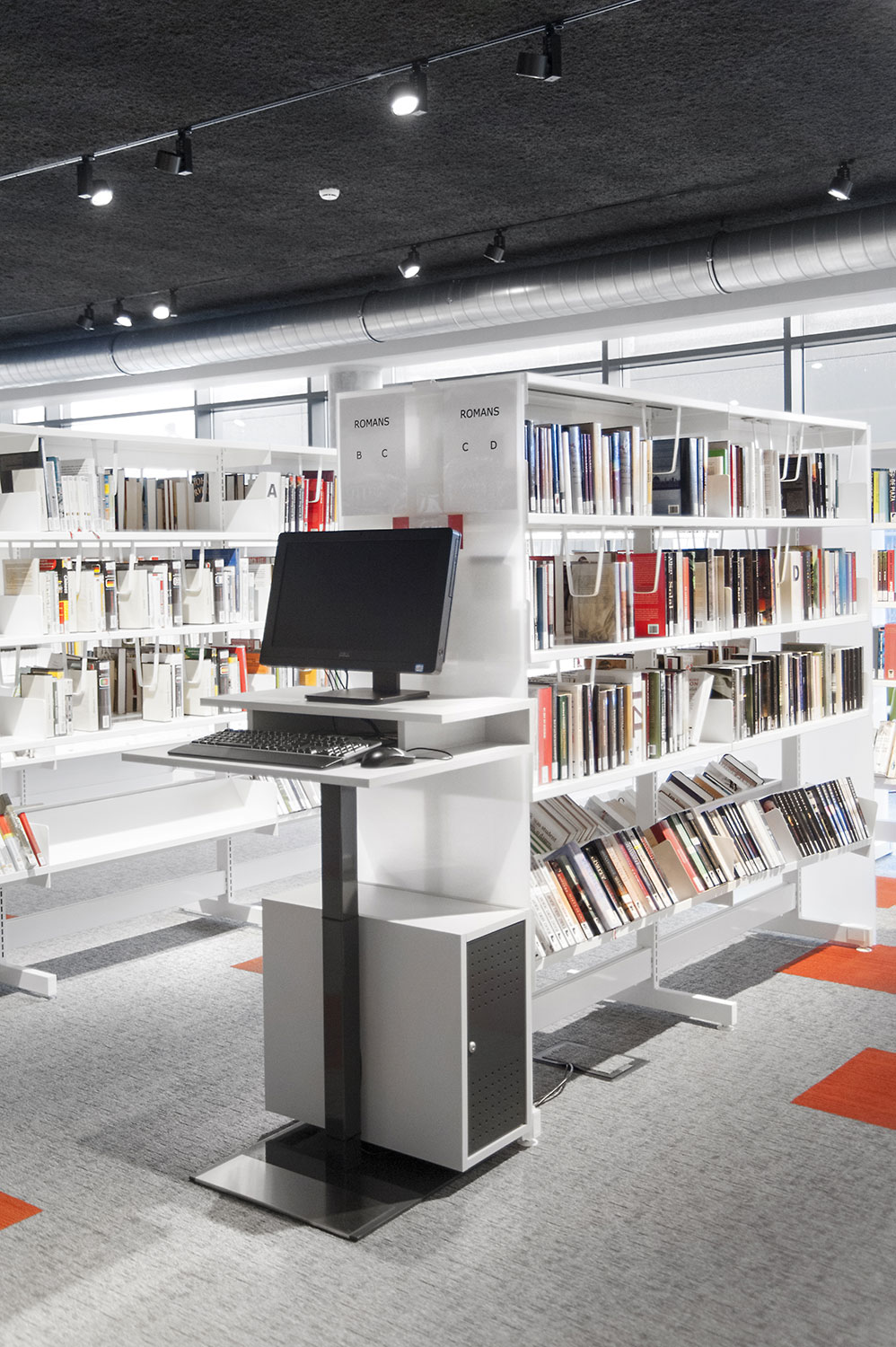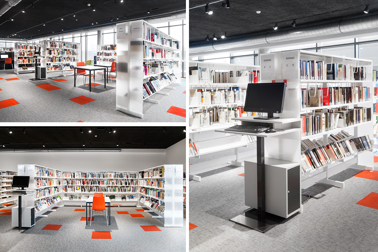 Speciale aandacht ging uit naar een ergonomische rekinvulling, de hoek voor de allerkleinsten en voldoende zit-, lees- en werkplaatsen. Het zwarte plafond contrasteert mooi met het wit meubilair, dat door zijn beperkte hoogte en strak design de ruimte overzichtelijk vorm geeft.
