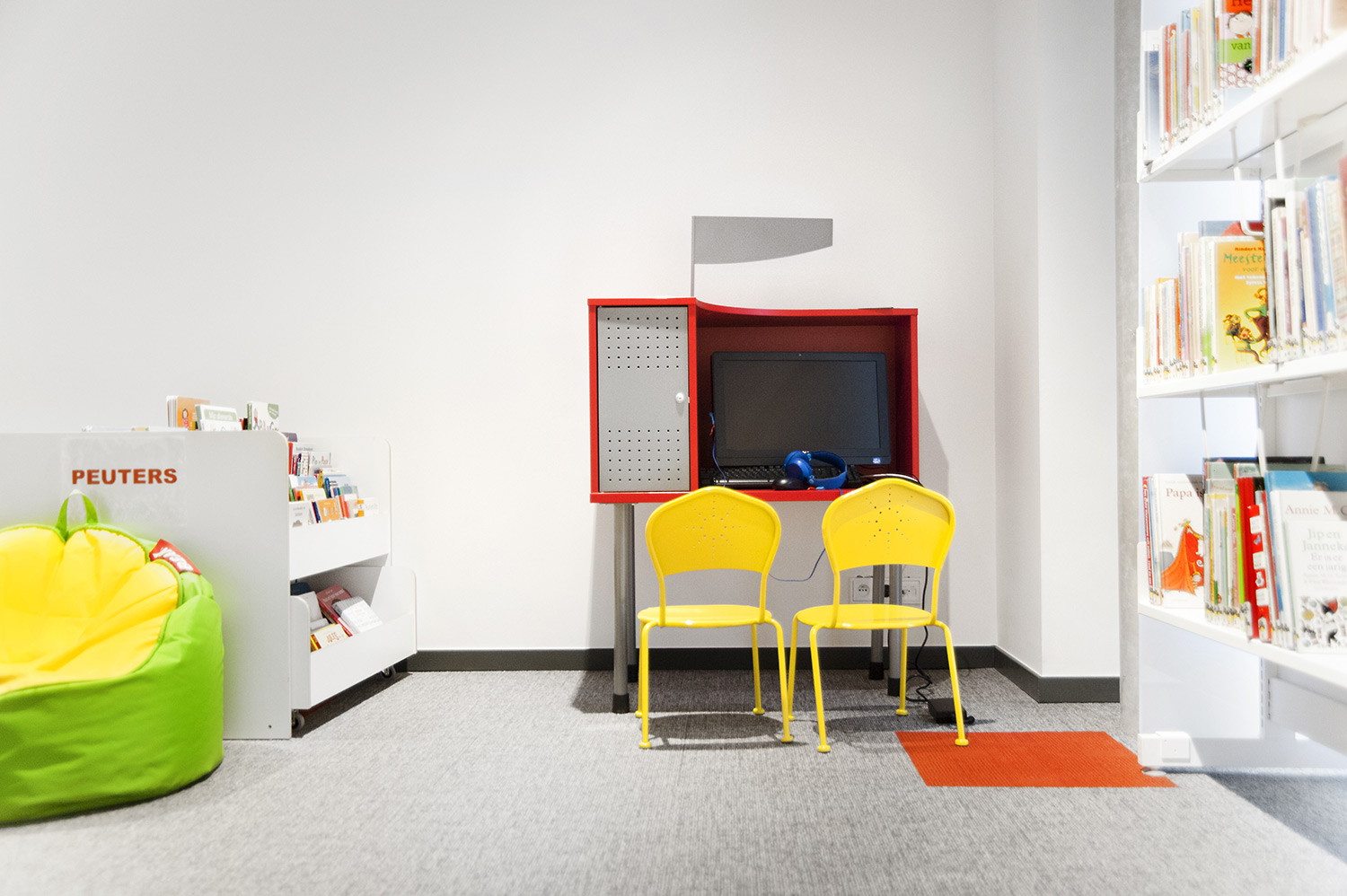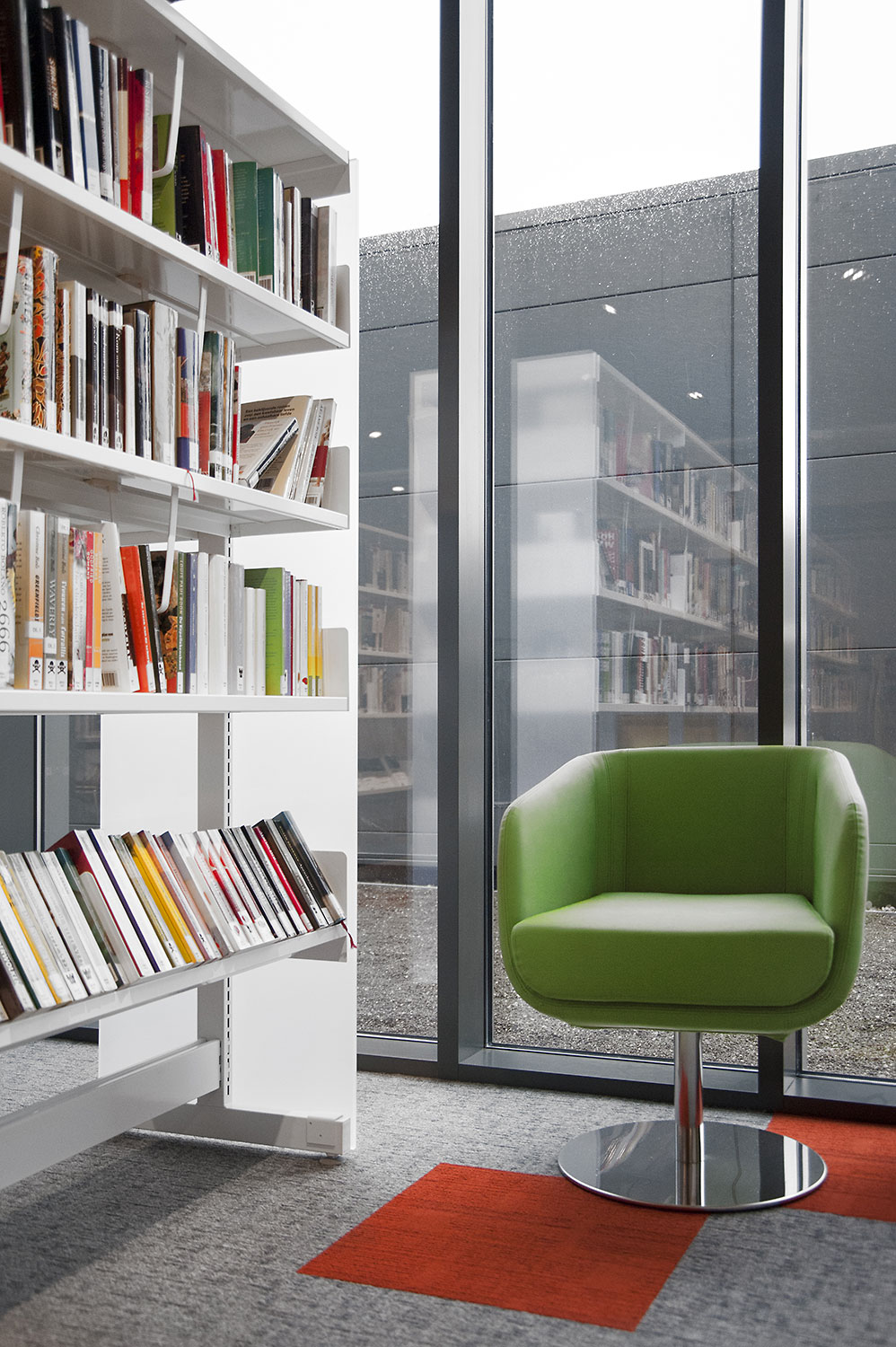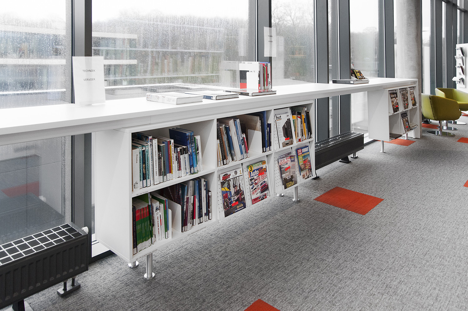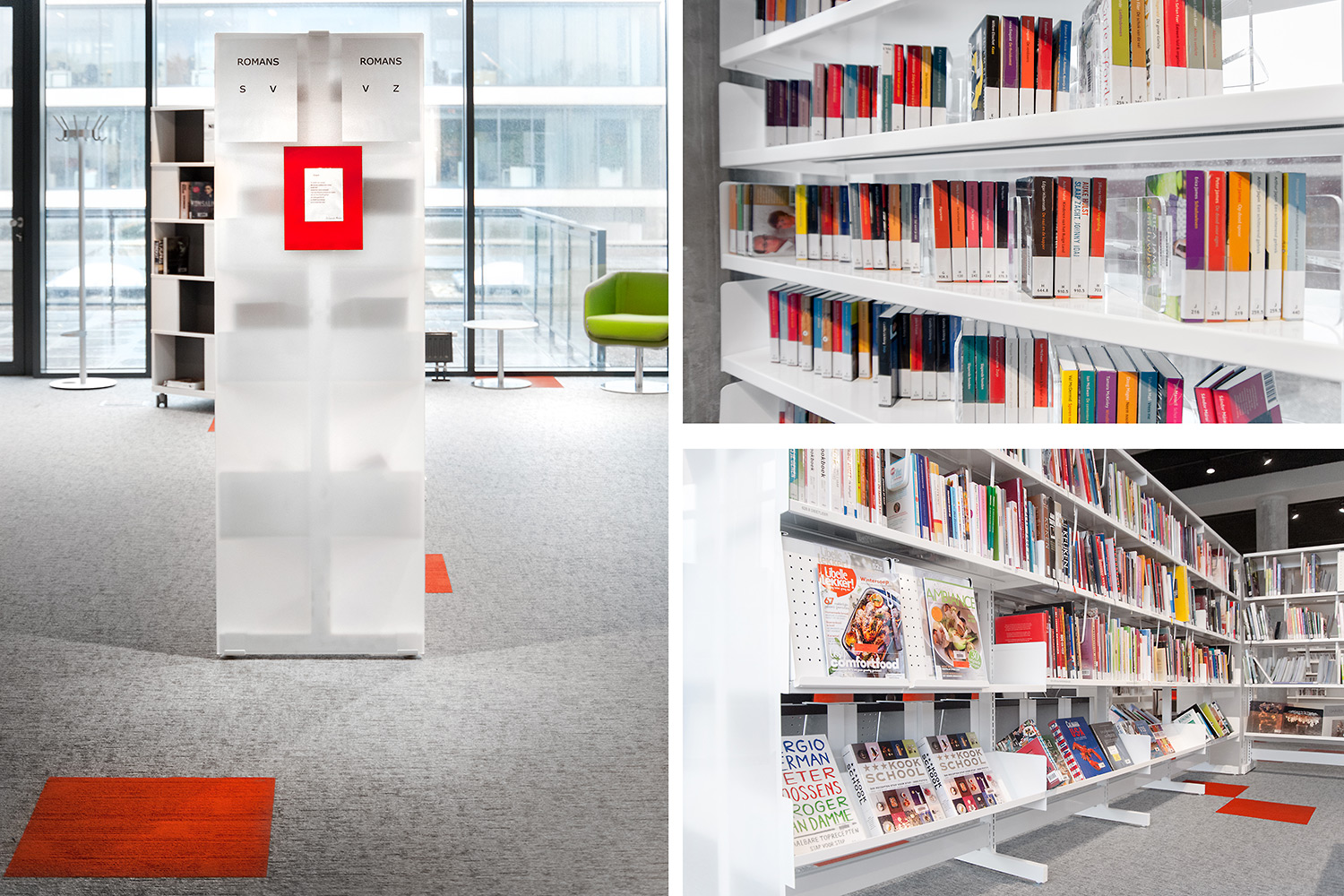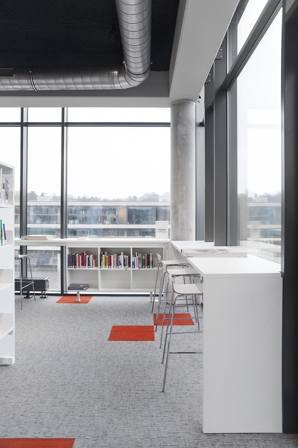 Speciale aandacht ging uit naar een ergonomische rekinvulling, de hoek voor de allerkleinsten en voldoende zit-, lees- en werkplaatsen. Het zwarte plafond contrasteert mooi met het wit meubilair, dat door zijn beperkte hoogte en strak design de ruimte overzichtelijk vorm geeft.