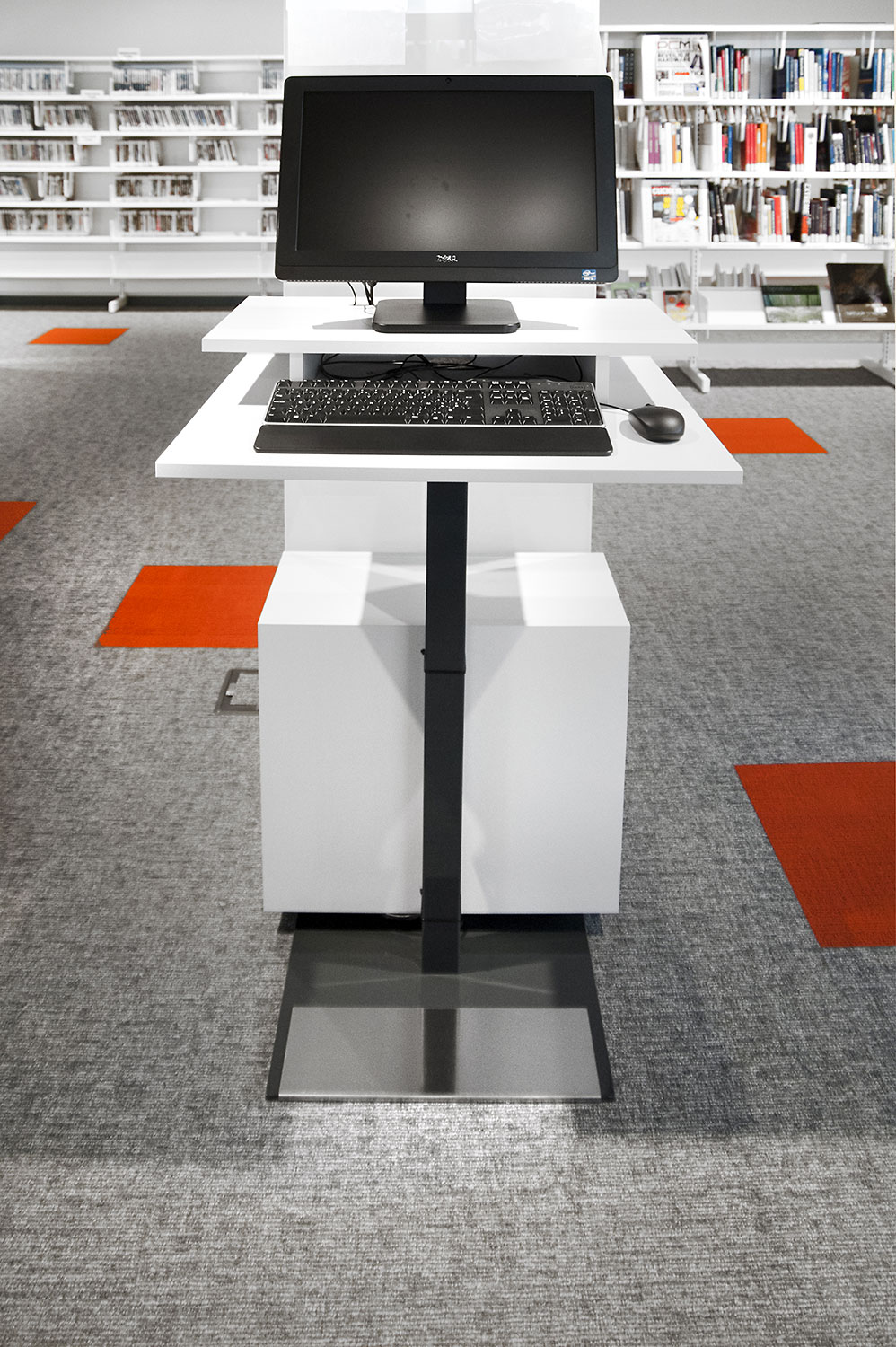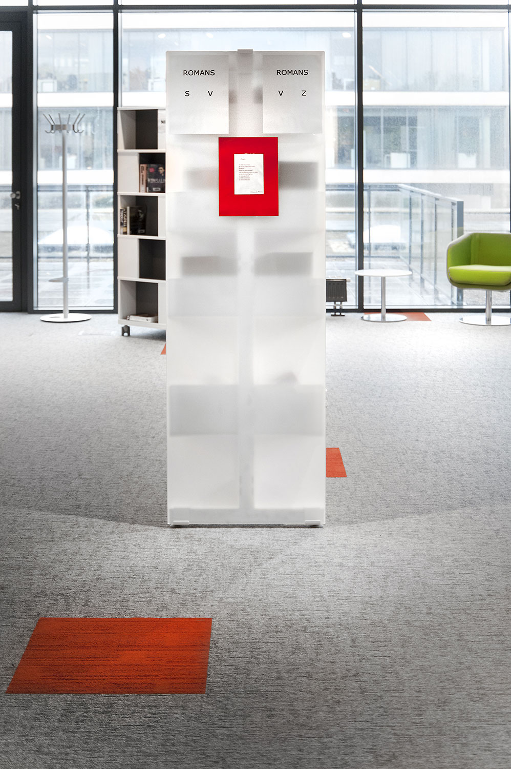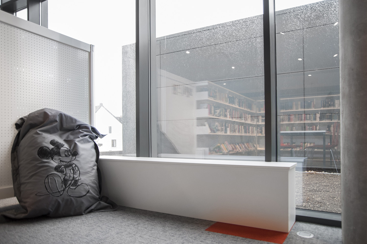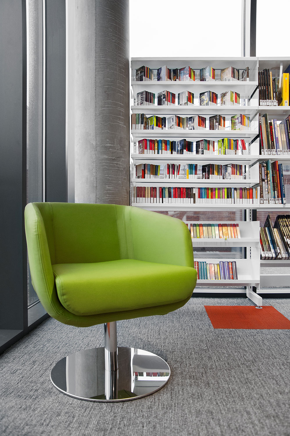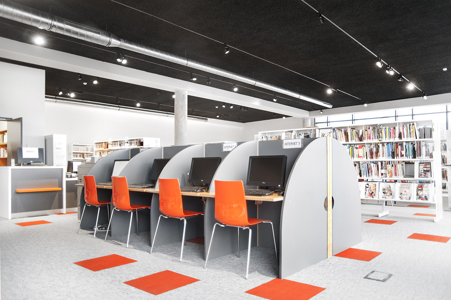 Speciale aandacht ging uit naar een ergonomische rekinvulling, de hoek voor de allerkleinsten en voldoende zit-, lees- en werkplaatsen. Het zwarte plafond contrasteert mooi met het wit meubilair, dat door zijn beperkte hoogte en strak design de ruimte overzichtelijk vorm geeft.